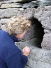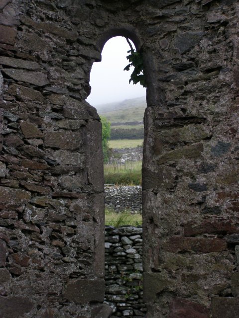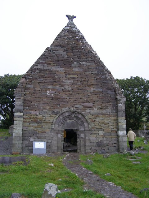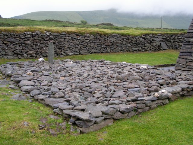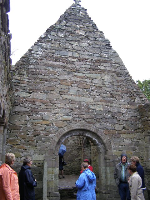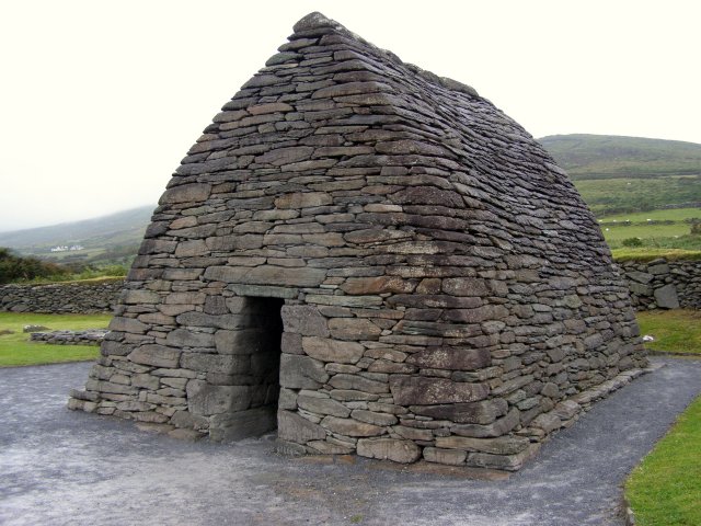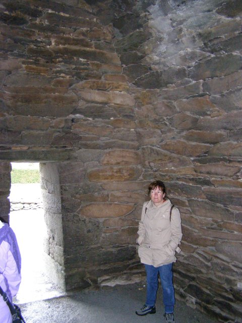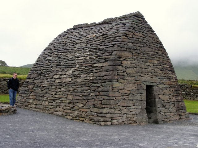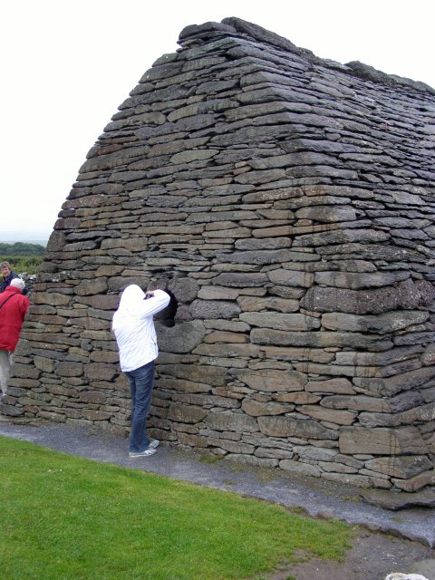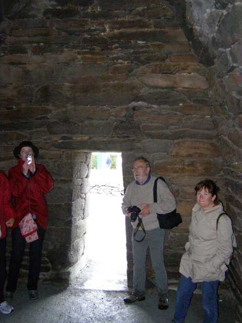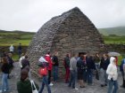Als we bij het Gallarus Oratory komen krijgen we eerst een dia voorstelling te zien. Het Gallarus Oratory werd gebouwd tussen de 6de en 7de eeuw na Christus en is de best bewaarde vroeg christelijke kerk in Ierland. Door de stenen onder een bepaalde hoek op elkaar te stapelen, is dit bouwwerk waterdicht, zonder dat er mortel of metselwerk aan te pas komt. Aan een kant west kant is een opening (deur) en aan de andere oost kant is een kleine smalle opening (raam).