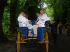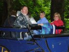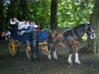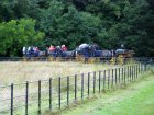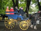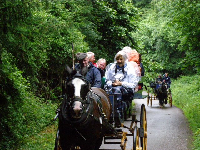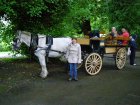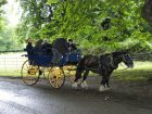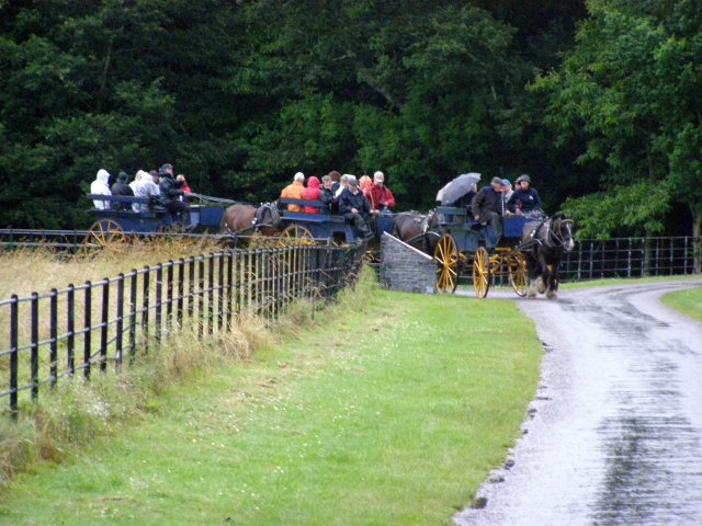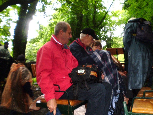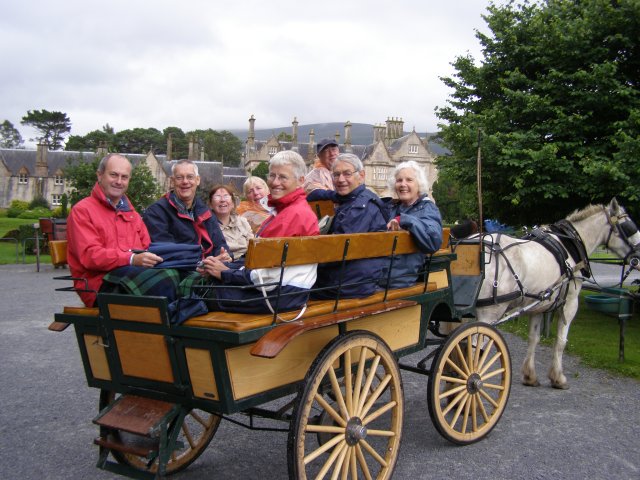Dan lopen we naar de koetsjes. We hebben 4 koetsen. Even verdelen over de koetsen. Het paard wat onze koets trekt heet Silver. We hebben dekens over onze benen en we kunnen lekker onze handen eronder stoppen. Zo worden we toch niet te nat en lekker warm is het. Af en toe paraplu open en zo gaan we op weg. Onze koets heeft er een goede vaart in. Co (van Piet) zegt: hadden we maar gegokt we hadden zeker gewonnen. En ja hoor wij halen met ons paard Silver iedereen in. Het is een mooie route jammer dat het nog regende. Onder de bomen moeten we ons af en toe bukken zodat we geen takken in het gezicht kregen. Er wordt verteld over het meer (Loch Laene) waar we langs rijden.