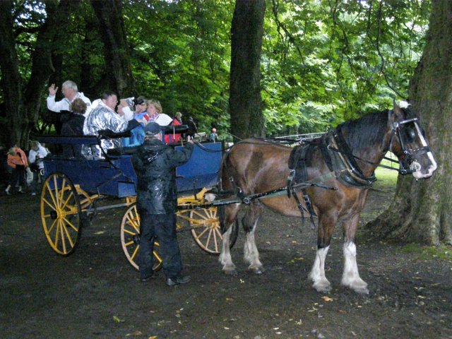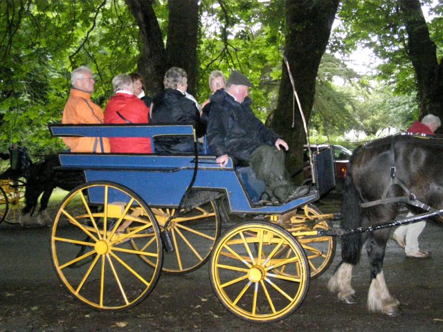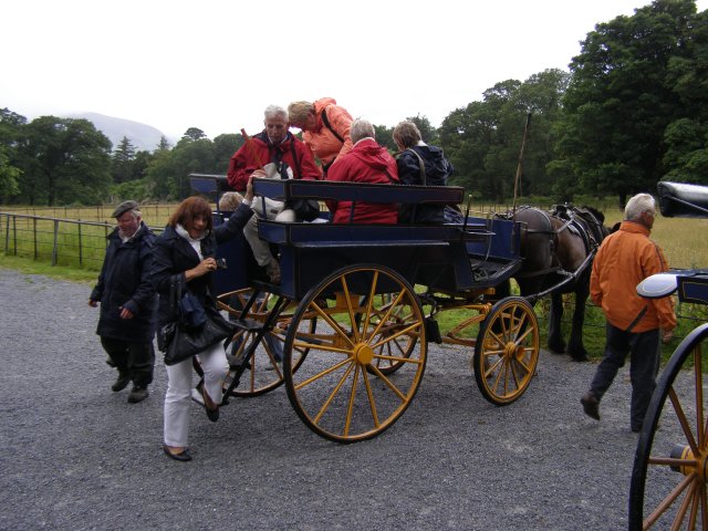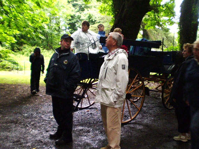 Dan rijden we rustig verder. We rijden naar het Killarney National Park waar we weer een uitzicht hebben over de drie meren van gisteren. Dan komen we aan in Killarney, dit is de toeristische trekpleister van Kerry gelegen in de schoot van het National Park. Het is een schilderachtig stadje. We kunnen tot 11.30 uur rondwandelen. We verzamelen ons dan waar we zijn uitgestapt. Hier komen dan ook de koetsjes waar we mee gaan rondrijden. Het begint hard te regenen. Trees geeft aan de koetsiers aan dat we even willen wachten tot de ergste regen voorbij is. Toen wij 25 jaar geleden trouwden was het heet.