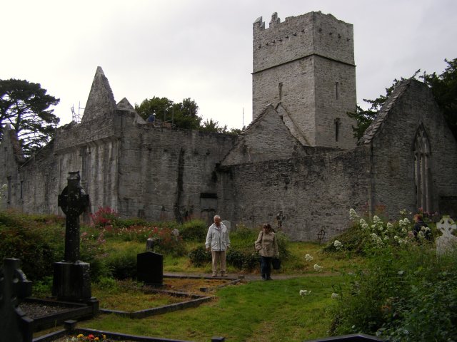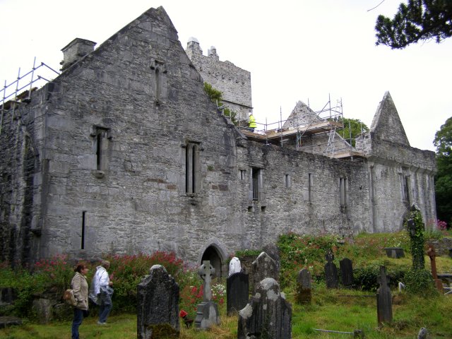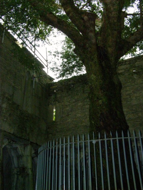 Bij Muckross Friary stappen we even uit. Eerst even foto’s maken van de koetsjes en paarden en hun medereizigers. Muckross Friary, is een ruïne van de abdij met een begraafplaats eromheen, deze ruïne mag je helemaal bezoeken, zelfs de overgebleven bovenruimtes. Het is in 1653 door Cromwells troepen vernield. Momenteel zijn ze de abdij aan het restaureren. Het blijkt als men over de begraafplaats hier nog regelmatig mensen worden begraven. Terwijl het een oud kerkhof en veel graven er verwaarloosd uitzien. Maar alle graven blijven hier voor altijd en eeuwig liggen. Hoe ze er ook uit zien. Terug bij de koetsen stappen we in en gaan verder.