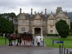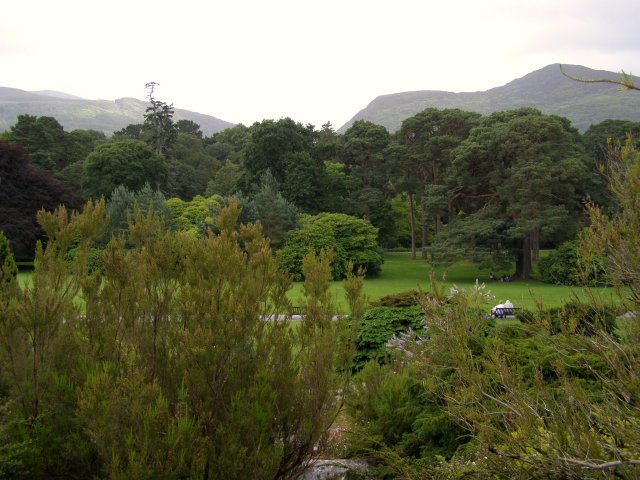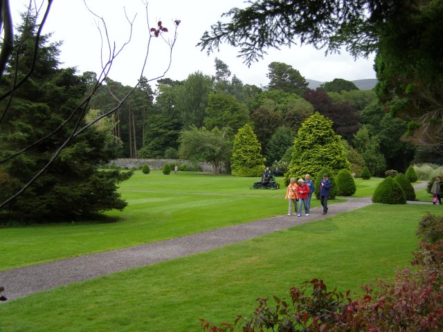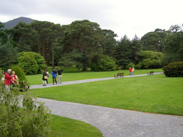 We rijden dan verder naar Muckross House. Dit huis heeft 365 ramen en 52 schoorstenen. Het ziet er prachtig uit van buiten. Eerst word er een pauze ingelast om iets te eten. Even door de tuin wandelen en dan verzamelen voor de rondleiding. Het huis werd in 1843 gebouwd en mocht heel wat belangrijke gasten ontvangen, waaronder in 1861 Queen Victoria van Engeland. Wat van de lokale bevolking een hele financiële inspanning eiste. Ongelooflijk wat men heeft verbouwd zodat Queen Victoria hier kon overnachten. Ze bleef maar 2 nachten. Haar logeerkamer is nog intact gebleven. Wij bezochten het van boven tot onder maar mochten spijtig genoeg geen foto’s nemen in het huis. In de kelderverdieping zijn de keuken en de bedienden verblijven gevestigd. Er hangt een hele reeks belletjes, uit elke kamer in het huis één. De bedienden wisten aan de klank te herkennen naar waar zij geroepen werden. Hierna hebben we nog tijd om even door de tuin van het Muckross House wandelen. De tuin is aangelegd om Queen Victoria te imponeren tijdens haar verblijf. Hier staan lekker ruikende rozen. Mels plukt een roos voor Toos. Echte Engelse rozen. Er wordt volop in de tuin gewerkt. Maar ja, je wilt ook graag de tuin er mooi laten uitzien. Verdorde bloemen en planten kan dan niet. 15.00 uur terug naar de bus.
