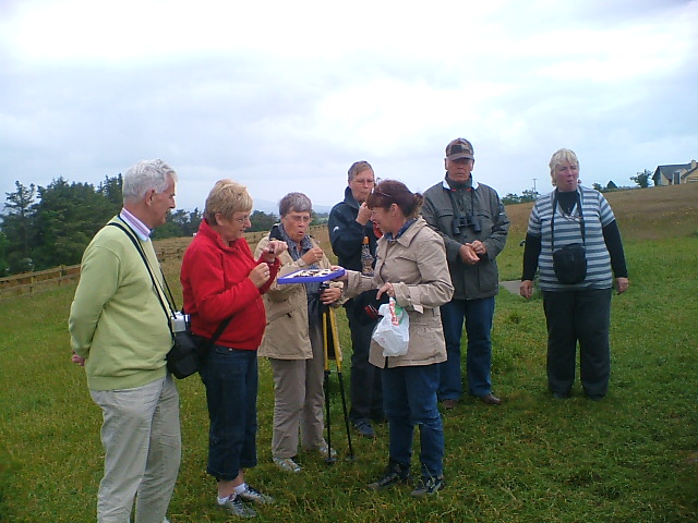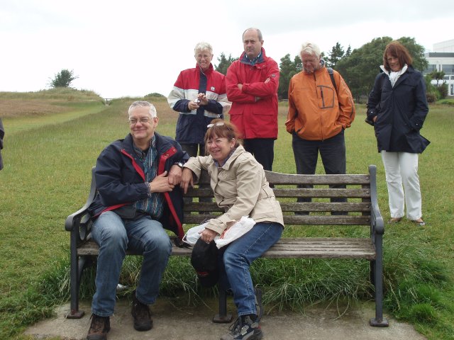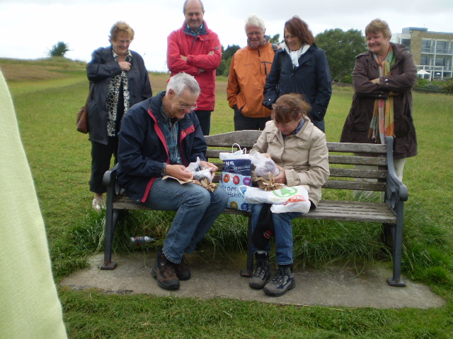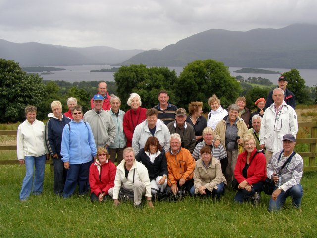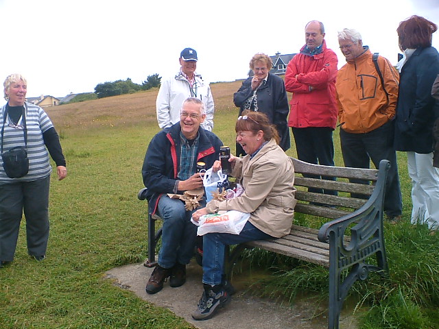 Dan gaan we verder. Mels en Toos dachten dat ze terug gingen naar Sneem. Maar er was nog een verrassing voor hun. Ze stopten op een plaatsje waar een bankje stond. Hier moesten ze plaats nemen en bijna iedereen nam een foto van hun. Met op de achtergrond de mooie natuur van Ierland. We werden toen door Joke toegesproken namens de hele groep. Als verrassing kregen we nog een zak met cadeaus. Hierin bleek voor ieder een mok te zitten en voor elk 1 blik Guinness. Nou toen moesten Toos en Mels even slikken. Dit was echt te. Maar, zij hadden ook aan hun medereizigers gedacht. Enkele dagen geleden hadden ze al een doos bonbons gekocht. Hiervan werd gedeeld na de mooie woorden van Joke en de cadeaus van de hele groep. Trees vertelde dat ze die dag op stap was geest voor de cadeaus. Hopende dat wij ze niet al gekocht hadden. Kennelijk heeft iedereen ons de afgelopen week in de gaten gehouden. Even door Trees nog een groepsfoto laten maken. Nu zijn we toch bij elkaar en de achtergrond is mooi.