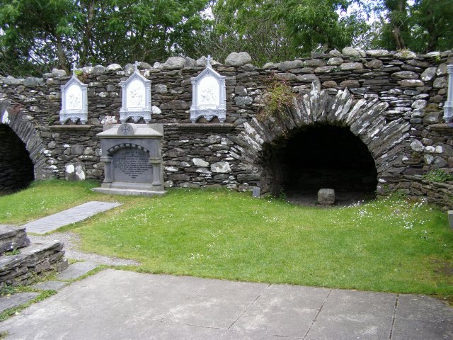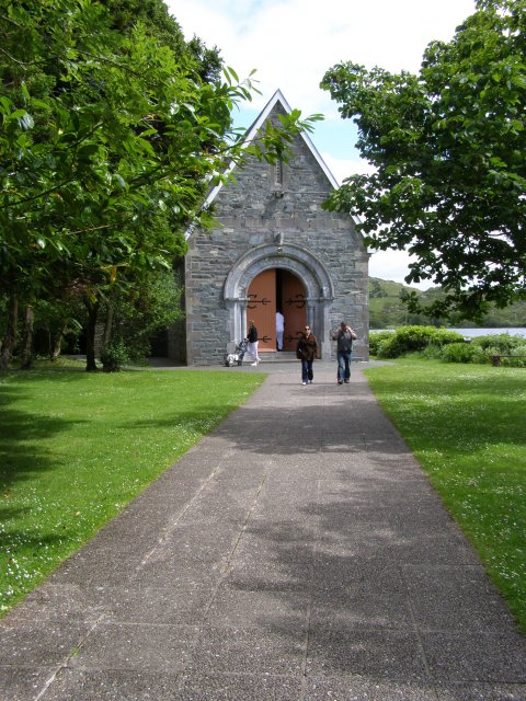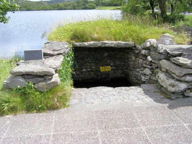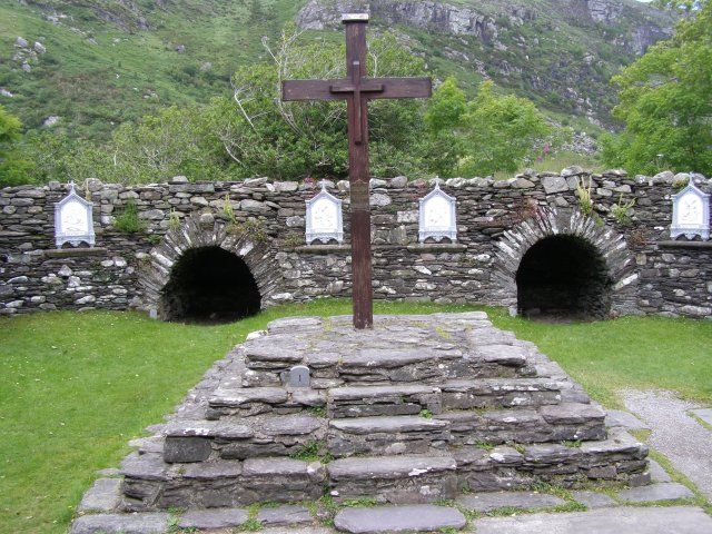 We maken bij Gougane Barra een tussenstop om te eten. Mels en Toos wandelen eerst naar het kerkje. Het is een klein kapelletje. St. Fin-Barr’s kapelletje. Als we hier verder wandelen, vinden we een omringde (stenen muur) kruisweg (foto 33 en 34) in de buitenlucht. Net voor dat we het hek uitlopen zien we een bron waar mensen flessen vullen met het bron water. We lopen terug naar het restaurant waar iedereen zich weer bij de bus verzameld.