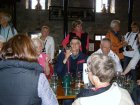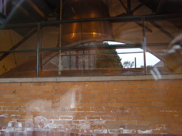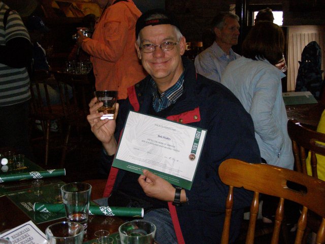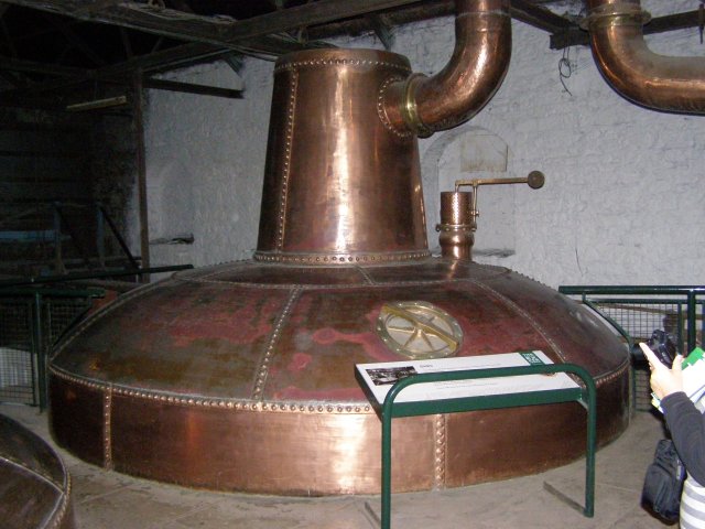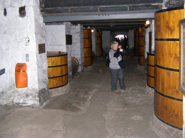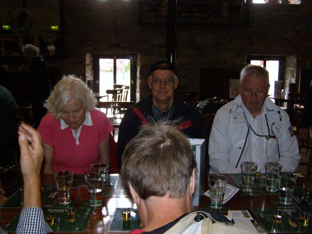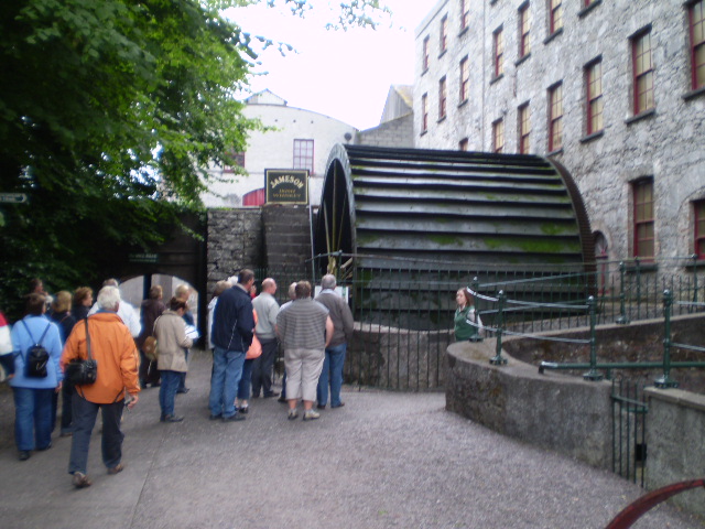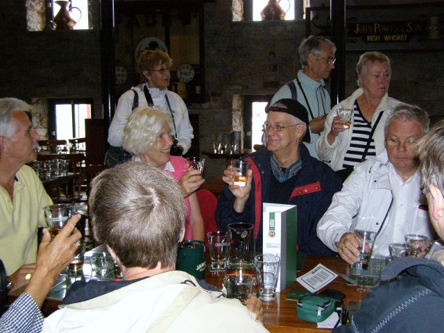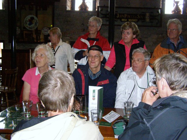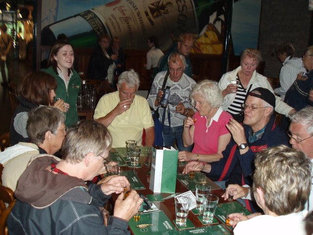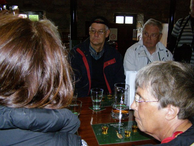 We krijgen hier eerst een film te zien en daarna krijgen we een rondleiding over het terrein waar vroeger de Whiskey werd gemaakt. We zien de grootste distilleerketel ter wereld ( foto 63), het 160 jaar oude waterrad (foto 56) en de oorspronkelijke gebouwen van de distilleerderij. Na de rondleiding worden 8 vrijwilligers gevraagd om mee te doen aan het proeven van Whisky. 5 dames (Marijke, Elly, Ria, Coby en Marja) en 3 heren (Daan, Hans en Mels). Deze acht personen mochten plaatsnemen aan een tafeltje en hadden toen ieder 3 glaasjes Whiskey voor zich staan. (Amerikaanse, Ierse en Schotse) Men kreeg te horen in welk glaasje welke Whiskey zat. Proeven en met water naspoelen. Later werd hun gevraagd welke Whiskey men het lekkerste vond. Na afloop kreeg men een certificaat (foto 79) waarop staat dat Mels Huijbers een gekwalificeerd Whiskey proever is. Ieder kreeg nog een glas Whikey van het huis en als men dit niet wilde kon men sinaasappelsap krijgen. Even door de winkel lopen waar men nog enkele dure flessen wijn kan zien en kopen.