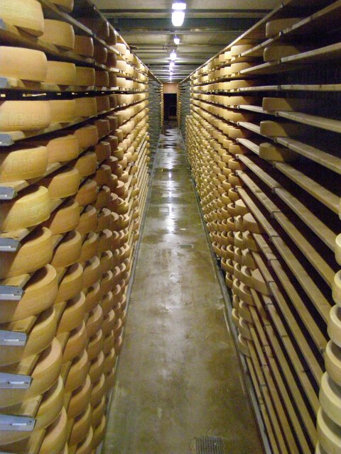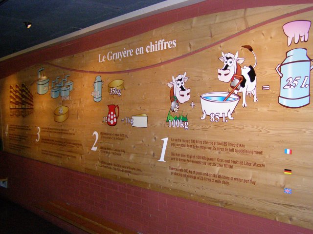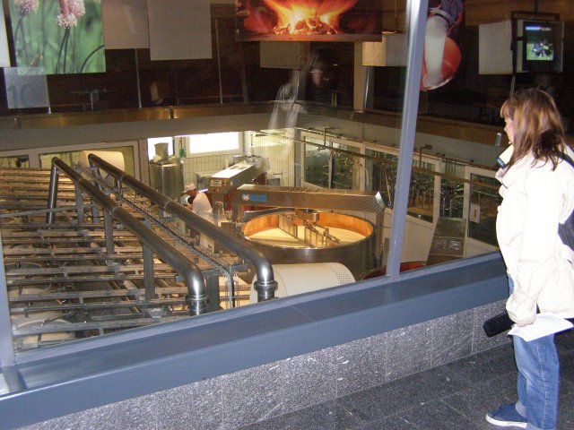 We rijden rustig richting Gruyères. Miep (Tom Tom) wijst ons goed de weg. Als we bij de kaasfabriek komen staat er een Nederlandse bus. Er is royaal parkeerplaats en als we naar binnen lopen komt de reuk van kaas ons al tegemoet. We melden ons bij de balie en krijgen uitleg hoe het geregeld is. We hebben een kortingskaartje (€ 2,00) en hoeven nu maar € 12,00 te betalen. Tevens krijgen we een informatieblad in het Nederlands en een pakje met 3 stukjes Gruyère kaas. De stukje waren van verschillende leeftijden dat ze gerijpt zijn. 6, 8 en 12 maanden. Ook krijgen we uitleg hoe we met een apparaat, wat eruit ziet als een afstandbediening, om moeten gaan. Hiermee kun je teksten luisteren in verschillende talen tijdens de route wat men loopt.