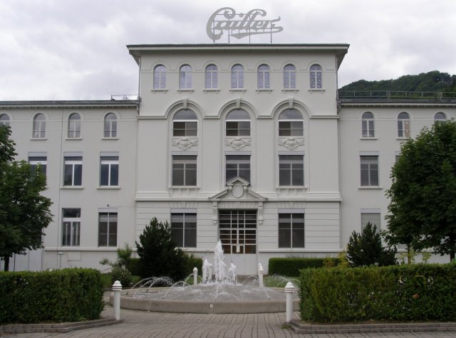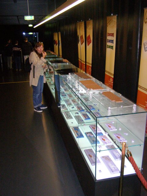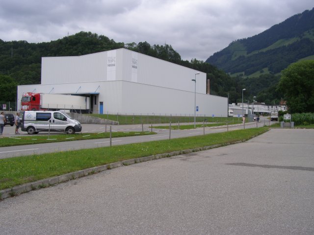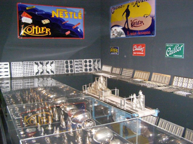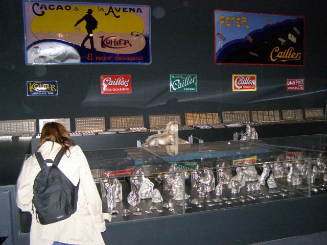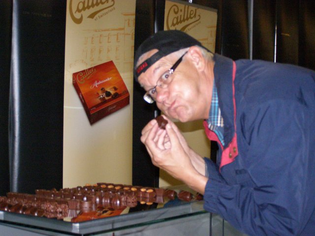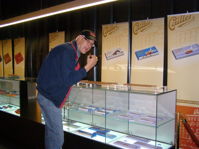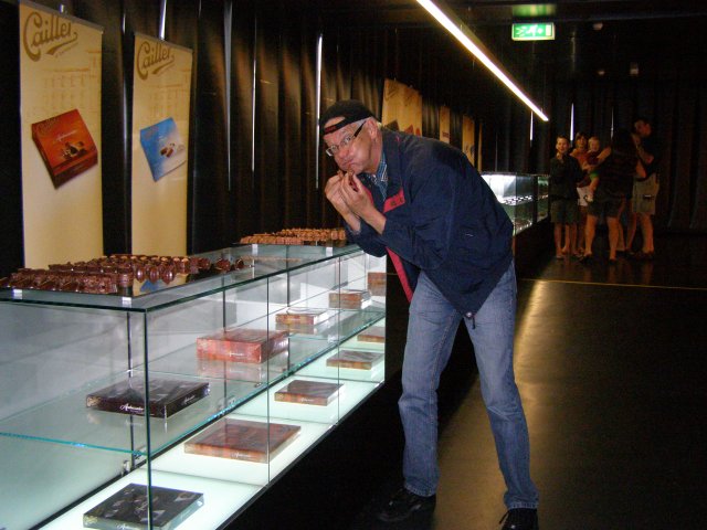 Als we terug zijn bij de auto rijden we naar de chocoladefabriek in Broc. Ze hadden ons verteld dat we naar de Chocoladefabriek Cailler zouden moeten rijden. Maar toen we in Broc kwamen zagen we alleen bordje waar Nestlé opstaat. Na even zoeken en geen bordje Cailler te vinden besluiten we om de bordjes Nestlé te volgen. Als we de chocoladefabriek van Nestlé zien staat daar ook het bordje van Cailler. We lopen naar de chocoladefabriek en melden ons bij de balie. Hier staat een receptioniste die ook Nederlands spreekt. Zij verteld ons waar we alles kunnen zien. Van oorsprong is het de Cailler fabriek (1898) maar is later overgegaan naar Nestlé. We kunnen op ons eigen tempo de route volgen. Men ziet mallen van chocolade figuren, zakken met noten en het verhaal hoe men chocolade maakt. Tevens kan men aan potjes ruiken waar noten en chocolade melange in zit. Dan komen we bij het hoogte punt van de route: chocolade proeven. Als je Mels ziet dan glundert hij helemaal. Hier kwam hij voor naar de chocolade fabriek. Hij proeft ze allemaal. De een nog heerlijker dan de andere. Tablet chocolade en bonbons. Ze liggen er allemaal. Dit was lekker: zegt Mels. Dan lopen we richting uitgang en komen door de winkel. Ja, dit hoort er natuurlijk ook bij. Chocolade kopen. Na we er verschillende soorten tabletten hebben uitgezocht en we betaald hebben lopen we terug naar de auto.