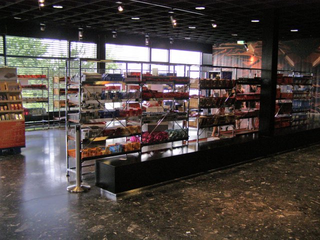 We lopen terug naar de auto en besluiten langzaam naar het hotel terug te rijden. We besluiten om nog bij een supermarkt aan te gaan om nog enkele dingen te kopen. Zoals broodjes etc. voor de komende dagen. We gaan dan niet uit eten s’avonds maar eten dan een broodje op de hotelkamer. We besluiten om bij de COOP supermarkt aan te gaan. Het is een groot gebouw waar allerlei winkel in gehuisvest zijn. We besluiten de supermarkt in te lopen. We vinden er broodjes, lekkere rabarber/aardbeien jam, fles wodka en een souvenir: een mok van Zwitserland.