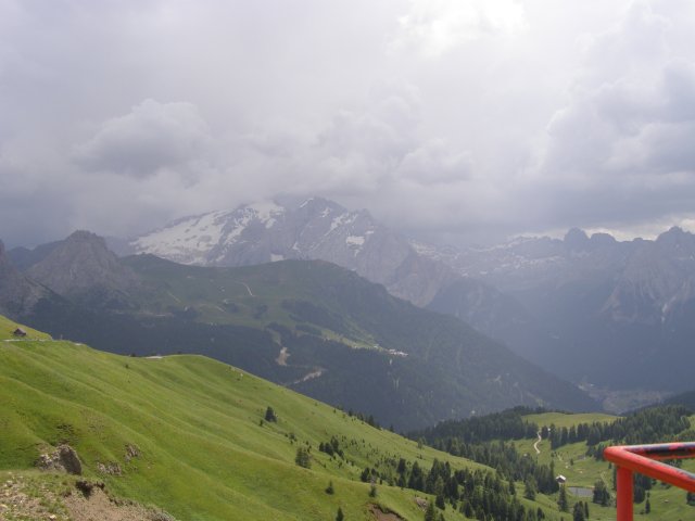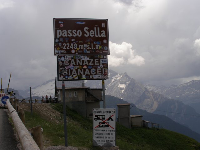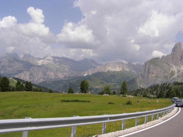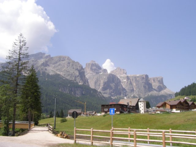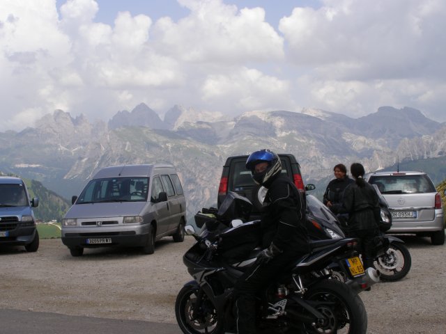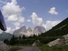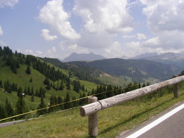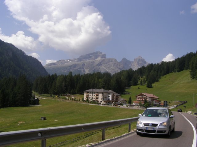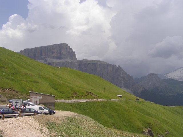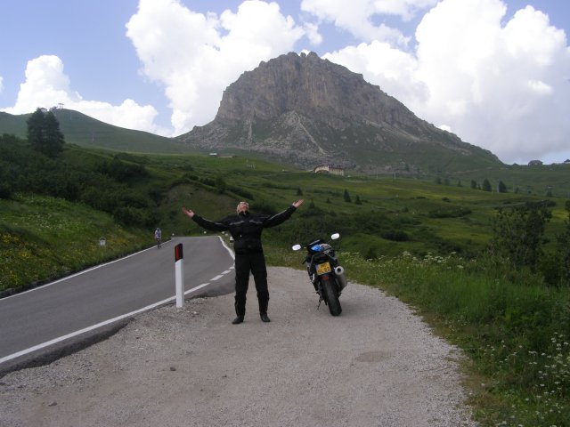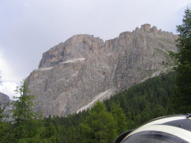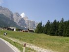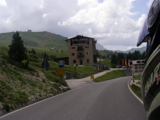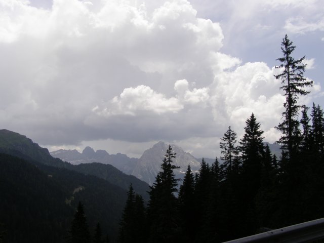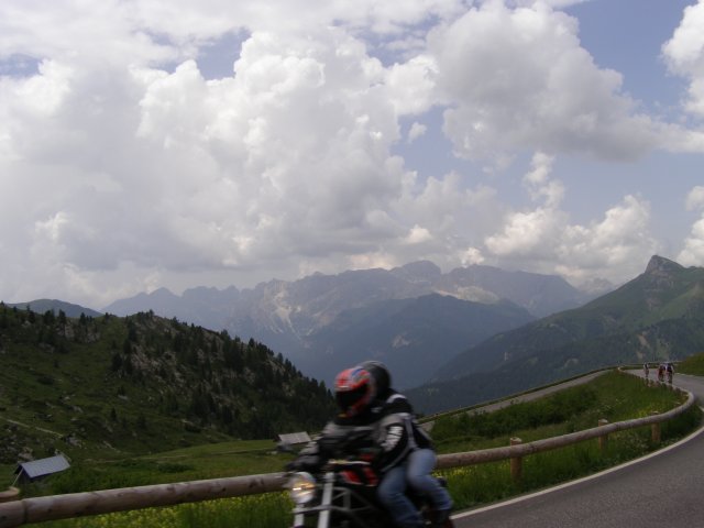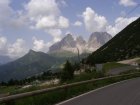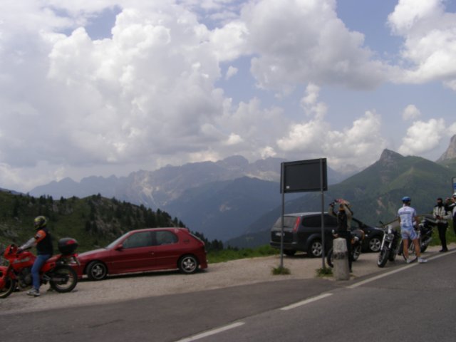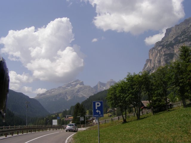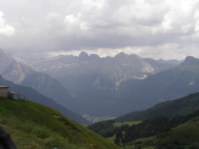 Om 12.00 uur zijn we in Arabba. Hier is Mels in 2004 met Ron geweest toen ze met de motors zijn gaan toeren. Het is er warm en we besluiten nog enkele flesjes fris te kopen. Men heeft ze koel staan en Toos neemt er direct 4 mee. Lekker fris. Als we genoeg hebben gerust en gedronken rijden we verder. We gaan de pas Passo Pordoi omhoog. Als we achterom kijken is het uitzicht mooi en Mels besluit om te stoppen om foto’s te maken. We staan goed en wel langs de motor en het begint te regenen. Niet hard en we genieten even van de frisse druppels op ons. Maar het gaat steeds harder regen en doen ons maar even de helm op. Zo staan we ongeveer een kwartiertje als we besluiten om toch maar door te rijden.