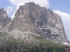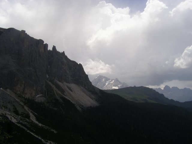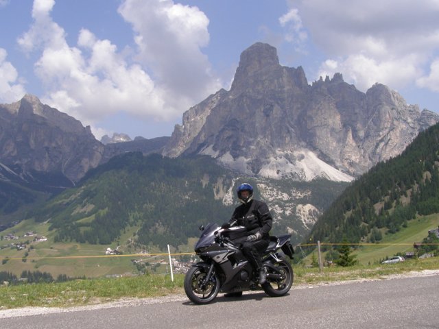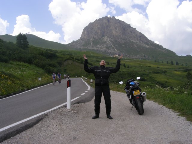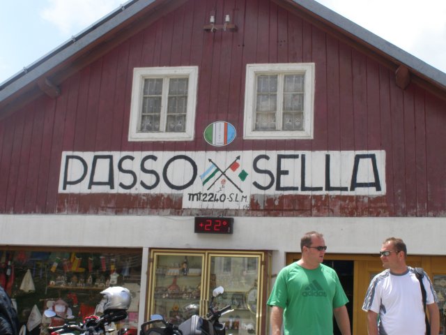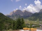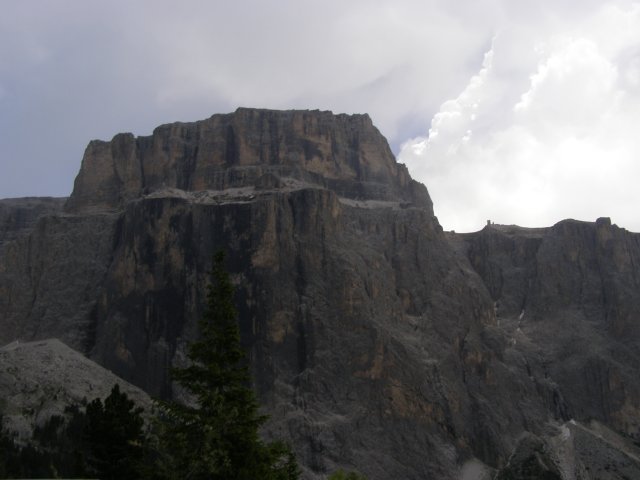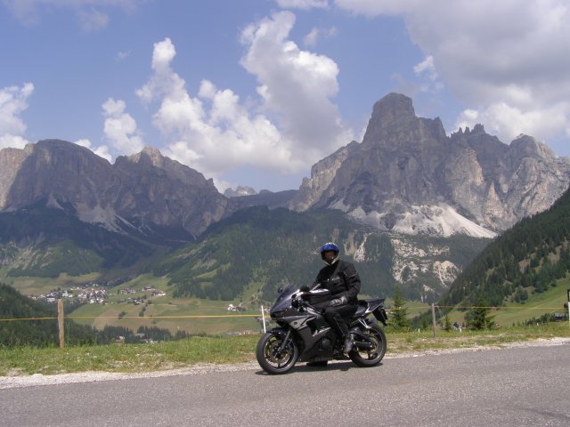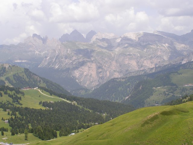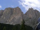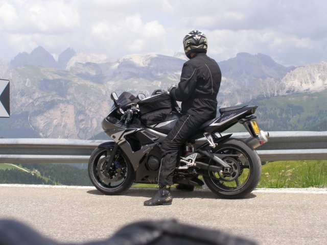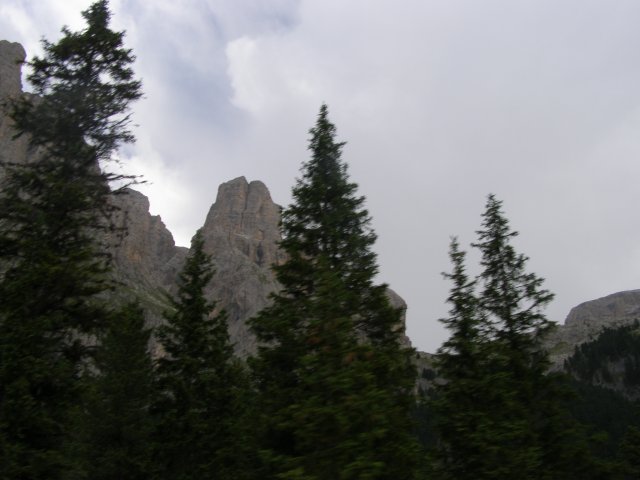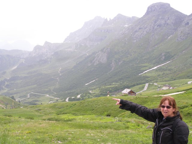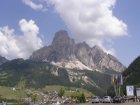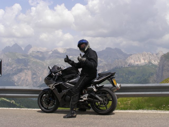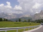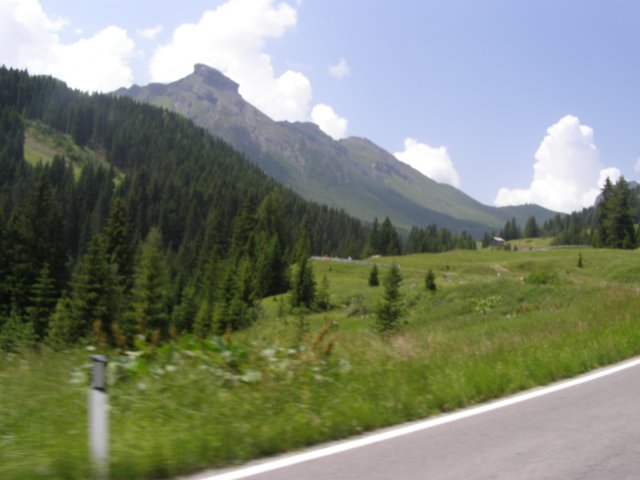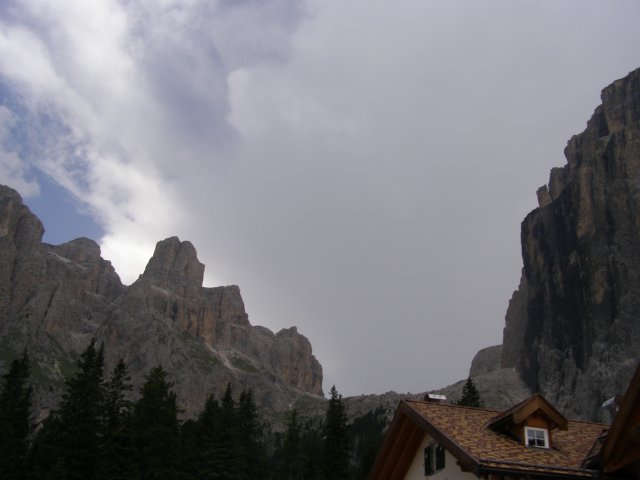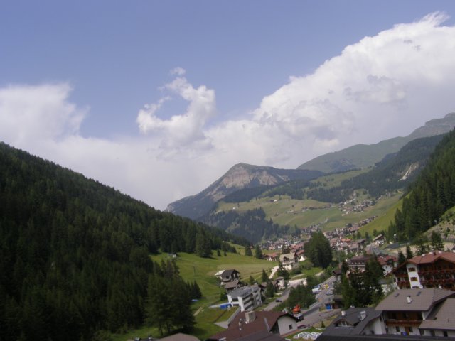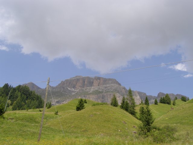 Om 12.00 uur zijn we in Arabba. Hier is Mels in 2004 met Ron geweest toen ze met de motors zijn gaan toeren. Het is er warm en we besluiten nog enkele flesjes fris te kopen. Men heeft ze koel staan en Toos neemt er direct 4 mee. Lekker fris. Als we genoeg hebben gerust en gedronken rijden we verder. We gaan de pas Passo Pordoi omhoog. Als we achterom kijken is het uitzicht mooi en Mels besluit om te stoppen om foto’s te maken. We staan goed en wel langs de motor en het begint te regenen. Niet hard en we genieten even van de frisse druppels op ons. Maar het gaat steeds harder regen en doen ons maar even de helm op. Zo staan we ongeveer een kwartiertje als we besluiten om toch maar door te rijden.