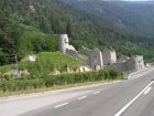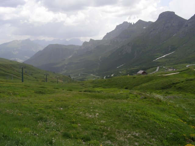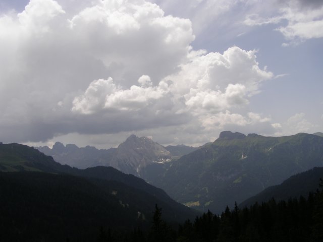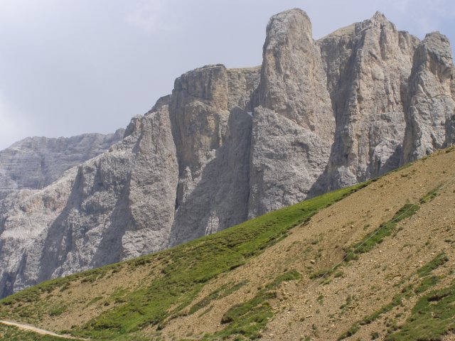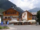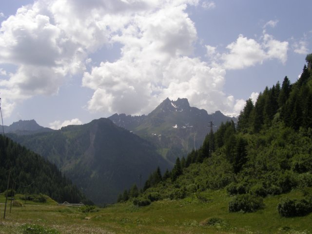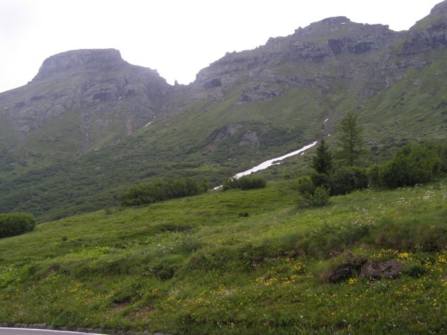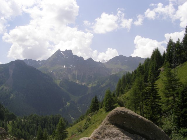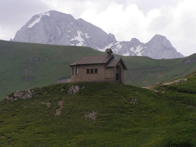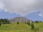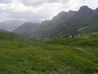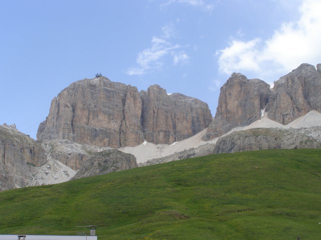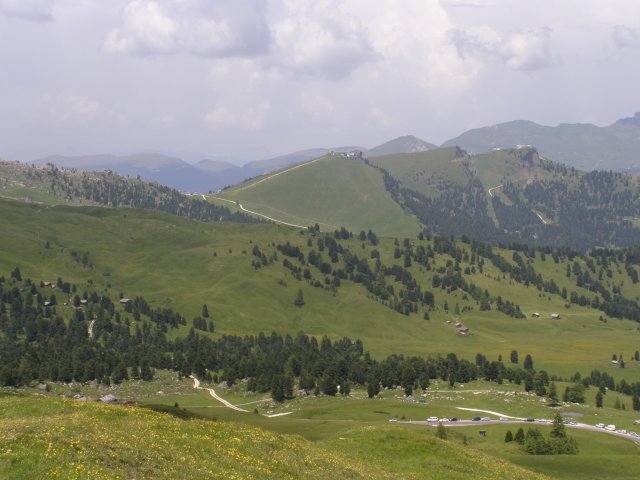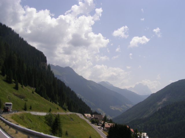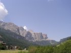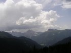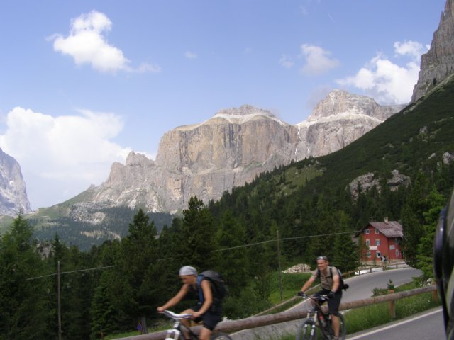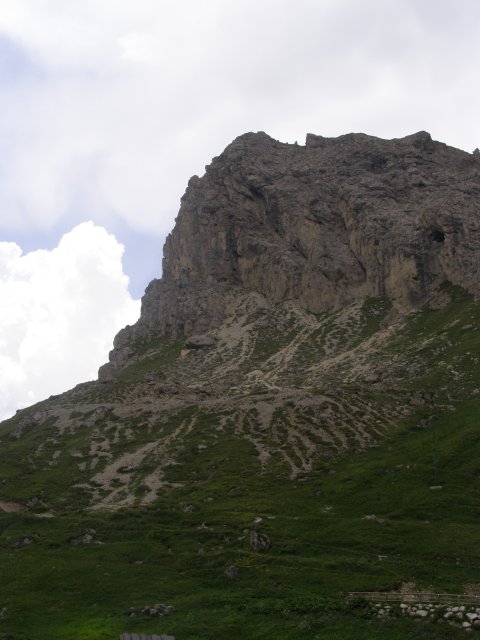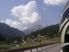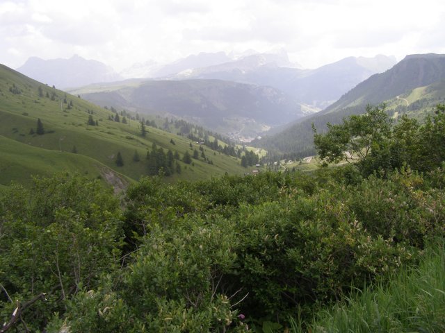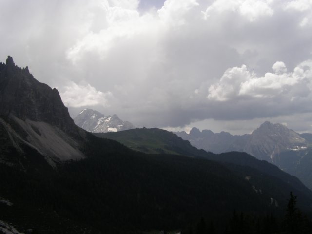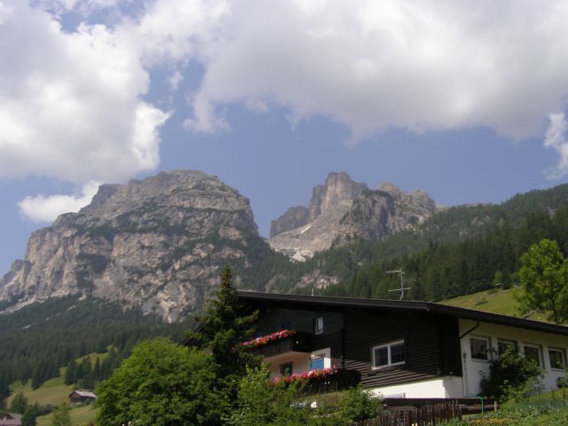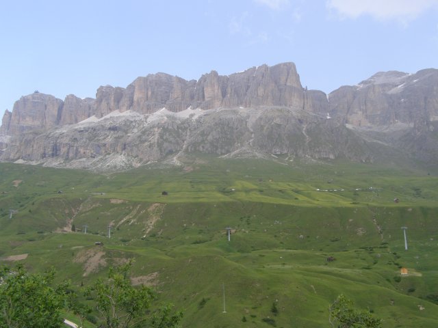 Om 12.00 uur zijn we in Arabba. Hier is Mels in 2004 met Ron geweest toen ze met de motors zijn gaan toeren. Het is er warm en we besluiten nog enkele flesjes fris te kopen. Men heeft ze koel staan en Toos neemt er direct 4 mee. Lekker fris. Als we genoeg hebben gerust en gedronken rijden we verder. We gaan de pas Passo Pordoi omhoog. Als we achterom kijken is het uitzicht mooi en Mels besluit om te stoppen om foto’s te maken. We staan goed en wel langs de motor en het begint te regenen. Niet hard en we genieten even van de frisse druppels op ons. Maar het gaat steeds harder regen en doen ons maar even de helm op. Zo staan we ongeveer een kwartiertje als we besluiten om toch maar door te rijden.