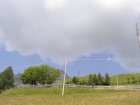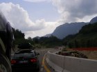 Langzaam om dat de banden op de motor eigenlijk niet geschikt zijn voor regenweer. Als we boven komen regent het niet. We kunnen zien, dat als we naar beneden kijken, dat waar we gestaan hebben nog regent.