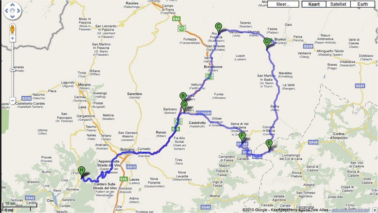 De Route: Vanuit Ronzone volg de borden naar Bolzano via Via Mendola dit is de weg SS42, deze blijven volgen tot in Bolzano. In Bolzano de SS12 volgen richting St. Moritz. Deze weg blijven volgen tot Brixen, in Neustift de afslag nemen naar Mühlbach de SS49. Deze weg blijven volgen tot St. Lorenzen vlakbij Bruneck. Ga hier de S244 op richting Longega, deze weg blijven volgen, deze komt o.a. door Badia en Stern. Volg de weg tot Arabba. In Arabba rechtsaf de SR48 op richting Passo Pordoi. Na plm 23 Km rechtsaf de SS242 volgen richting Passo Di Stella en Wölkenstein. Deze weg blijven volgen tot aan Waidbruck waar men linksaf de SS12 neemt richting Bolzano. In Bolzano de SS42 nemen de borden van Via Mendola volgen tot Ronzone.