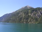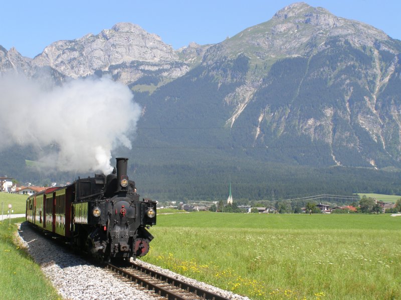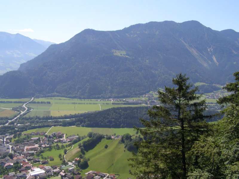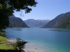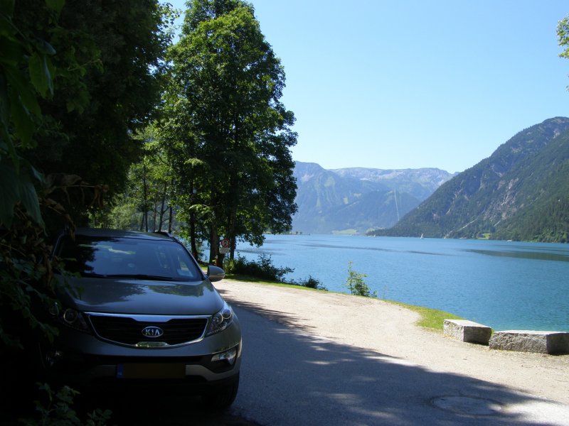 Eerst maar eens lekker naar de Achensee. Het meer ligt dertig kilometer ten noordoosten van Innsbruck, ten noorden van Jenbach dat in het Unterinntal ligt. Samen met het Achental vormt het de grens tussen het Karwendelgebergte in het westen en de Brandenberger Alpen in het oosten. Het meer, gelegen op een hoogte van 929 meter, heeft een oppervlakte van 6,8 km², bij een lengte van negen kilometer en een breedte van één kilometer. Het is daarmee het grootste meer in Tirol. Op het diepste punt is het meer 133 meter diep. Het meer werd oorspronkelijk naar het noorden ontwaterd via de Ache en de Isar. Sinds de bouw van een waterkrachtcentrale bij Jenbach in 1927 wordt het water echter hoofdzakelijk, via een hoogteverschil van 380 meter, in de Inn geleid. Als gevolg van de aangelegde stuwdam is de waterspiegel dusdanig verhoogd, dat het meer inmiddels een inhoud van 66 miljoen kubieke meter water heeft. We pakken alles in wat we mee willen nemen voor deze “rustdag”. Rustig rijden we naar de Achensee. En als we een parkeerplaatsje hebben gevonden gaan we ons een plekje zoeken waar we lekker kunnen gaan liggen. Dit hebben we snel gevonden. Deken, kussen en spullen om te eten en te drinken uit de auto en liggen. Het is heerlijk. Je komt hier echt tot rust ondanks de bedrijvigheid om je heen. We blijven hier lekker liggen tot 12.15 uur en besluiten dan om nog ergens naar toe te gaan vandaag.