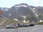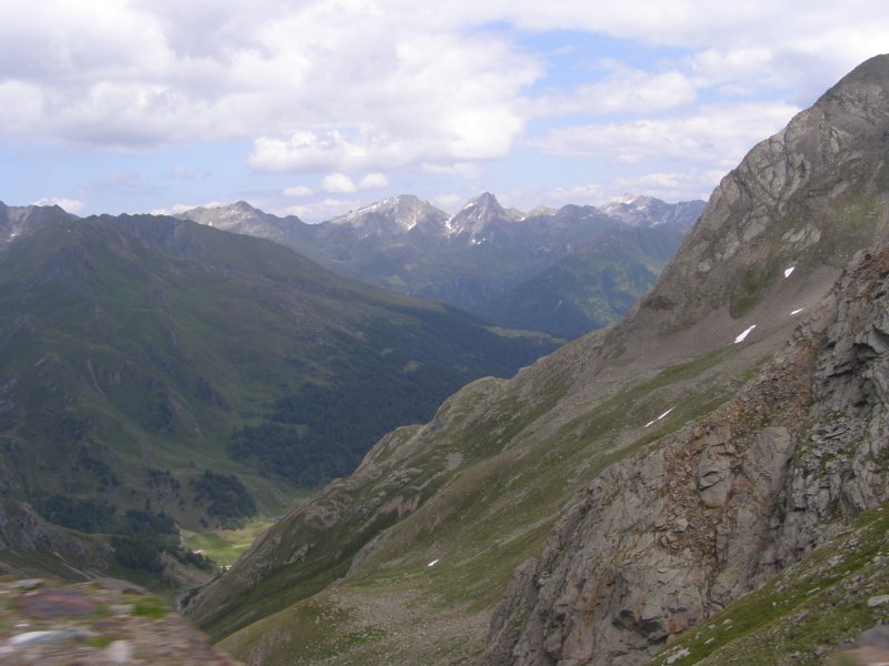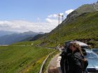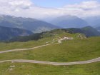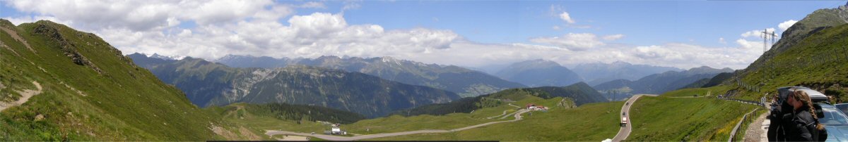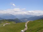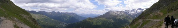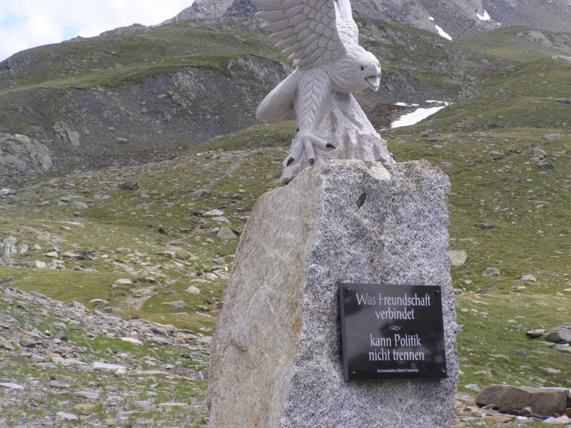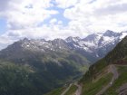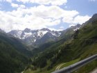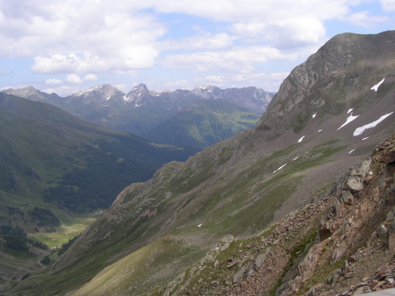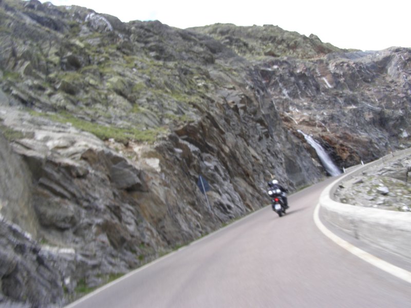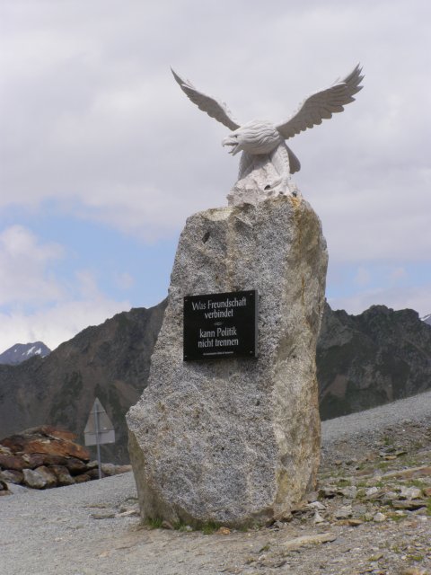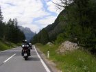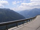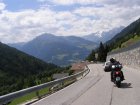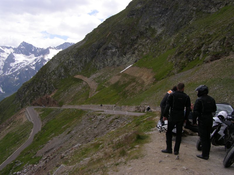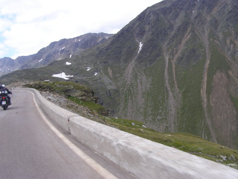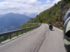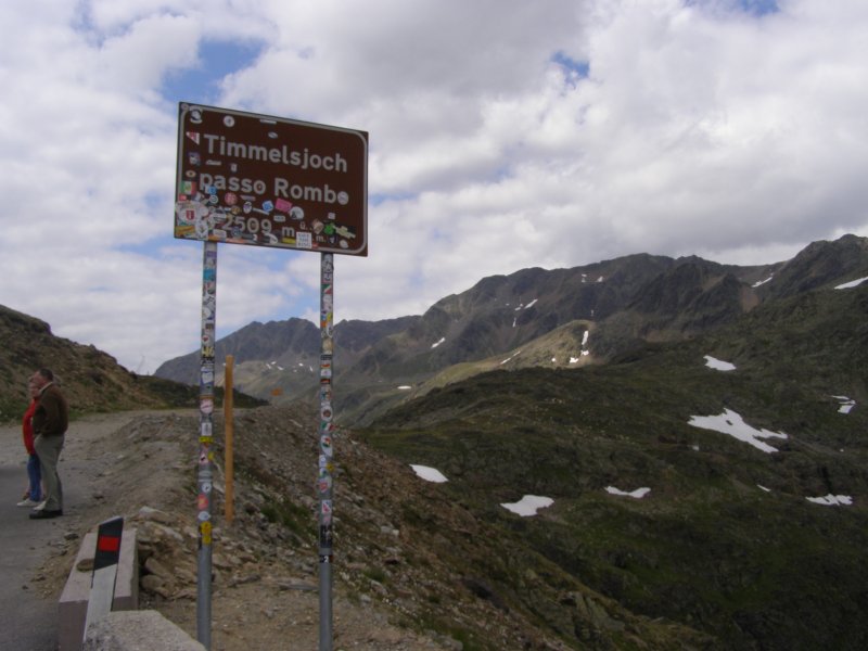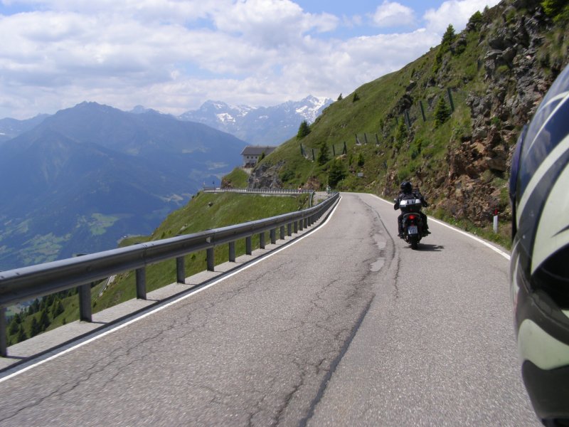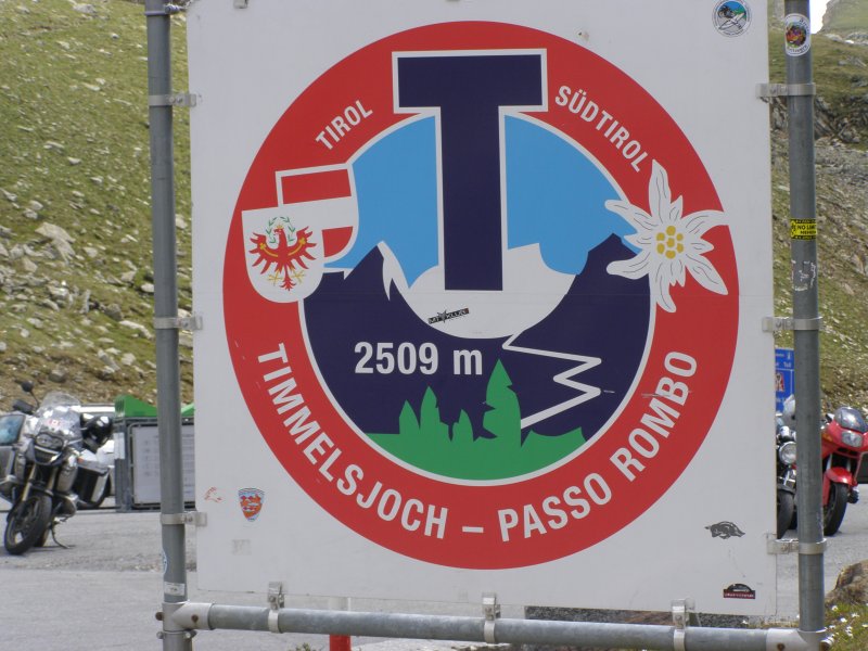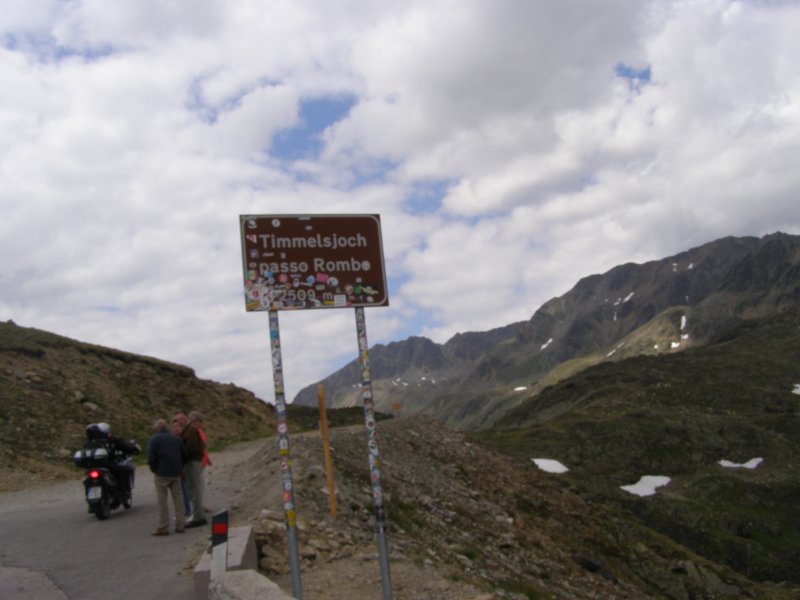 De Jaufenpas of, in het Italiaans, Passo di Monte Giovo is een bergpas in het Italiaanse Zuid-Tirol. De 2099 meter hoge pas verbindt het Passeiertal bij Sankt Leonhard in Passeier met het Wipptal bij Sterzing, dicht bij de Brennerpas. De bochtenrijke weg heeft twintig keerpunten en een totale lengte van 39 km. De Jaufenpas vormt de kortste verbinding tussen Meran en Sterzing en verbindt de Sarntaler met de Stubaier Alpen. Ten noorden van de pasweg liggen de hoge bergtoppen van de Ötztaler Alpen, ten zuiden die van de Sarntaler Alpen. Rondom de pas liggen de toppen van de Jaufenspitz (2483 meter) en de Saxner (2359 meter) en het brede Ratschingstal. Beneden in het dal was het erg warm en boven is het lekker koel. We houden de jas maar aan. Even wat eten en drinken en natuurlijk foto’s maken. Prachtig uitzicht. Praatje met andere motorrijders maken en helpen met foto’s maken van elkaar. Het zijn Duitsers, Italianen en Nederlanders waar we mee praten. De Nederlanders hebben een FJR.