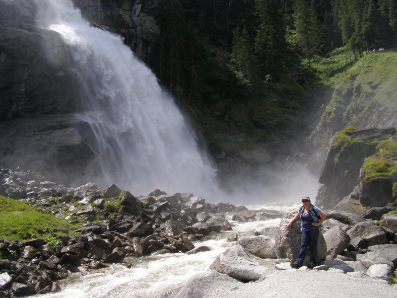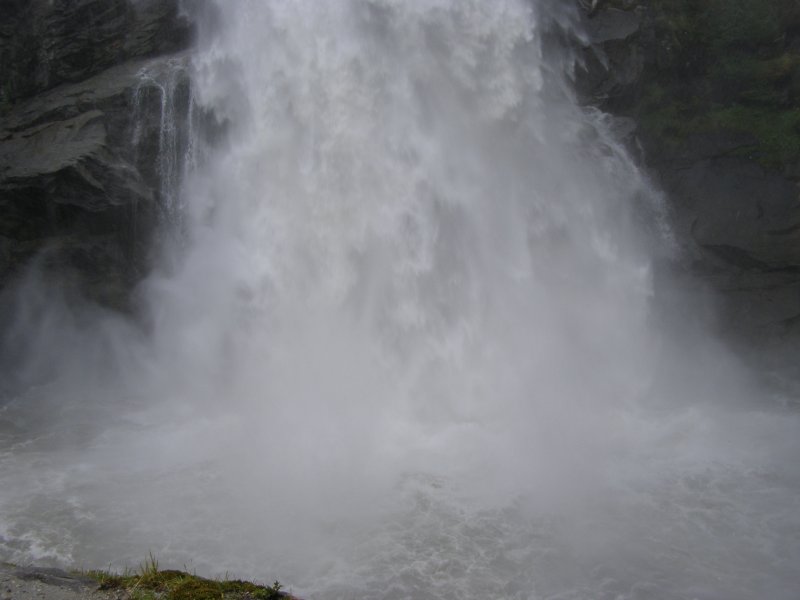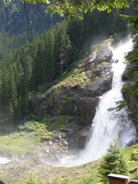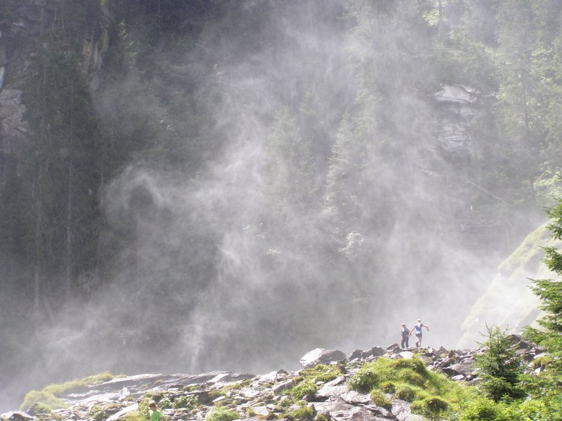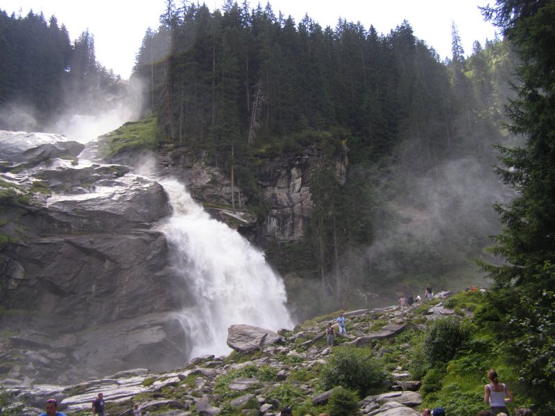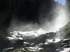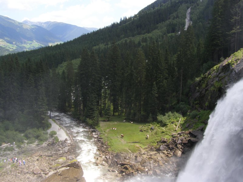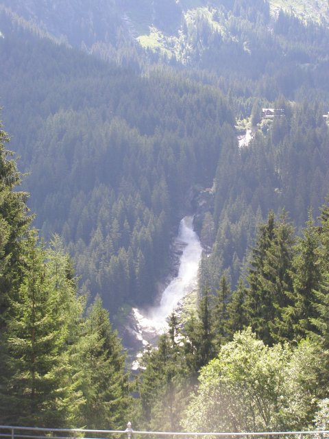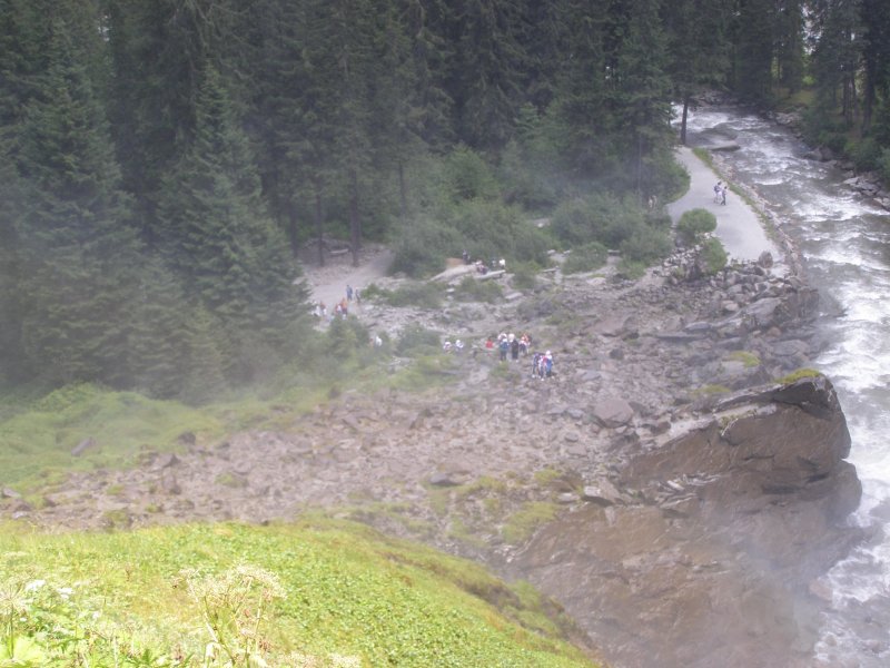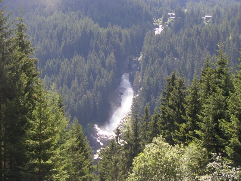We rijden via de Gerlospas en komen we bij de Krimmler watervallen. We zoek eerst eens een parkeerplaats. Als men hier de auto ergens wil parkeren kost het € 4,00 voor een hele dag. We pakken onze spullen mee en wandelen naar de waterval. De entree is € 2,50. Het is mooi weer vandaag. Het is een zonnige dag. De Krimmler Wasserfälle zijn met een totale hoogte van 380 meter de hoogste waterval van Europa. Ze liggen vlakbij het dorp Krimml in Oostenrijk in het nationale park Hohe Tauern. De waterval komt voort uit de Krimmler Ache die aan het einde van het hoog gelegen Krimmler Achendal in drie fases naar beneden stort. Daarna komt de Krimml uit in de Salzach die daarna in de Inn uitkomt die in de Donau uitmondt en uiteindelijk naar de Zwarte Zee stroomt. De bovenste fase heeft een val van 140 meter, de middelste van 100 meter en de laagste weer van 140 meter.