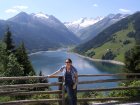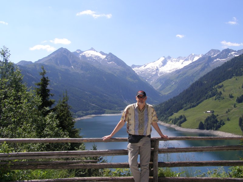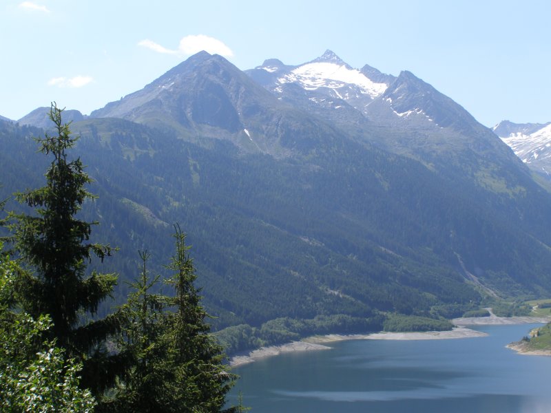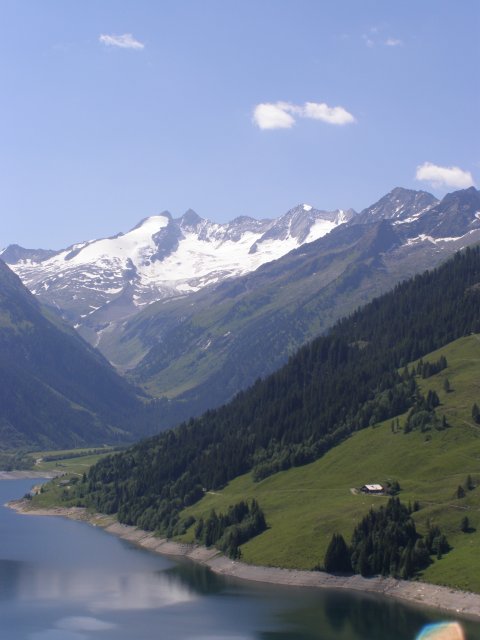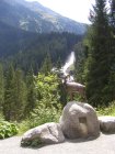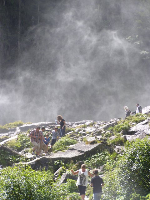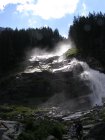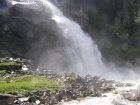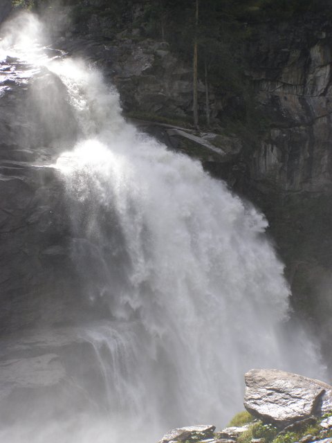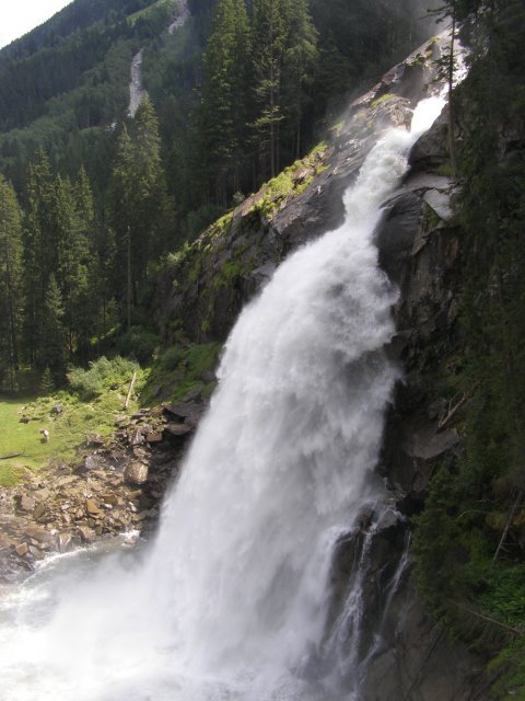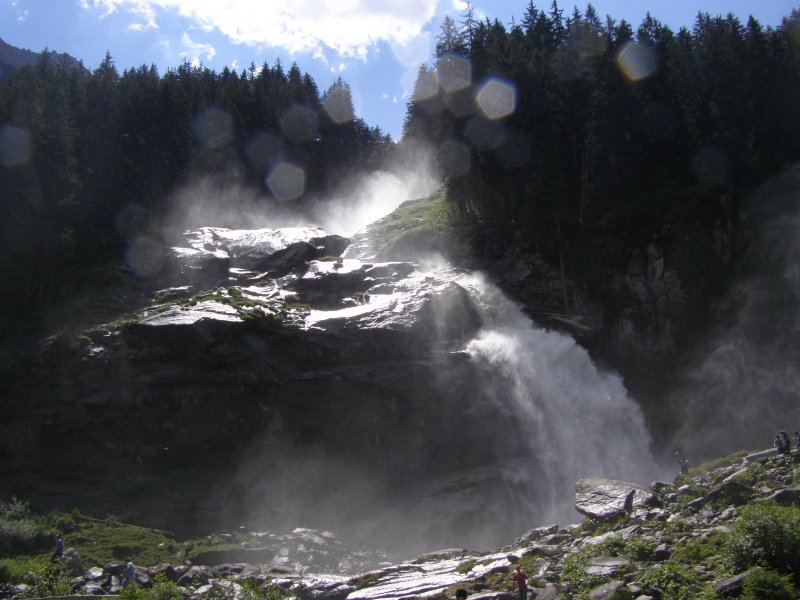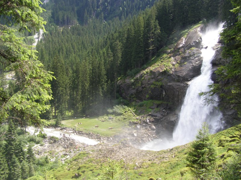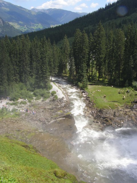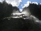 We rijden via de Gerlospas en komen we bij de Krimmler watervallen. We zoek eerst eens een parkeerplaats. Als men hier de auto ergens wil parkeren kost het € 4,00 voor een hele dag. We pakken onze spullen mee en wandelen naar de waterval. De entree is € 2,50. Het is mooi weer vandaag. Het is een zonnige dag. De Krimmler Wasserfälle zijn met een totale hoogte van 380 meter de hoogste waterval van Europa. Ze liggen vlakbij het dorp Krimml in Oostenrijk in het nationale park Hohe Tauern. De waterval komt voort uit de Krimmler Ache die aan het einde van het hoog gelegen Krimmler Achendal in drie fases naar beneden stort. Daarna komt de Krimml uit in de Salzach die daarna in de Inn uitkomt die in de Donau uitmondt en uiteindelijk naar de Zwarte Zee stroomt. De bovenste fase heeft een val van 140 meter, de middelste van 100 meter en de laagste weer van 140 meter.