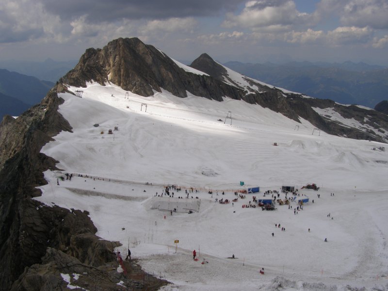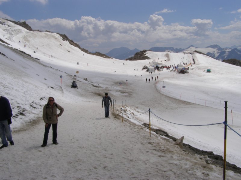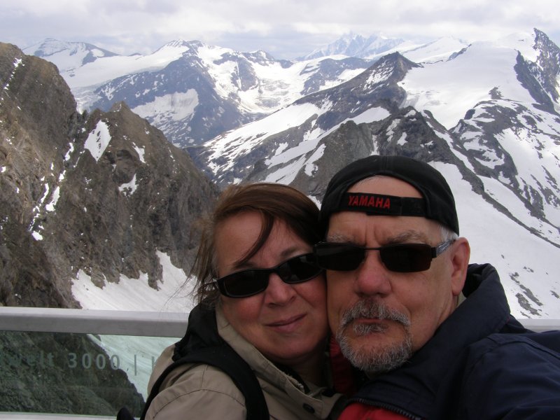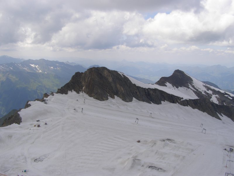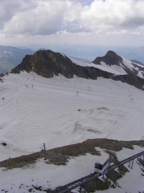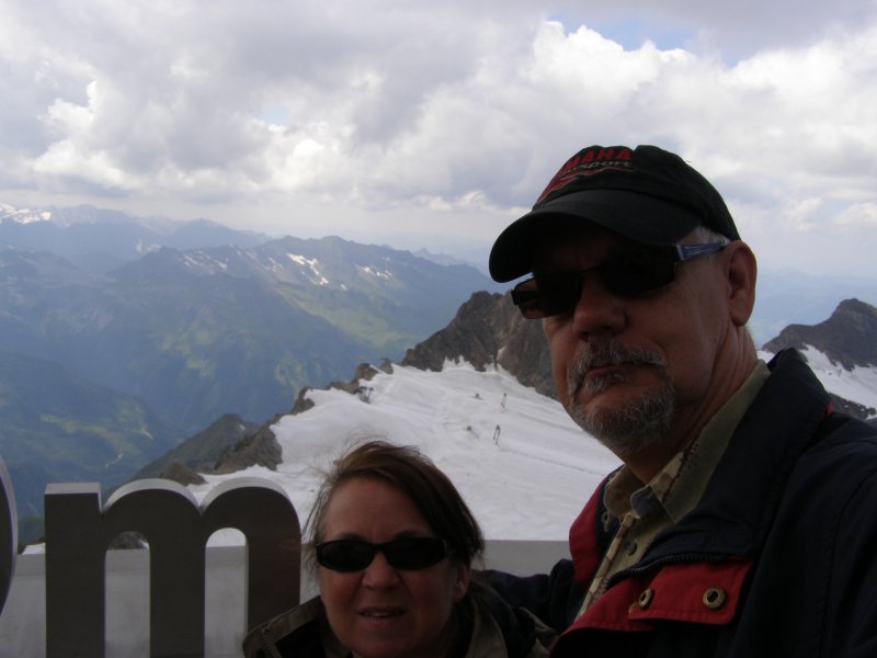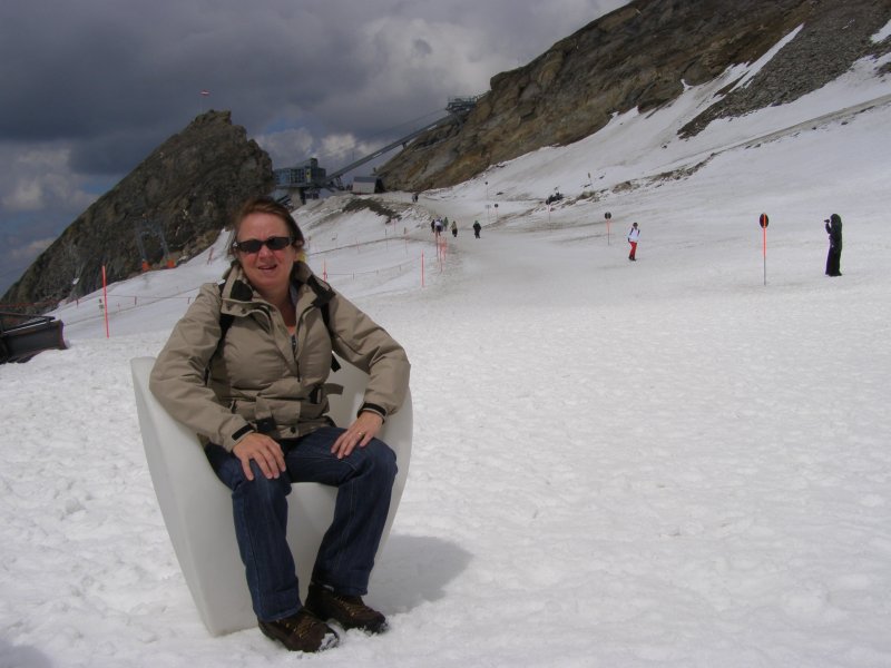 We kunnen van hieruit zelfs de Großclockner zien. We maken foto’s en eten en drinken hier nog iets. We kunnen via een pad omlaag bij de gletsjer komen. We besluiten naar beneden te gaan en ploeterend, (Toos 2 x vallen) komen we beneden aan. Mels kan het niet laten en moet even met sneeuwballen gooien. Als we beneden komen lopen over de gletsjer en maken foto’s. We lopen via de andere kant naar boven en hier kunnen we met een gondel weer bij het bergstation terecht. We gaan nog in het bergstation naar de Cinema 3000 kijken. Mels filmt nog een stukje en dan lopen we richting gondel. Er staat nog niemand maar binnen enkele minuten staat de wachtruimte helemaal vol. Het word even proppen maar als de deuren dicht zijn gaan we naar beneden. Mels en ik spreken af dat als we beneden zijn snel doorlopen naar de volgende gondel. Als de gondel stopt stappen we snel uit en lopen door naar de volgende gondel. Zo stappen we nog een keer over en om 17:00 uur zitten we in de auto. We hebben een mooie dag gehad. Mooi zonnig weer. Volop genoten.
