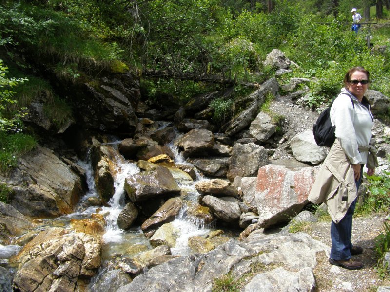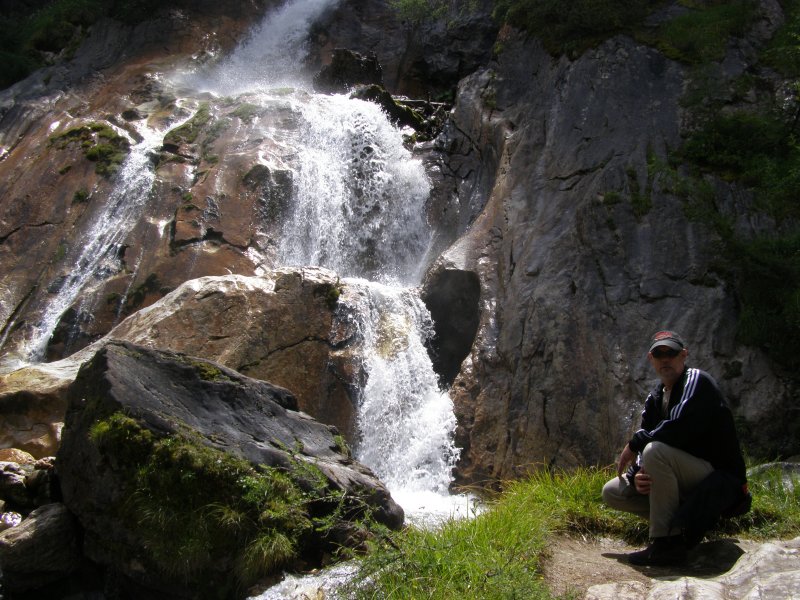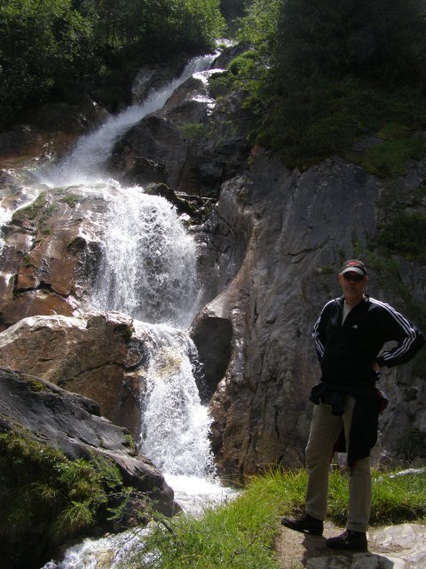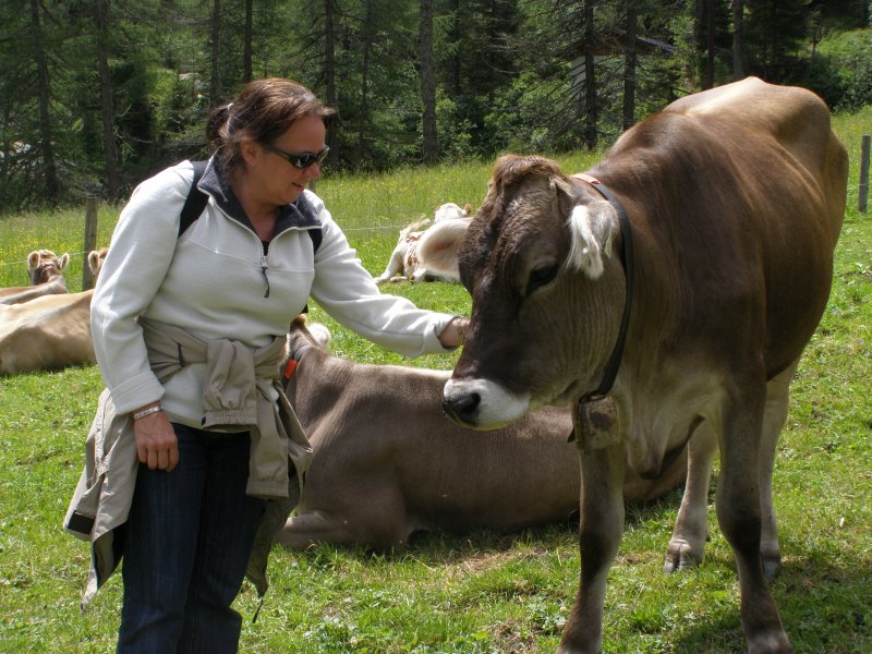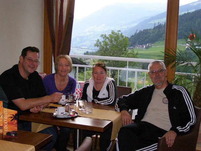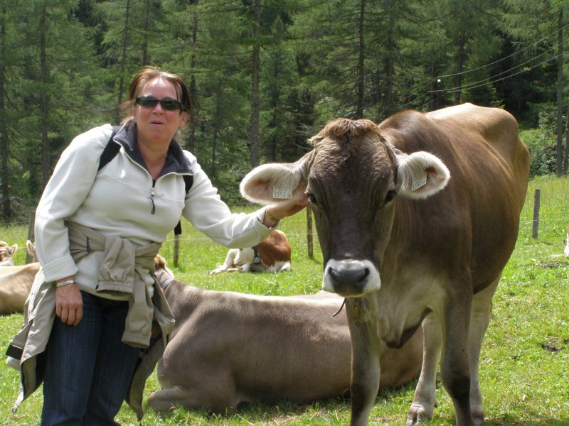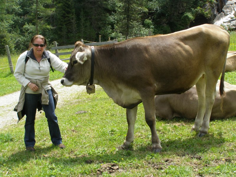 We besluiten om naar Hintertux te rijden. Als we daar aankomen lopen we eerst naar de waterval. Onderweg maakt Mels foto’s van Toos met een koe. Het is geen grote waterval maar het is wel klimmen als we naar boven willen. Weer via dezelfde weg terug. We gaan kijken of we de Hintertux gletsjer op kunnen gaan. Het kan maar alles zit in de nevel zien we op de monitors. Het is zonde van het geld als men boven komt en men ziet nog niet. Dan gaan we maar iets anders doen.