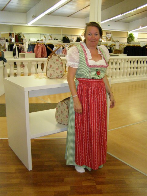 We rijden dan maar naar de Kerzenwelt in Brixlegg. Onderweg zien we een winkel waar op staat outlet trachtenkleider. We besluiten om te gaan kijken. We hebeben een leuke jurk voor Toos uitgezocht. Pashokje in en aandoen. Mels heeft nog een wit bloesje gezocht voor eronder. Maar de maat is niet goed. Te klein, dan maar een maat groter. Dit vind Mels niet direct en neemt 2 maten groter. De jurk kan aan al zit hij iets te ruim. Als Toos uit het hokje komt loopt er net een verkoopster langs met klanten. Ja zegt ze de kleur staat goed maar is een maat te groot. Mels maakt snel een foto als ze weg is. Kleren uit en terug hangen en de winkel uit. Mooi aandenken.