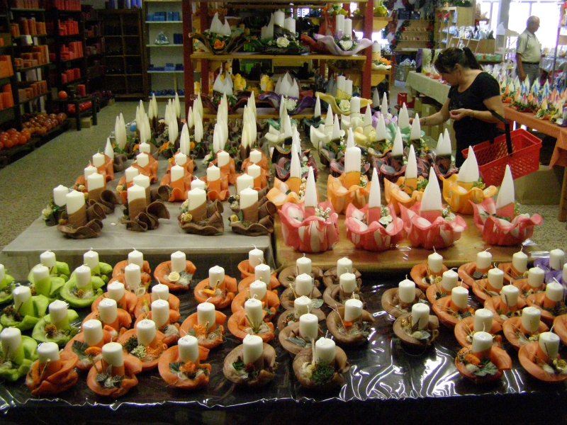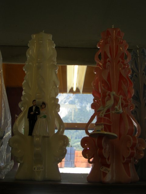 Dan rijden we door naar de Kerzenwelt. (www.kerzenwelt.at) Het is even zoeken maar dan hebben we het gevonden. Eerst even iets eten en een sanitaire stop. Je kunt er zo binnen lopen. Geen entree. Ongelooflijk veel kaarsen. Heel veel kleuren en thema’s. In de werkplaats is een dame een kaars aan het klaar maken. We kunnen het niet laten en nemen een mandje om toch enkele kaarsen mee te nemen. Mels maakt nog enkele foto’s en langzaam lopen we naar de uitgang. Onderweg zien we nog het wassen beeldenmuseum Hier worden handgemaakte en waardevolle wasfiguren in originele grote tentoongesteld. Je ziet de kruisiging van Jesus, Maria Theresia van Oostenrijk, Keizer Franz Josef, Wolfgang Amadeus Mozart en andere bekende personen uit de (Oostenrijkse) geschiedenis. We betalen aan de kassa en gaan terug naar de auto.