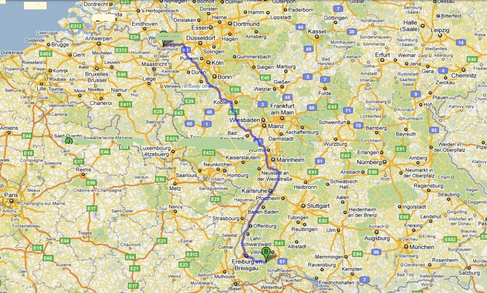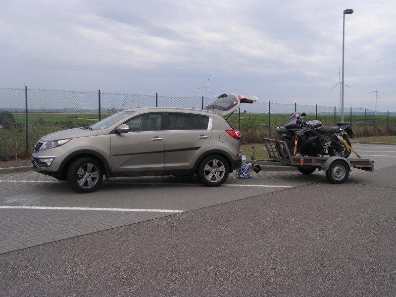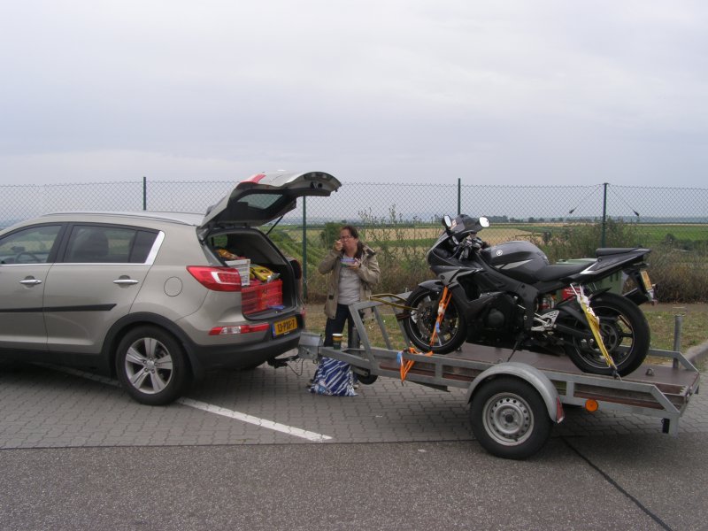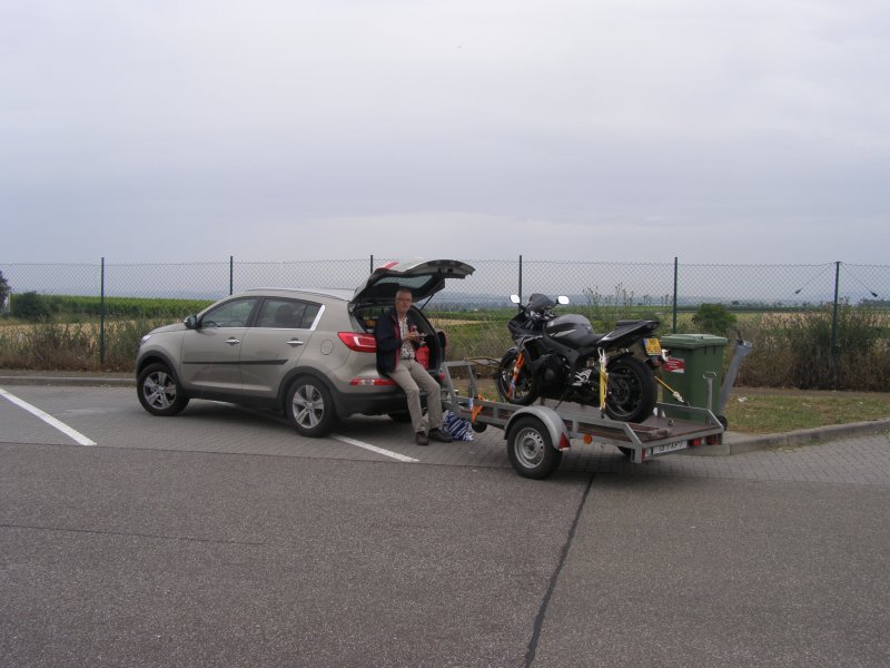 Als we weg rijden heeft Mels de usb stick ingestoken en we horen de eerste uren alleen maar Nederlandse smartlappen. De reis verloopt goed, af en toe een beetje regen, totdat we bij Stromberg in de file komen we in de file te staan. We mogen niet inhalen omdat we een aanhanger hebben. We staan tussen de vrachtwagens. Het verkeer in de rechterrijbaan staat helemaal stil, maar aan de linkerkant rijdt het nog. Dan horen we de verkeersinformatie en het blijkt dat er bergings werkzaamheden zijn en dat er maar een rijbaan beschikbaar is. Mels besluit om de linkerbaan toch te nemen en de vrachtwagens voorbij te gaan. Als we bij een afslag komen en zien zover als we kijken kunnen nog file staat besluiten we om de afslag te nemen. Dit is bij Reinböllen. We geven Tom Tom de opdracht om een omleiding te rijden. Als we weer de autosnelweg A61 willen we oprijden staan we stil op een binnendoor weg. Hier schiet het ook niet op en Mels besluit van onze auto een terreinwagen te maken. Hij gaat even naar de auto achter ons om even door te geven dat we ons gaan draaien in het gras. Rondje door het gras, terug op de weg en terug naar de splitsing om ergens anders de A61 op te gaan. Overal is het druk want iedereen is een alternatieve route aan het rijden. Als we stil staan in een dorpje stapt Mels even uit. Het verkeer staat weer helemaal stil. Even benen strekken voordat we weer verder kunnen. Dan gaat het weer langzaam verder. We horen dat de A61 in beide richtingen vastzit.
