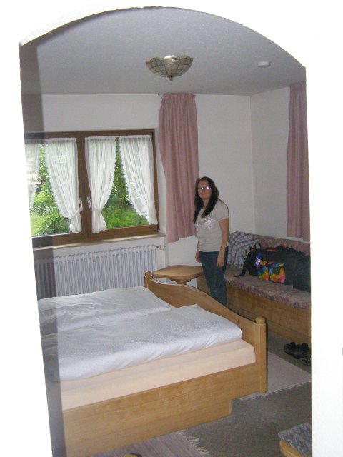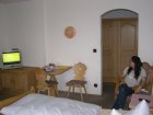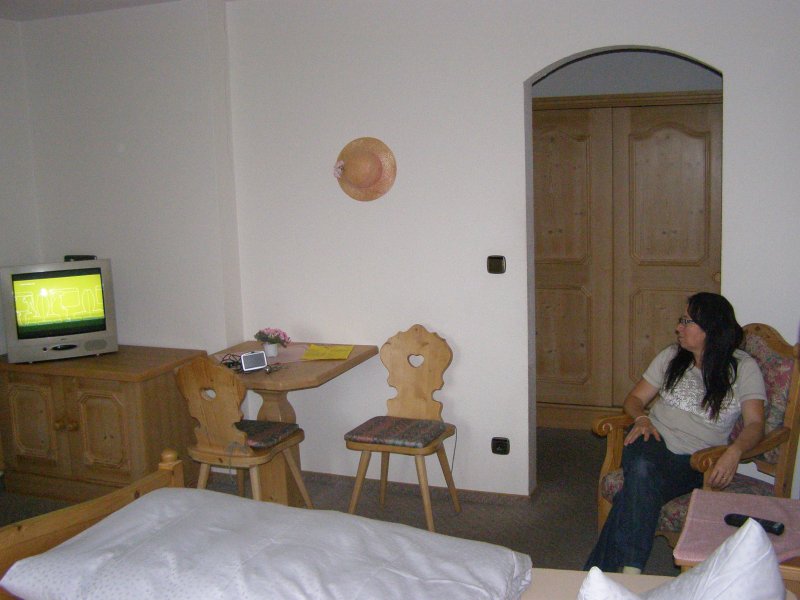 In het hotel worden we hartelijk ontvangen door de chef (warm broodje). Eerst gaan we de kamer bekijken. Dan mogen we eerst de spullen naar de kamer brengen en krijgen dan bij een welkomstdrankje tekst en uitleg voor de komende 3 dagen. We gaan, als we de auto geparkeerd hebben en de spullen uitgeladen te hebben, naar de bar. We krijgen tekst en uitleg over hoe laat het ontbijt is en het avondeten. Mels krijgt nog de codes voor te internetten. Even een berichtje naar Marij en Angelique. Nog even naar de kamer om dingen op te ruimen en dan naar het restaurant om te eten. Het eten staat klaar in buffetvorm. Men kan zoveel eten als men wil. Bouillon met knapperbolletjes, 2 soorten vlees (kip en ?), mixgroenten en spaghetti met champignonsaus, aardappelbolletjes en aardappelsnippers, salade. Als dessert hebben we de keuze uit koffie, likeurtje of ijs. We nemen ijs als toetje. Het eten smaakt goed maar is snel koud.