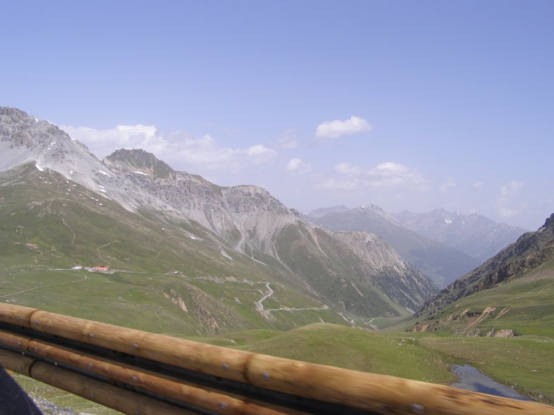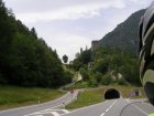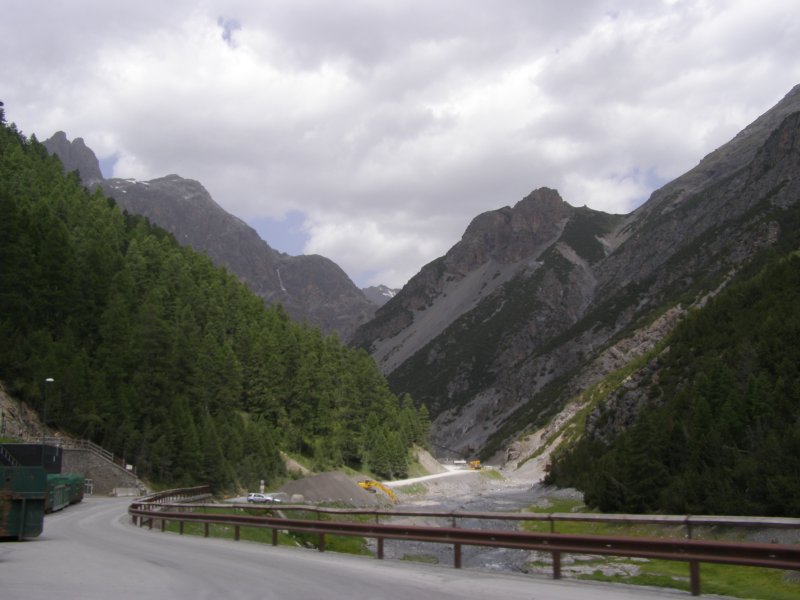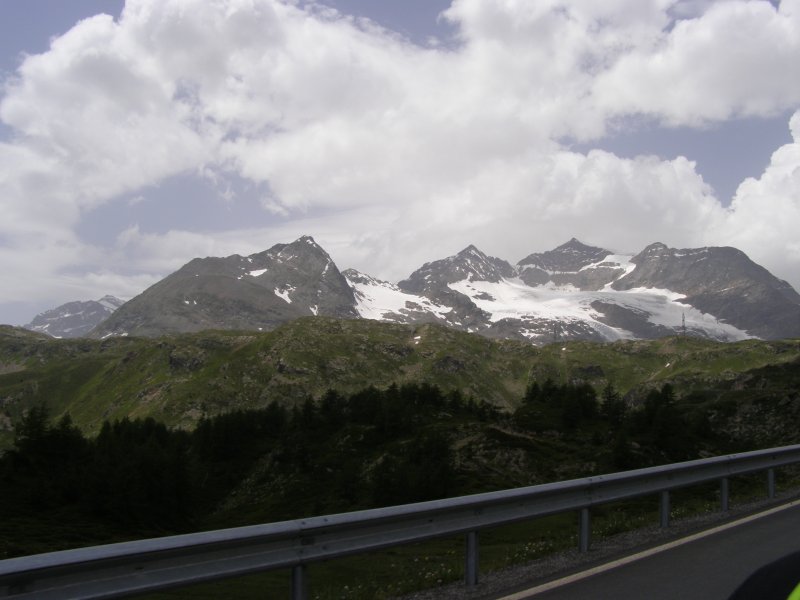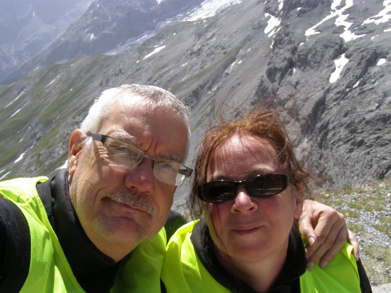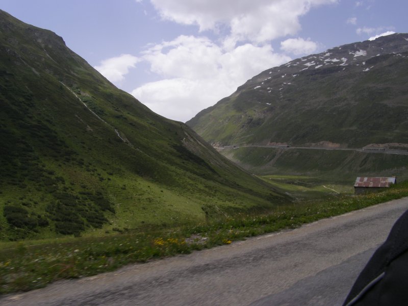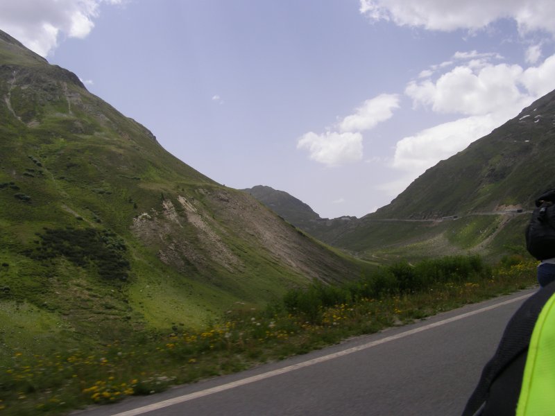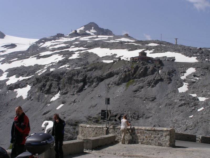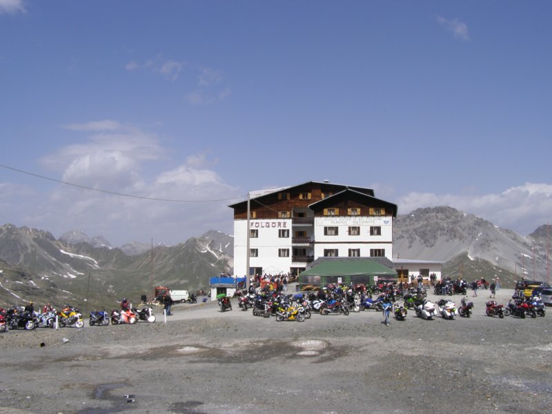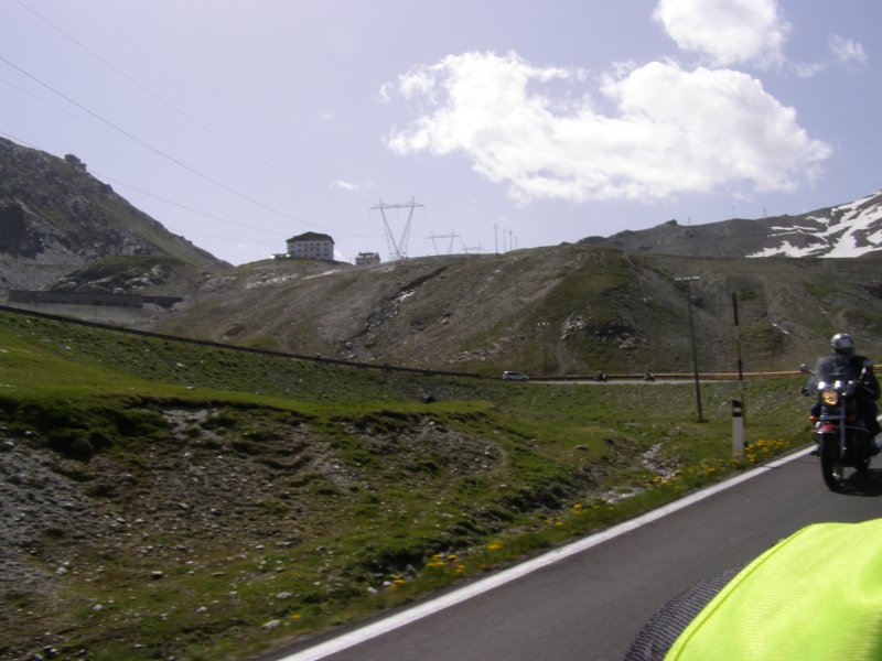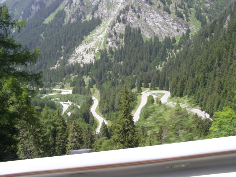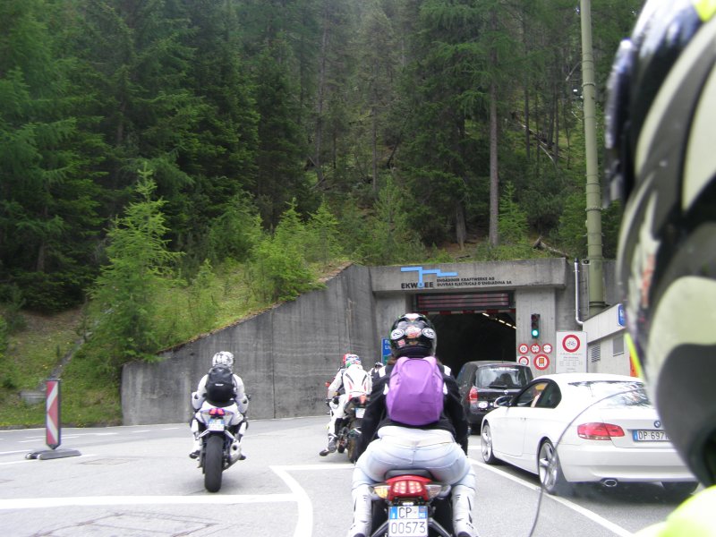 Als we boven aankomen is het zo druk dat we er niet stoppen maar even doorrijden. Daar maken we enkele foto’s. En dan rijden we nog een keer over de top en rijden via een andere weg (de Umbrallpass) naar beneden. Hier is het niet druk. Rustig rijden we naar beneden een gedeelte van de pas is onverhard maar is goed te rijden met de motor. Om wederom in Italië te komen besluiten we de Munt-la-Shera tunnel te nemen. Dit is een 3 km lange tunnel die een enkelbaanstunnel is en er is wisselende rijrichting. Het kan ongeveer 15 minuten duren eer dat men erdoor mag. In de zomer kan de wachttijd langer duren in verband met drukte. Aan het einde van de tunnel moeten we tol betalen € 9,00.