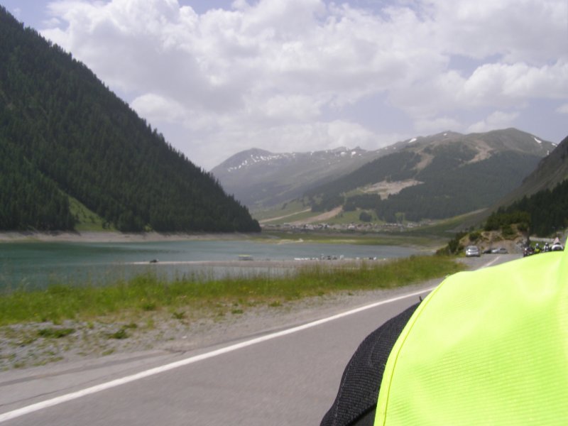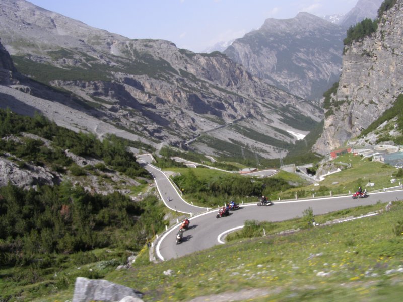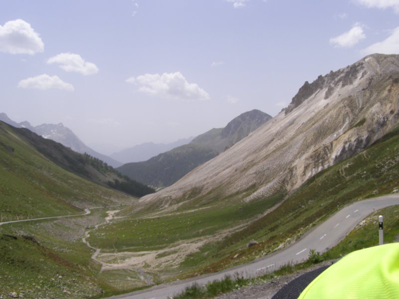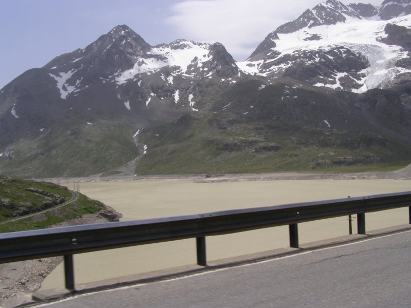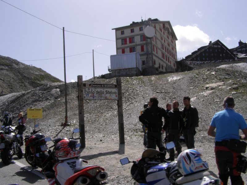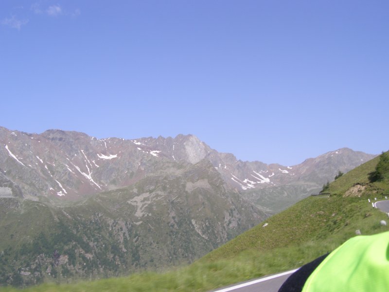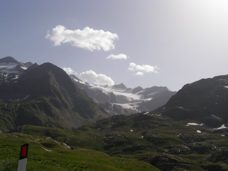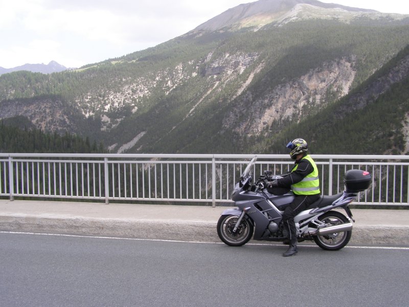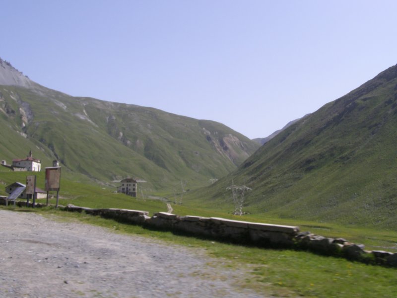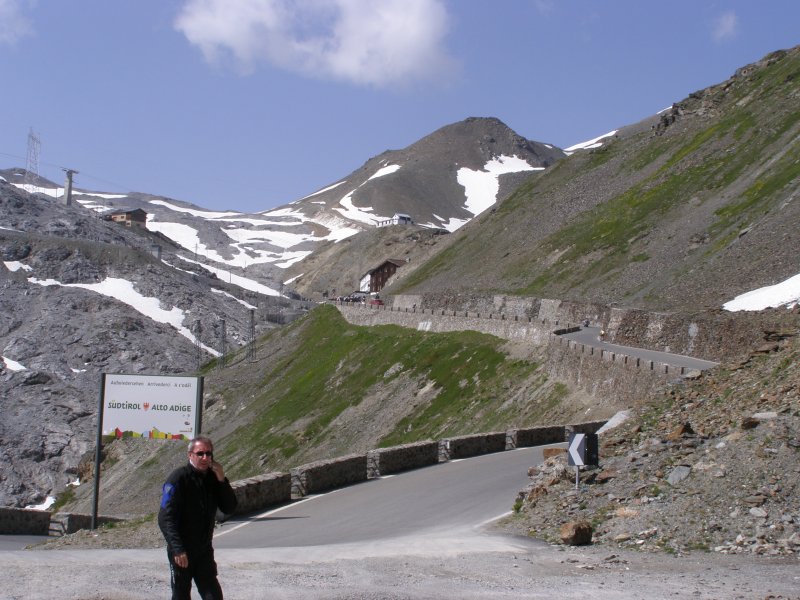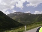 Als we boven aankomen is het zo druk dat we er niet stoppen maar even doorrijden. Daar maken we enkele foto’s. En dan rijden we nog een keer over de top en rijden via een andere weg (de Umbrallpass) naar beneden. Hier is het niet druk. Rustig rijden we naar beneden een gedeelte van de pas is onverhard maar is goed te rijden met de motor. Om wederom in Italië te komen besluiten we de Munt-la-Shera tunnel te nemen. Dit is een 3 km lange tunnel die een enkelbaanstunnel is en er is wisselende rijrichting. Het kan ongeveer 15 minuten duren eer dat men erdoor mag. In de zomer kan de wachttijd langer duren in verband met drukte. Aan het einde van de tunnel moeten we tol betalen € 9,00.