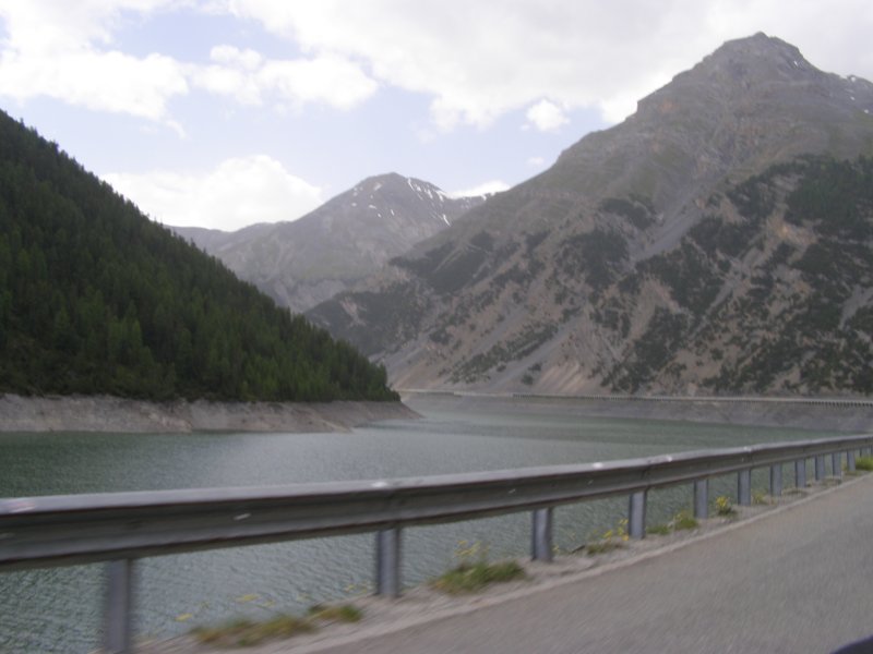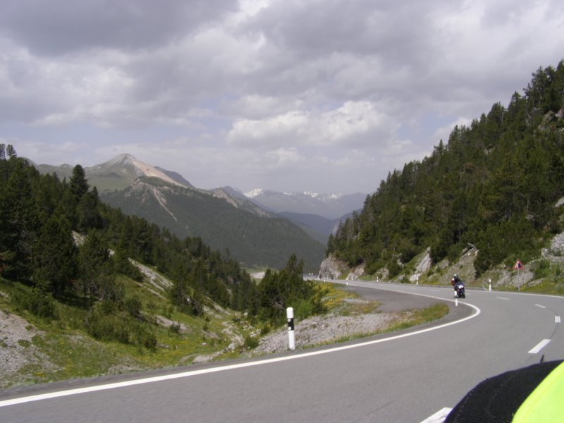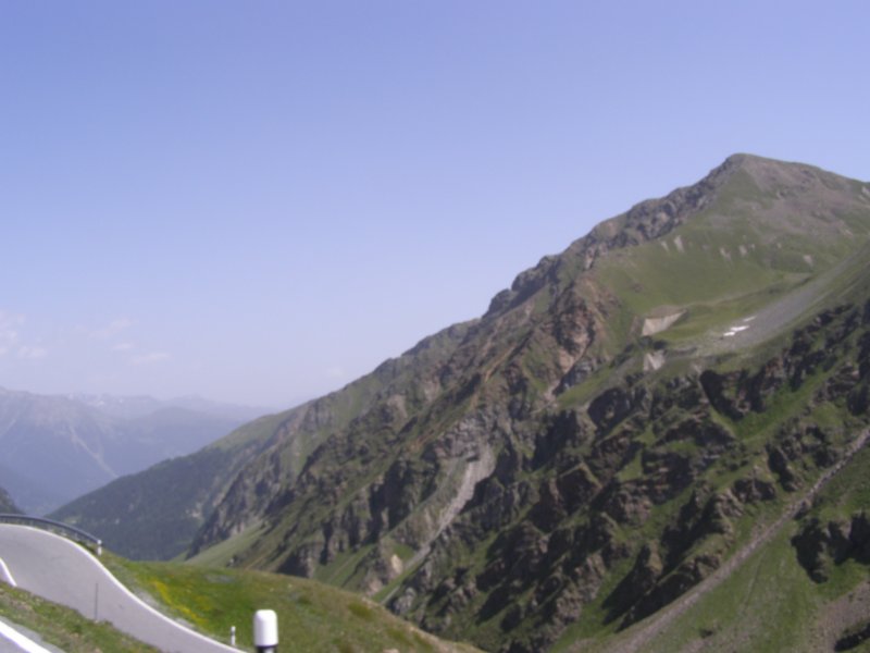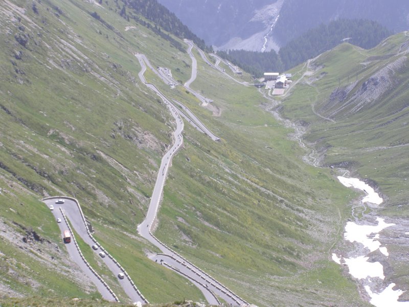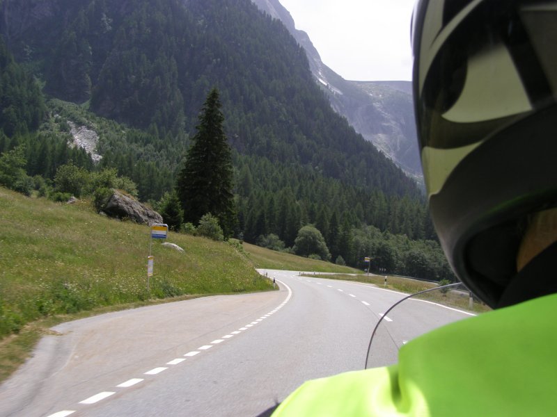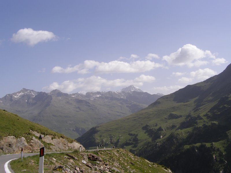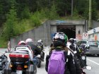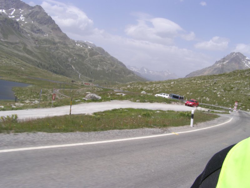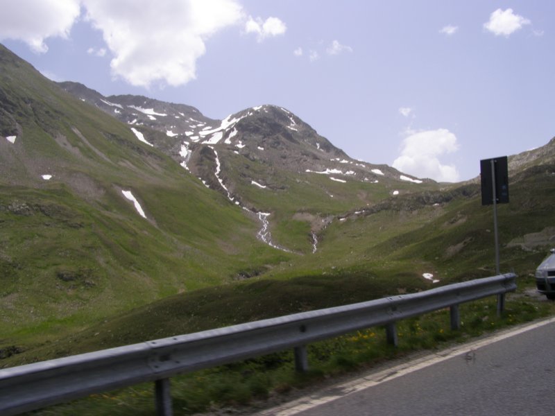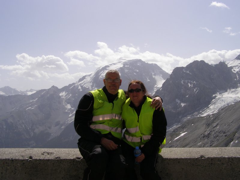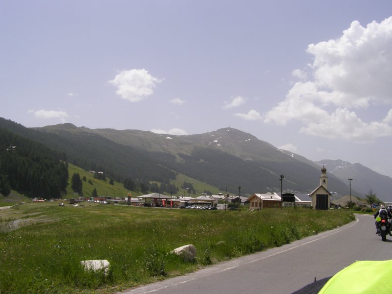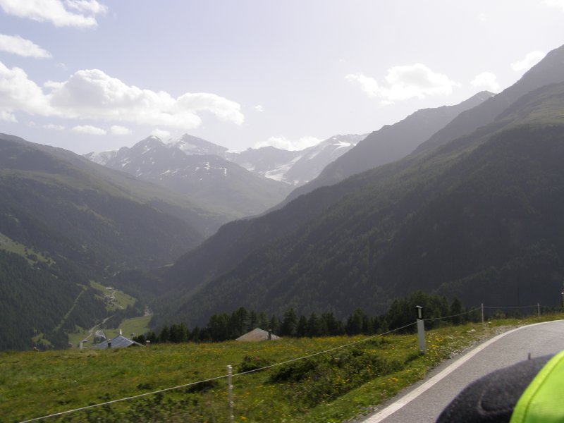 Als we boven aankomen is het zo druk dat we er niet stoppen maar even doorrijden. Daar maken we enkele foto’s. En dan rijden we nog een keer over de top en rijden via een andere weg (de Umbrallpass) naar beneden. Hier is het niet druk. Rustig rijden we naar beneden een gedeelte van de pas is onverhard maar is goed te rijden met de motor. Om wederom in Italië te komen besluiten we de Munt-la-Shera tunnel te nemen. Dit is een 3 km lange tunnel die een enkelbaanstunnel is en er is wisselende rijrichting. Het kan ongeveer 15 minuten duren eer dat men erdoor mag. In de zomer kan de wachttijd langer duren in verband met drukte. Aan het einde van de tunnel moeten we tol betalen € 9,00.
