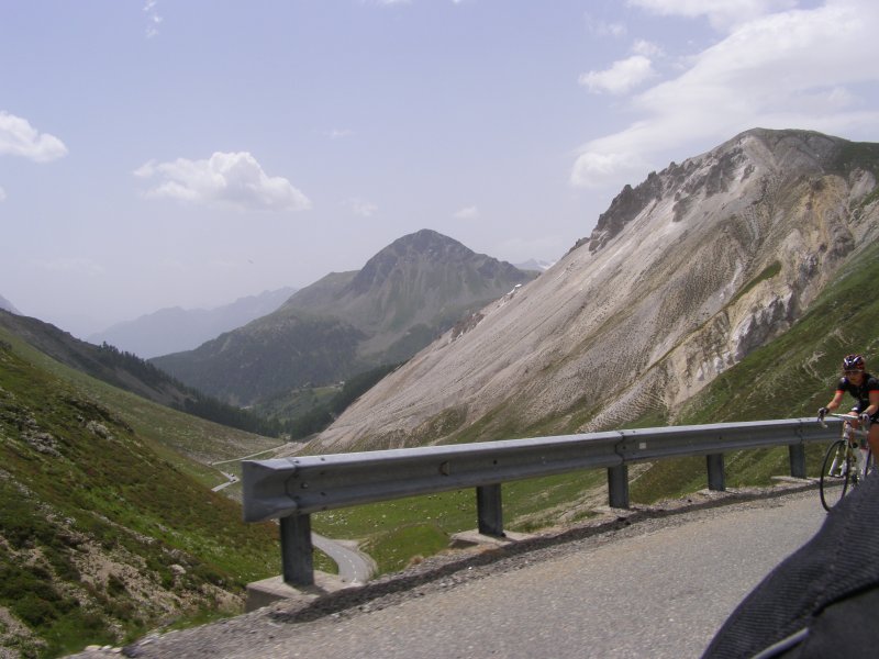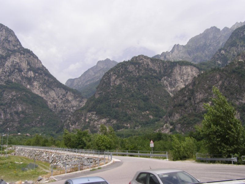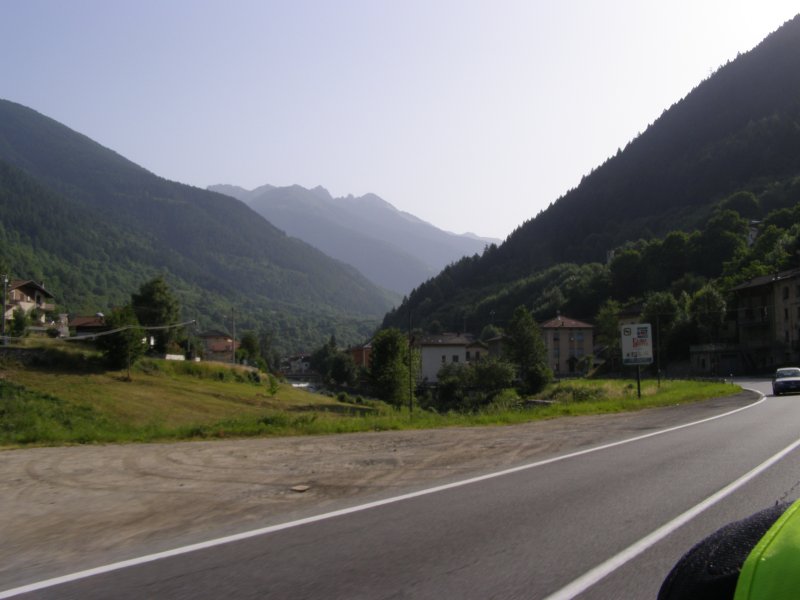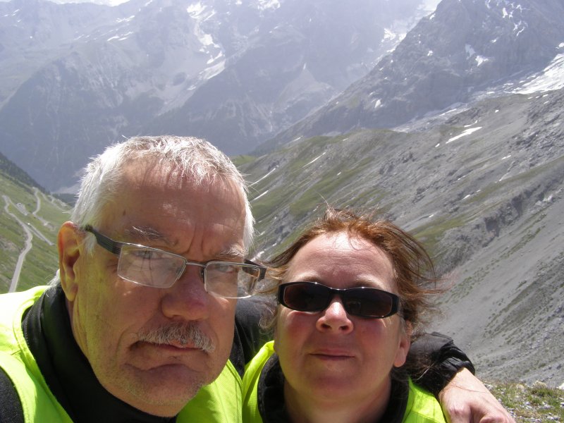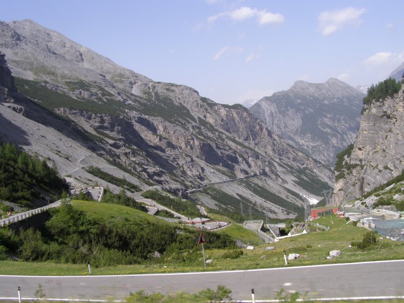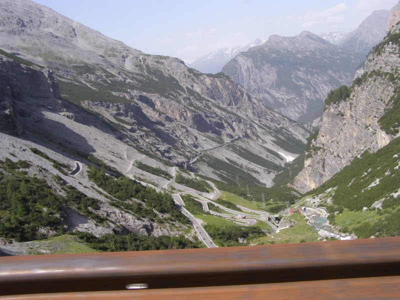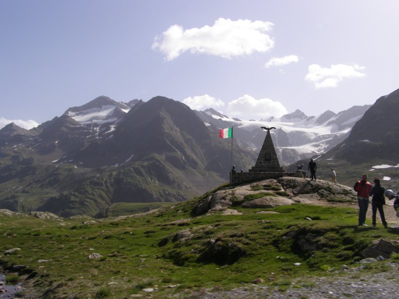 De Gaviapas is een van de hoogste passwegen van Europa. Het is een verschrikkelijke pas om te rijden. Slecht wegdek en smal. Als we langs een monument komen zegt Toos ‘hier zijn we ooit geweest’. Volgens Mels niet. (Maar als we later in het appartement zijn en het opzoeken op de website zien we dat we enkele jaren ook zijn geweest). Onderweg komen we over smalle weggetjes die over een pas leiden. Het is er zo smal dat je hoopt dat je geen auto tegenkomt. We komen toch een auto tegen en die rijdt zo dicht op ons dat hij Mels over de voet rijdt. Zo komen we aan bij het begin van de Stelvio pas in het zuiden. Het plaatsje Bormio waar je omhoog kunt rijden richting Stelvio pas. Het is er ontzettend druk en de politie is het verkeer aan het regelen. We rijden langzaam aan omhoog en het is er druk met motors. Heen en terug weg. Wielrenners zie je omlaag vliegen. Levensgevaarlijk. Hebben geen licht op hun fietsen en in de tunnels schrik je ervan als je er een voor je ziet.