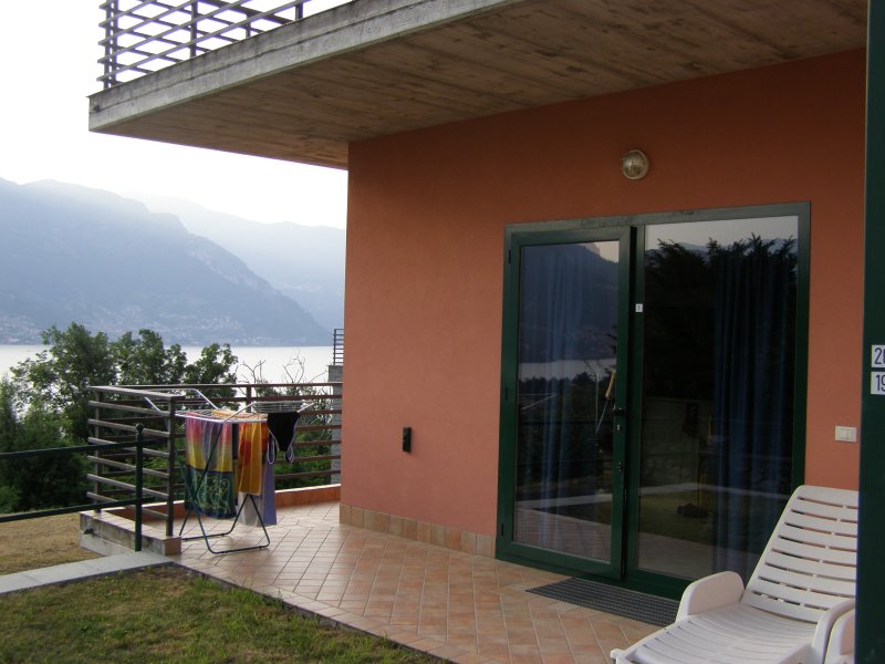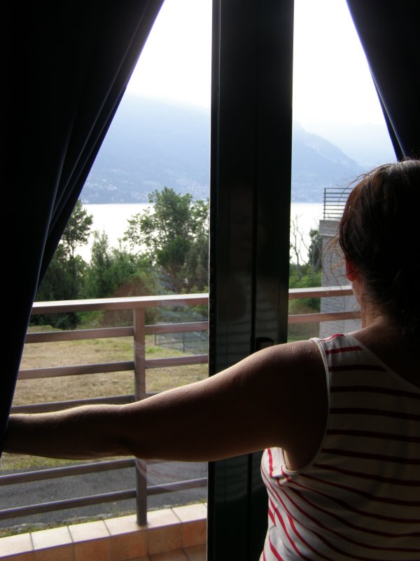 Het is echt een kamer appartement. Er staat een bank en als het onderstel eruit trekken hebben we twee bedden. Dat wordt iedere avond opbouwen en morgens afbreken. Achter een rolluikje zit een klein aanrechtje met een 2 pits fornuisje. En een kleine koelkast. Het is en simpel appartement. Vooral als je er alleen bent om te slapen. Het uitzicht is wel heel mooi. Als we op het balkon zitten kijken we over het Comomeer.