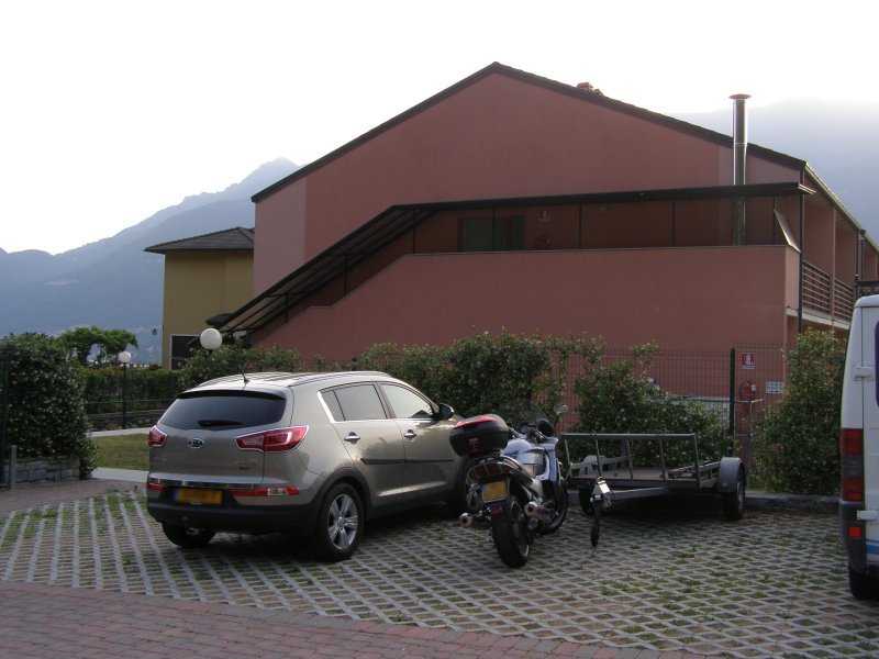 Als we later rondlopen zien we dat de andere appartementen even groot zijn en dat er dan 3 á 4 eenpersoonsbedden staan. Als we alles uit de auto hebben gehaald en opgeruimd hebben gaan we ook maar even de motor van de trailer afhalen. Pff effe schrikken een van de voorste spanbanden was kapot gegaan de motor stond dus maar met 1 spanband aan de voorkant vast. Ach zeg Mels, daarom waren ze achter me soms met de lichten aan het knipperen. De kapotte spanband was bijna om de rechterband van de trailer geslagen met alle gevolgen van dien. Effin het is goed gegaan alles is klaar en we gaan nog even naar het zwembad. Hier is het ontzettend druk. Het blijkt dat de bewoners uit het dorp Dervio ook gebruik mogen maken van het zwembad. Het zwembad is tot 19:00 uur open. We besluiten om 18:00 uur terug te gaan. Als we dan terugkomen is het niet meer zo druk. Het is nog warm en we nemen nog een duik in het warme water. Lekker nog zonnen en eten. Avonds nog tv kijken en luieren.