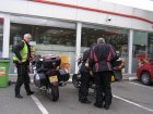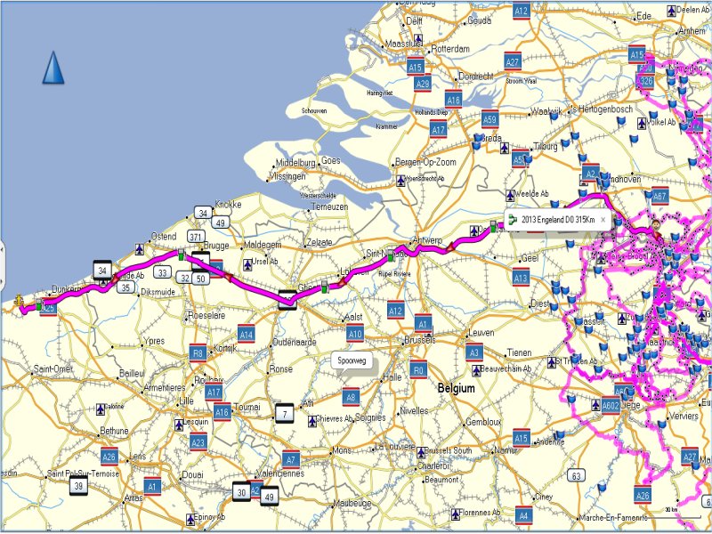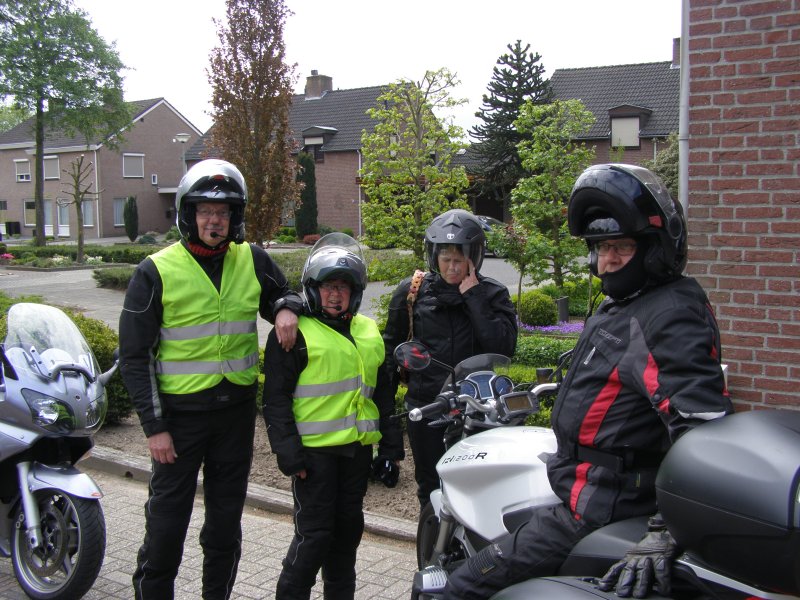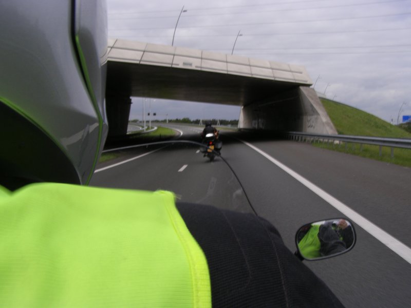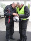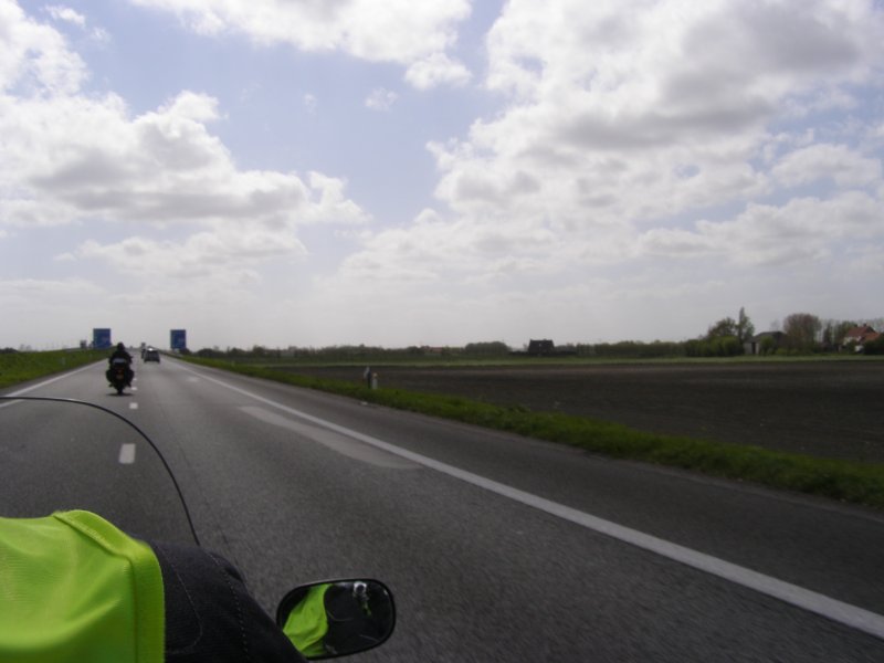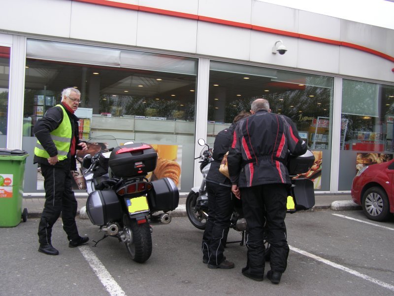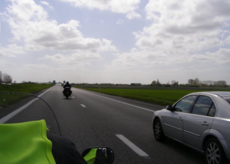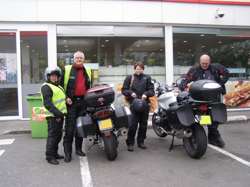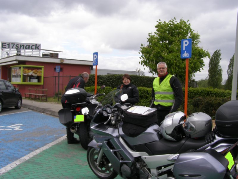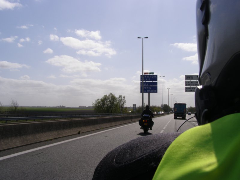 We rijden samen over de autosnelweg richting Eindhoven – Antwerpen – Gent – Brugge – Dunkerque. Martien en Gerry wilden graag binnen doorrijden en rijden vandaag alleen. Het waait hard, maar we schieten snel op. Na ongeveer 1,5 uur stoppen we even om de benen te strekken. Sanitaire stop en even iets drinken. Als Els weer een beetje op temperatuur is besluiten we om ver te rijden. De volgende stop gaan we tanken. Toos haar helm ligt uit elkaar. Mels en Jean bekijken het even. Jean gaat bij een monteur een imbussleutel vragen en even gesleuteld te hebben is de helm weer klaar. We zijn dan in de buurt van Gent.