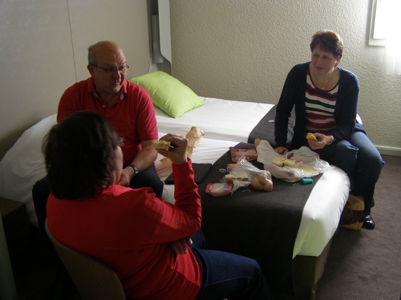 Ondertussen komen Martien en Gerry ook aan. Jean loopt achter hun naar binnen en doet de mededeling om mee naar boven te gaan. Hij heeft even inkopen gedaan tegenover het hotel in een supermarkt. We pakken onze gekookte eieren, worst en kaar en gaan naar Jean en Els. Jean heeft stokbrood en vlees gehaald. We eten bij hun op de kamer. Mels en Jean hebben samen over de drank. Ze besluiten om samen naar de supermarkt te lopen en drank te halen en dit vanavond op te drinken. Ondertussen komen Martien en Gerry binnenlopen. Ze eten ook nog even stokbrood en worst met kaas. Als Mels en Jean terug komen hebben ze bier, cola en chips bij zich.