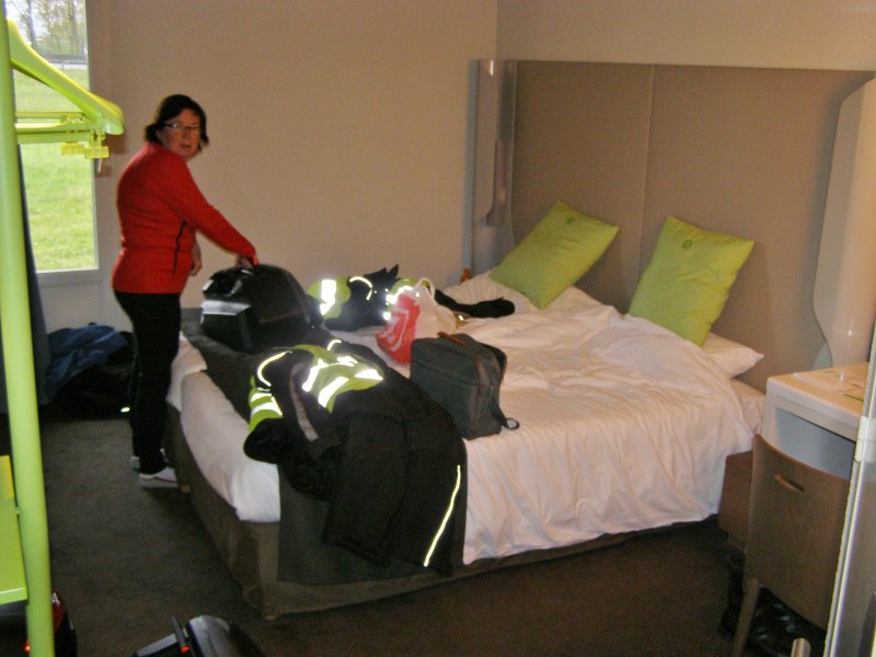 We hoeven nog maar ongeveer 75 kilometer te rijden en dan zijn we bij het hotel waar we overnachten. Het laatste stuk is het een harde wind. zwaar rijden. na even zoeken vinden we het hotel. naar de balie en inchecken. eerst de kamer bekijken en dan alle spullen van de motor halen. het is een compacte kamer.