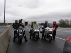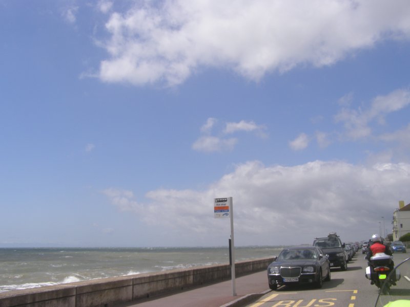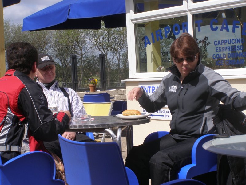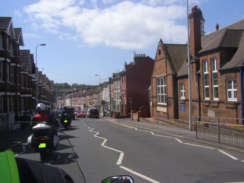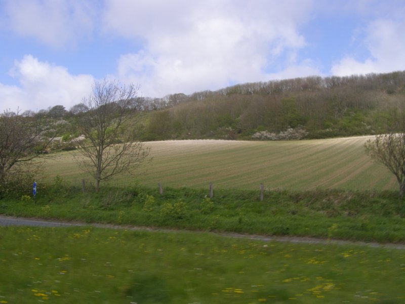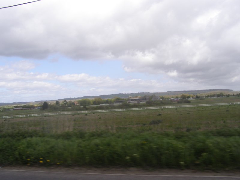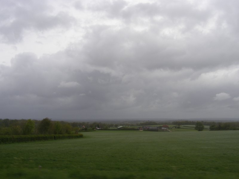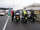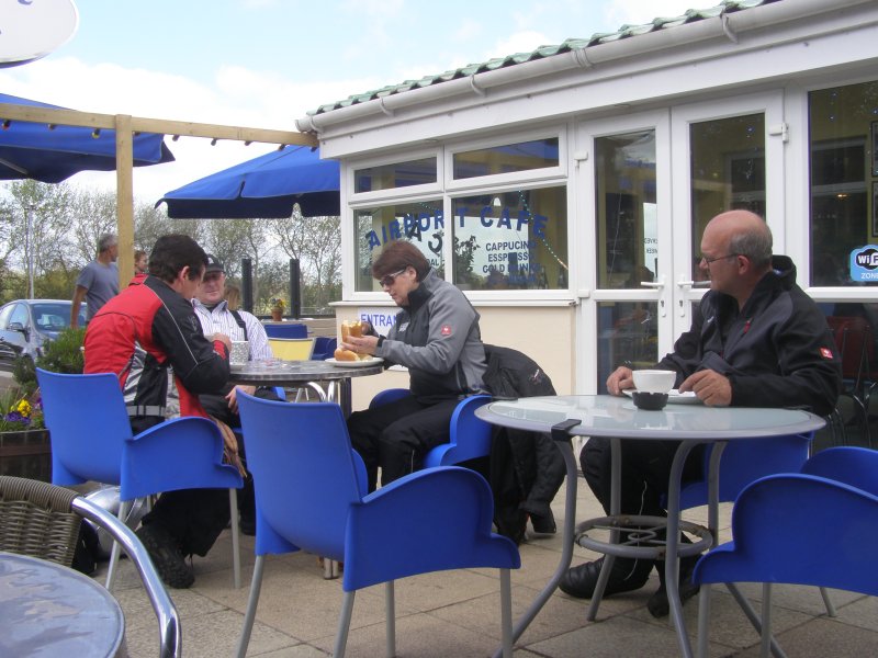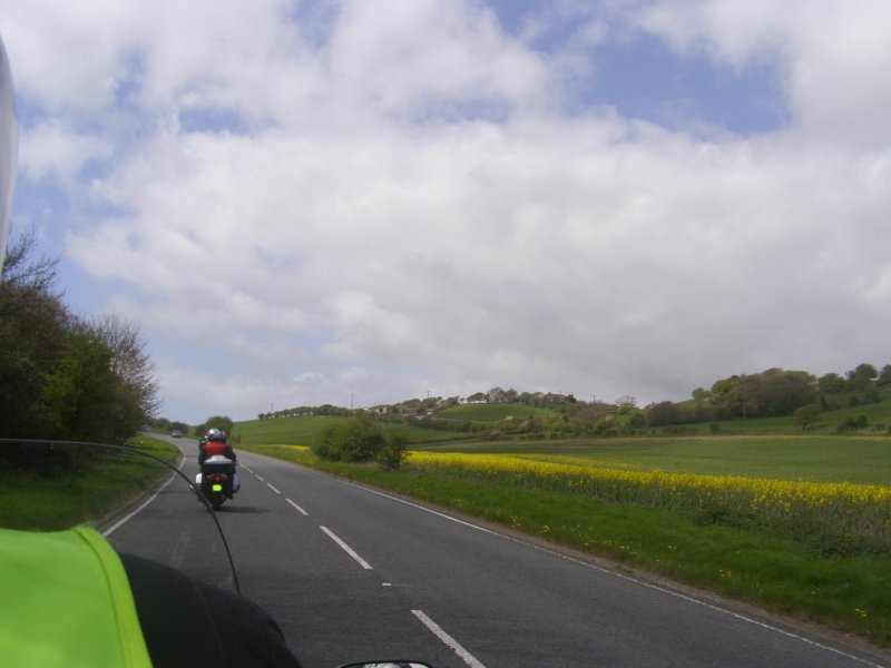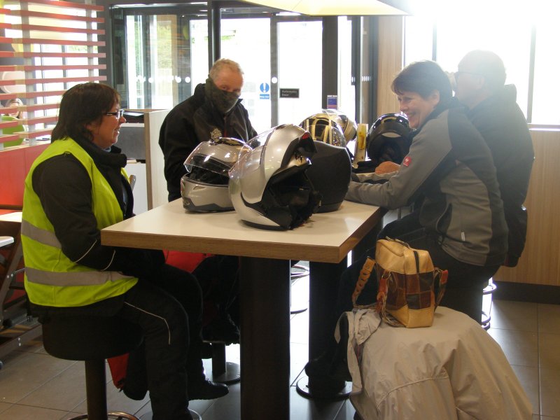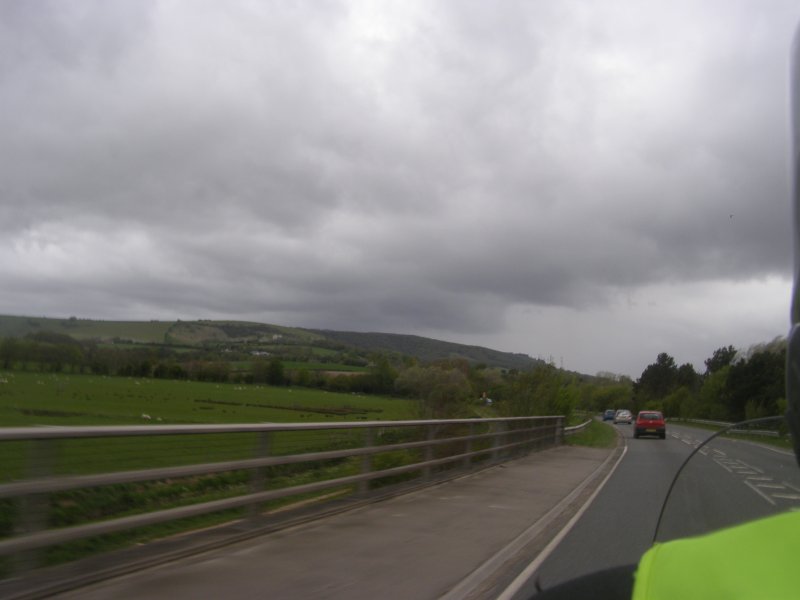 Het ziet uit naar regen en er is veel wind. We zijn snel buiten Dover en we zitten op de route. Het landschap is mooi. Maar de wegen zijn op plaatsen zeer slecht. We stoppen om iets te drinken cq te eten. Na onze pauze rijden we verder. Dan begint het te regenen. We stoppen onder een viaduct. We staan dan op een lichte helling. Niet iedereen heeft dit in de gaten en de terwijl Jean bij zijn motor staat valt deze om. Samen met Els raapt hij hem om. Een paar schrammetjes maar verder geen schade. We besluiten verder te rijden en eerst even te tanken en er ook een kop koffie te drinken. Als er getankt is regent het weer. We besluiten bij Mac Donalds koffie te drinken. Dit ligt langs het tankstation. Nadat iedereen iets heeft gedronken besluiten we om verder te rijden.
