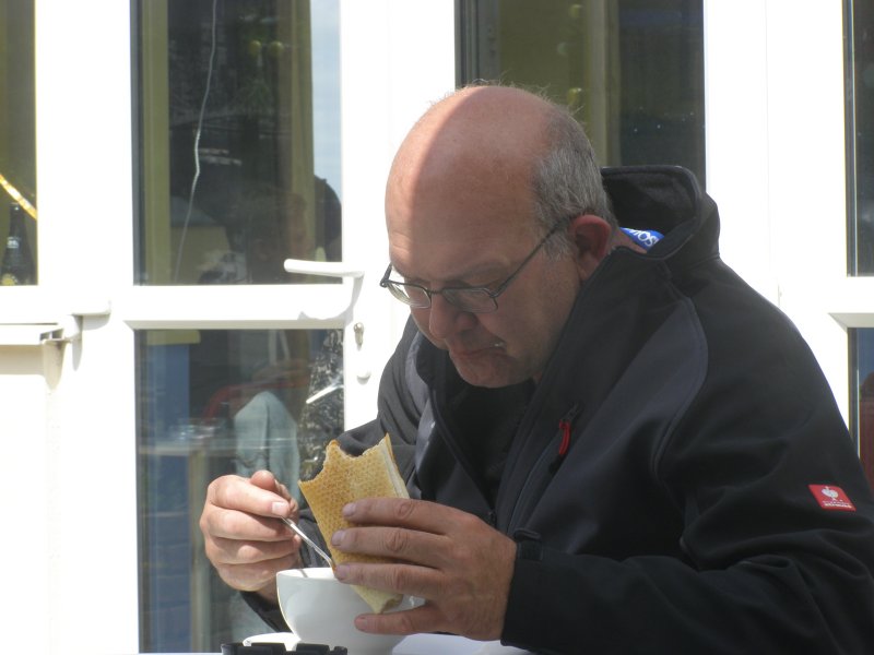 Om 7:30 uur loopt het wekkertje af. Wassen en aankleden. Gisterenavond hebben we alles zoveel mogelijk ingepakt. Mels brengt nog even de koffers naar de motor. Even later komt Jean, Martien en Gerry voor het ontbijt. Het eten staat op het bed klaar. Brood snijden en eten. Ieder iets te drinken en het buikje van iedereen vult zich.