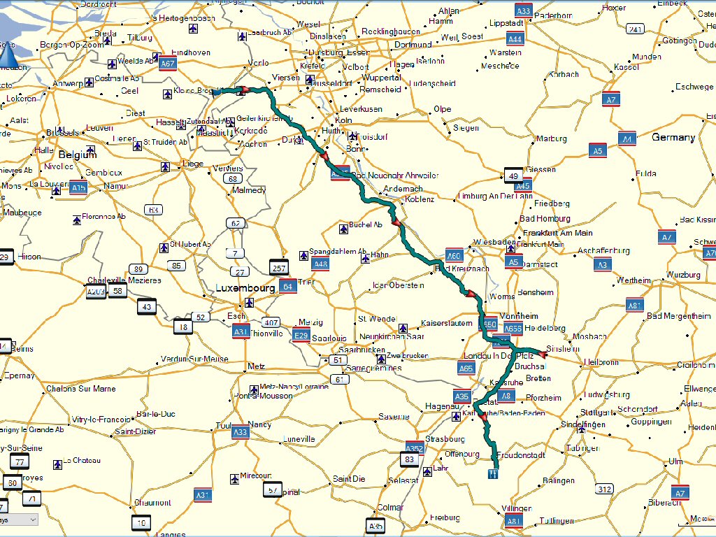 En daar staan we dan in de file. Helemaal vast. We hebben nog een stuk (ongeveer 3 km) er langs opgereden. Allemaal vrachtwagens. Na een half uur kunnen we eindelijk weer rijden. Alles rijdt nu over een baan. Maar we rijden al is het langzaam. Dan moeten we de autosnelweg af. Verder filerijden. Dan maar binnendoor. Geen file meer. Nadat we door de stad Worms zijn omgereden zijn we weer aan het doorrijden. Hier mogen we wel inhalen wat we op de A61 niet mochten maar we af en toe stiekem deden.