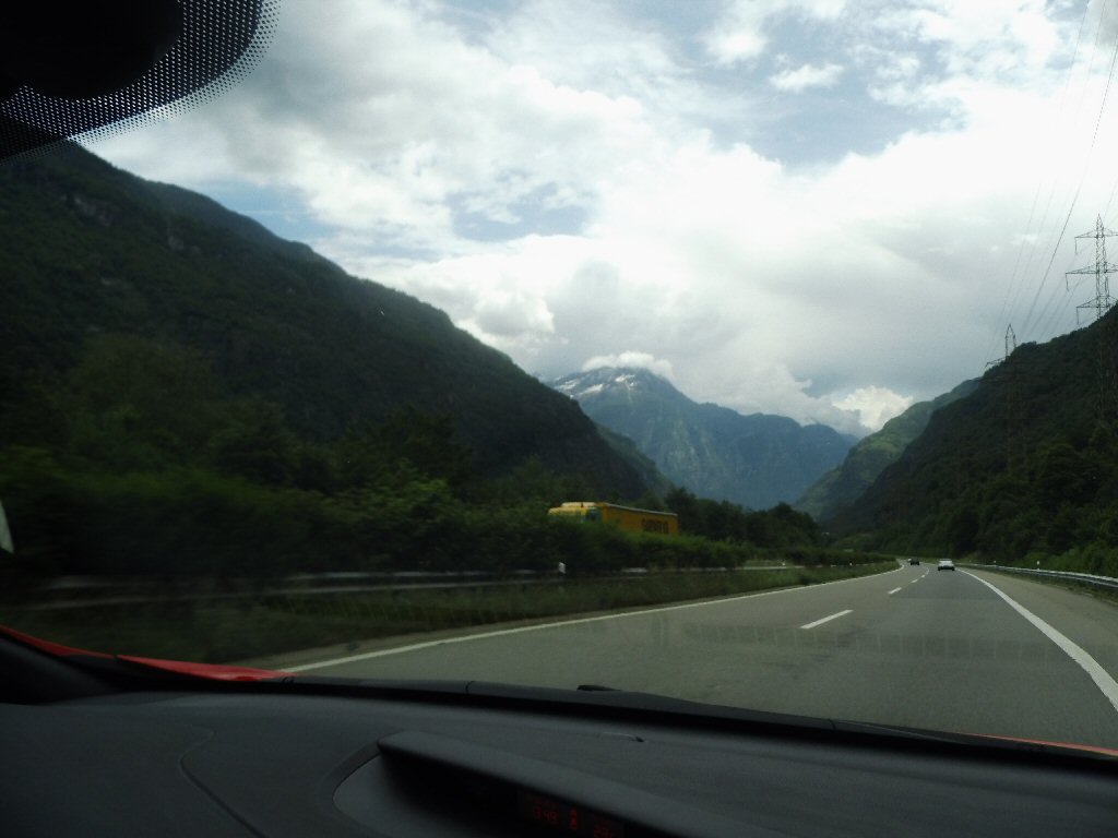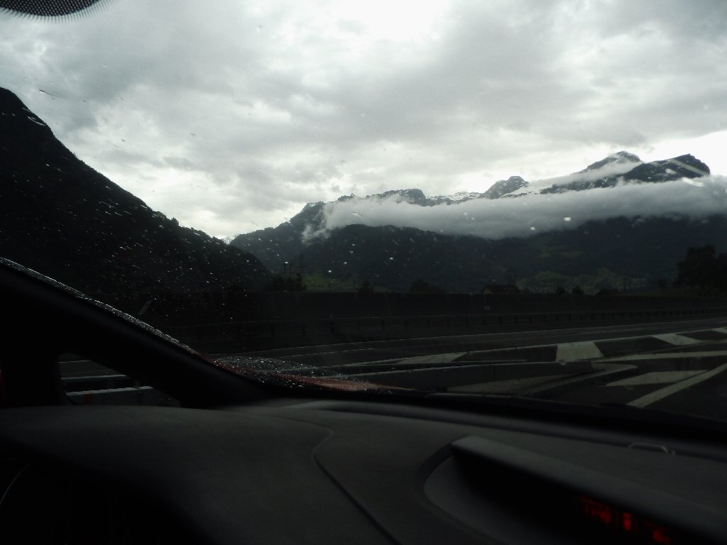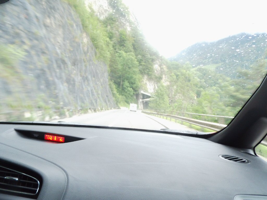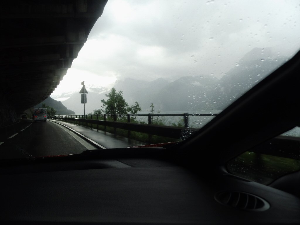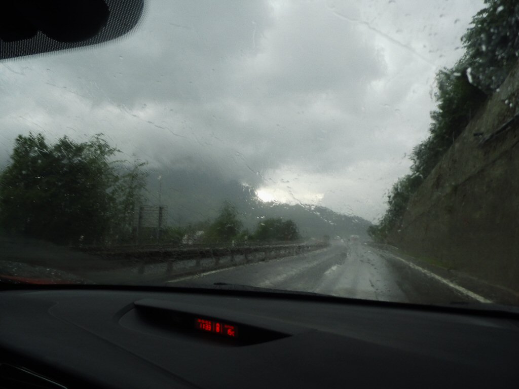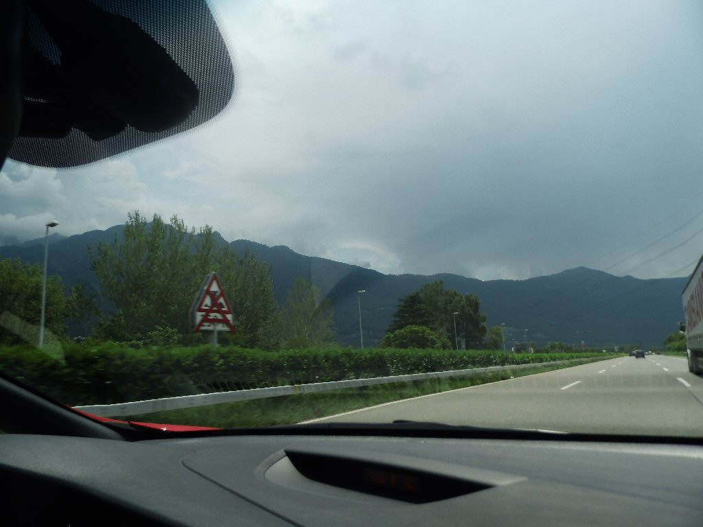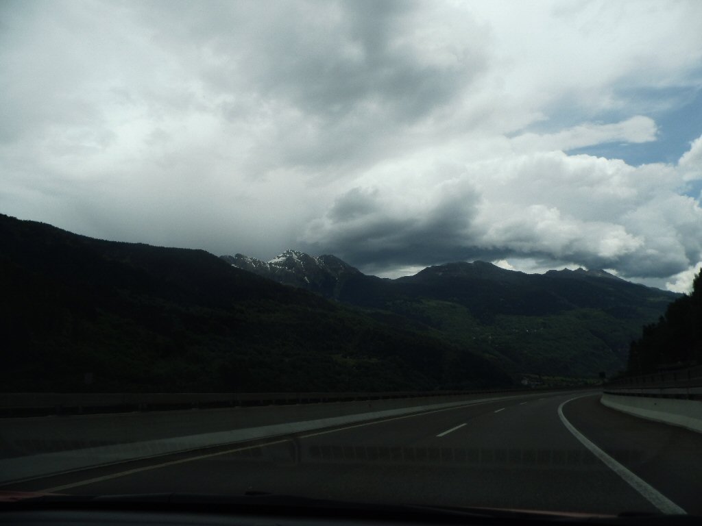 Het weer wordt beter. Het is nu droog en het zonnetje komt af en toe door de wolken heen. Het is buiten 25 graden. Dit is beter. Het dak gaat open. Gisteren ben ik al bruin geworden omdat we met open dak reden. Heerlijk. Maar te vroeg gejuicht. De verdere rit hebben we veel regen met heftige buien. We tanken in Italië en we worden geholpen door een vriendelijke man. De prijs was € 1,44 per liter. Later zagen we overal dat de benzine overal duurder was. Gewoon geluk gehad