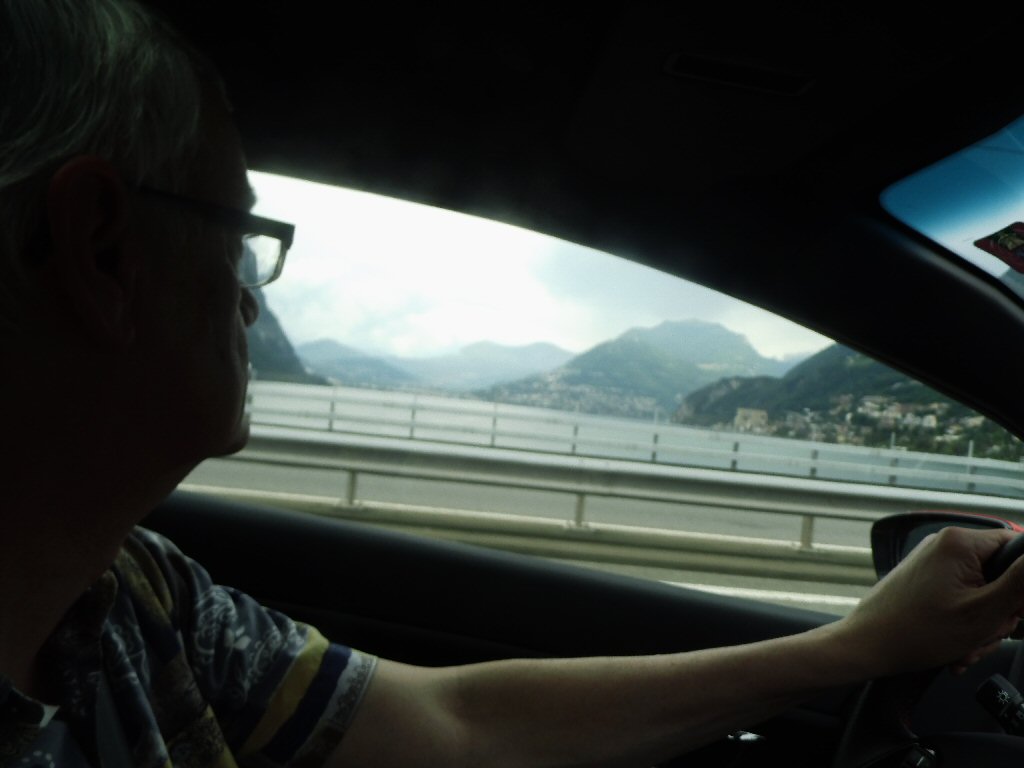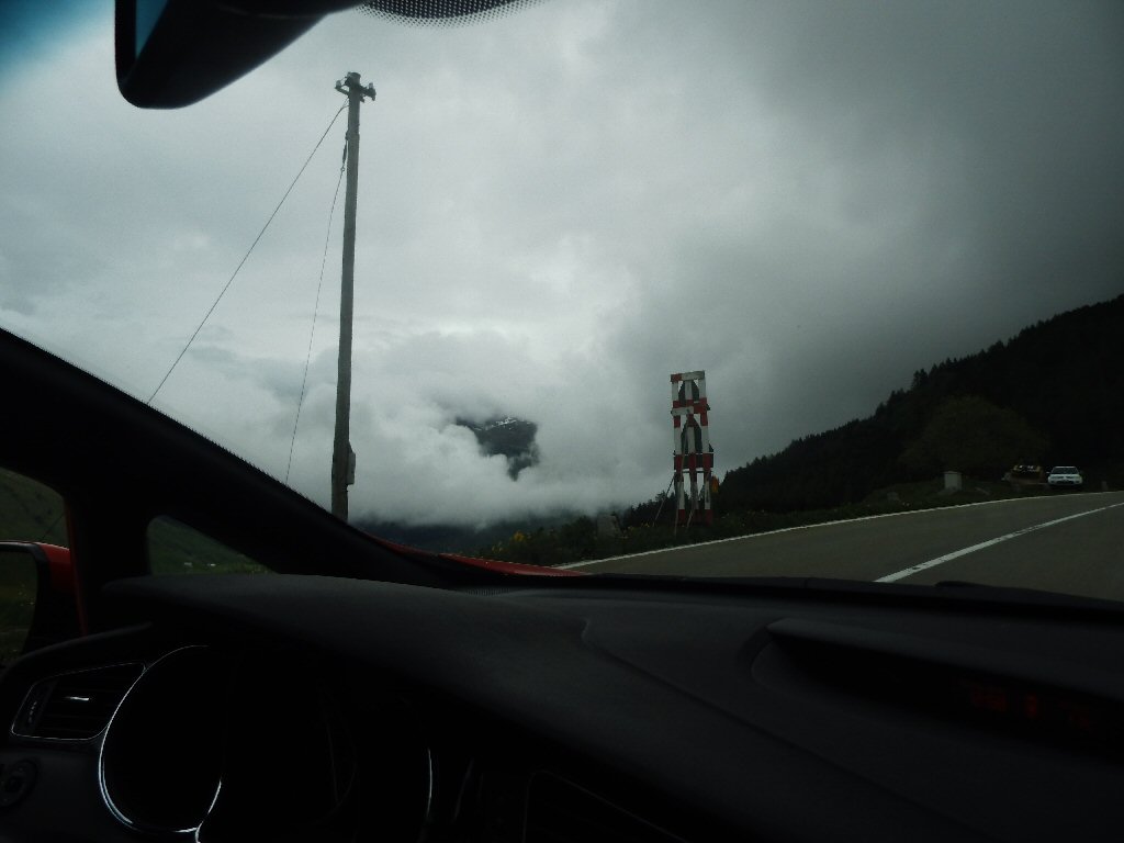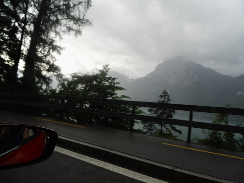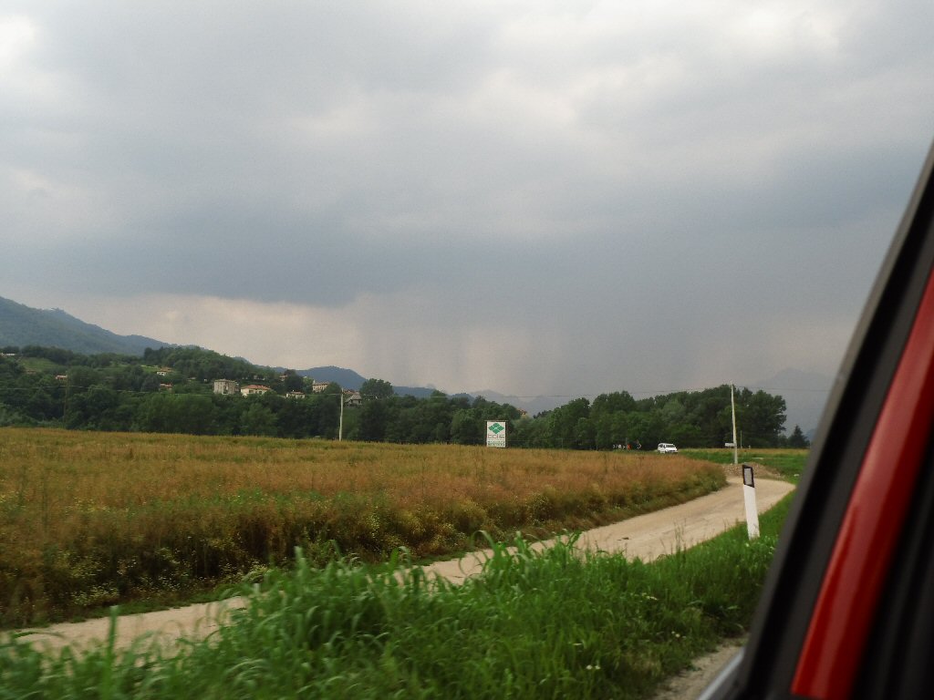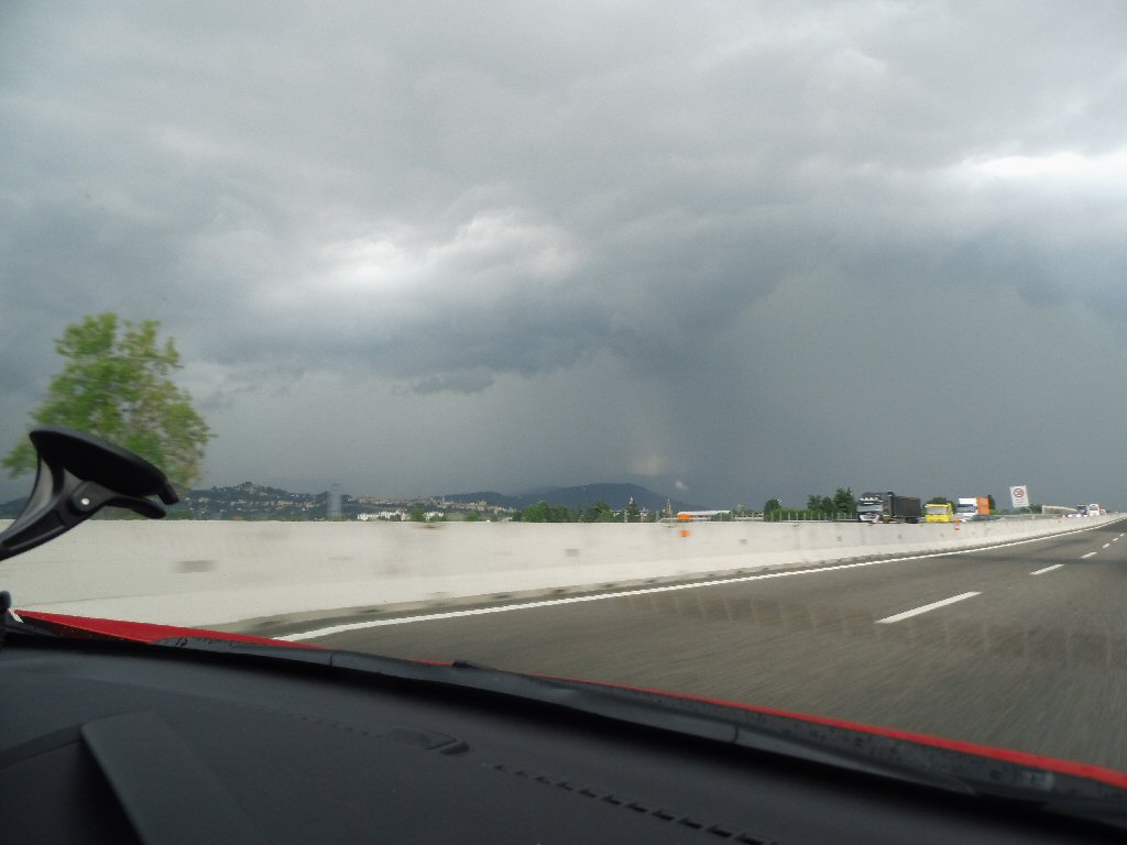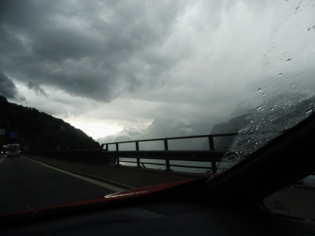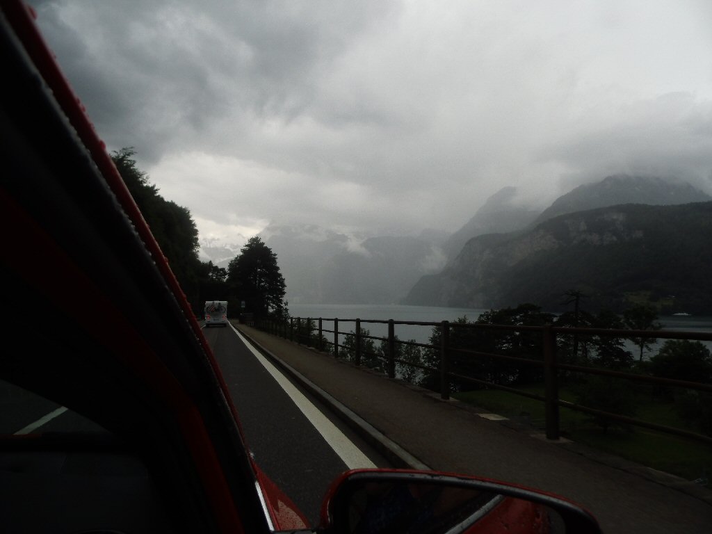 Het weer wordt beter. Het is nu droog en het zonnetje komt af en toe door de wolken heen. Het is buiten 25 graden. Dit is beter. Het dak gaat open. Gisteren ben ik al bruin geworden omdat we met open dak reden. Heerlijk. Maar te vroeg gejuicht. De verdere rit hebben we veel regen met heftige buien. We tanken in Italië en we worden geholpen door een vriendelijke man. De prijs was € 1,44 per liter. Later zagen we overal dat de benzine overal duurder was. Gewoon geluk gehad