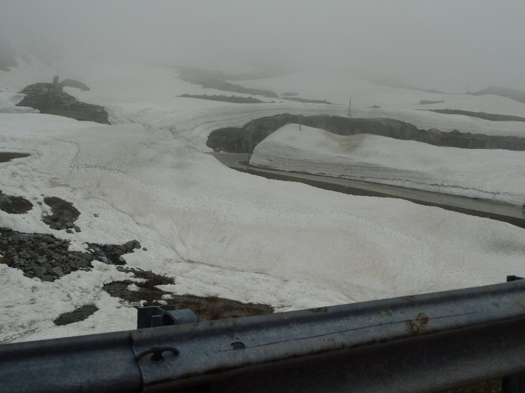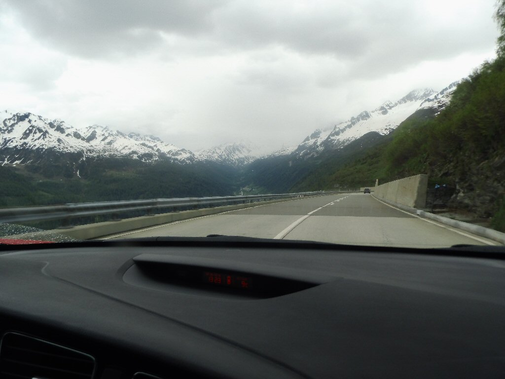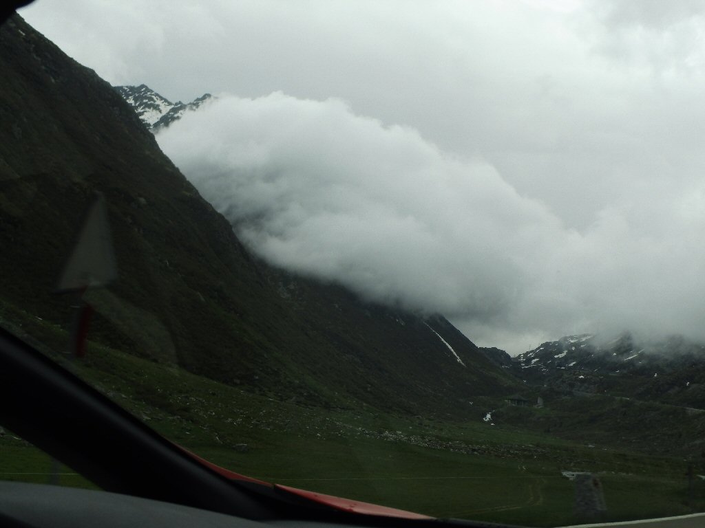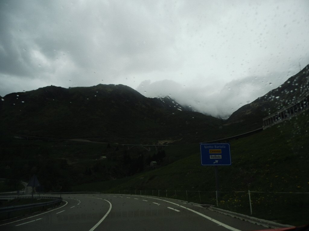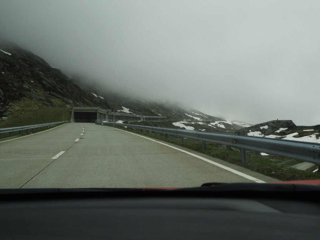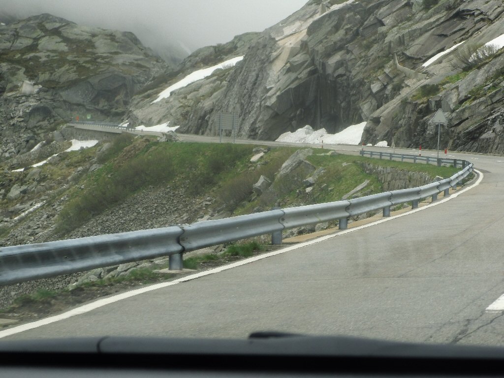 De eerste stop regent het nog in Zwitserland nog een eindje van de Gotthardtunnel/ pass. We kijken even. En besluiten om de pas te nemen. Even genieten ondanks de regen. We gaan over de Gothardpass. Het kost ons een half uur omrijden. Maar als we het uitzicht zien en de sneeuw zien is het ’t waard. Boven op de St. Gotthard is het 10 graden en we staan op een hoogte van 2106 m. Stuk verder stappen we uit om nog foto’s van het dal te maken. Het waait zo hard dat Mels zijn petje wegvliegt. Het petje wat hij van Frank heeft gekregen. Maar gelukkig het ligt nog zo dat Toos door de vangrail kruipt en het petje kan pakken. Verder de berg omlaag.