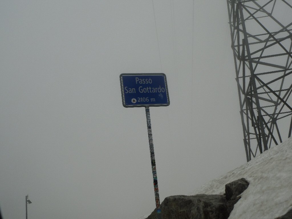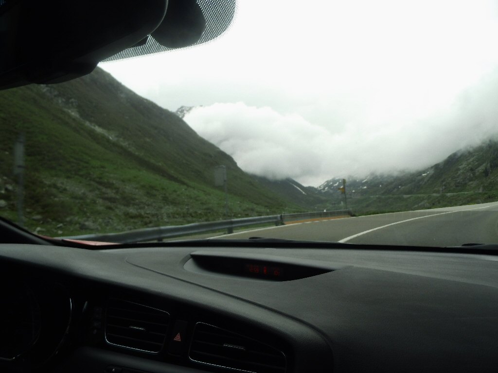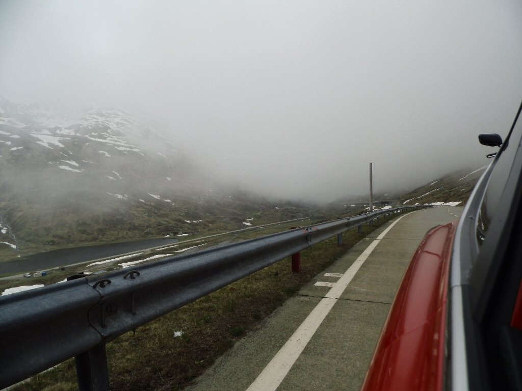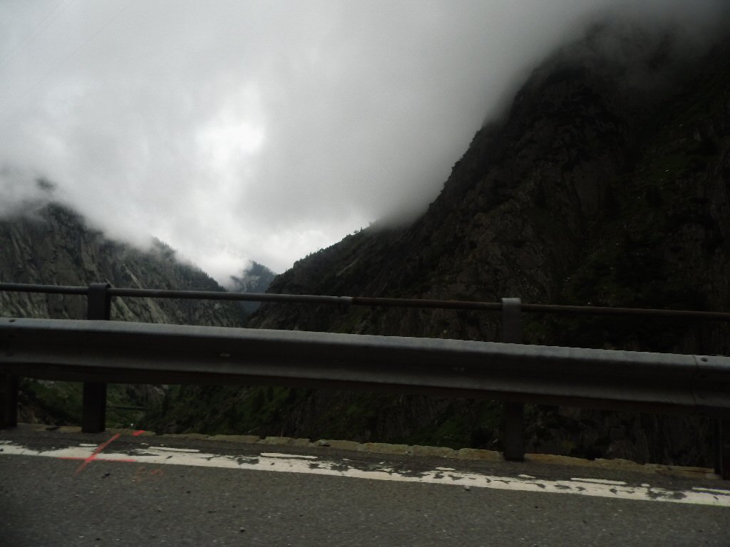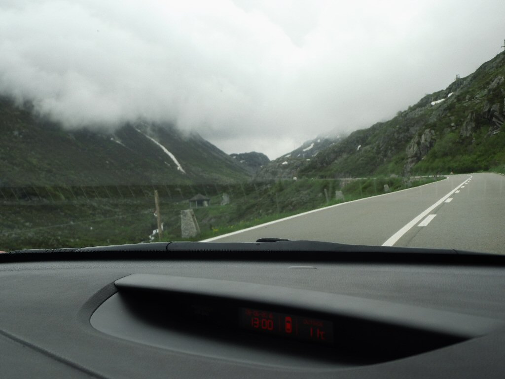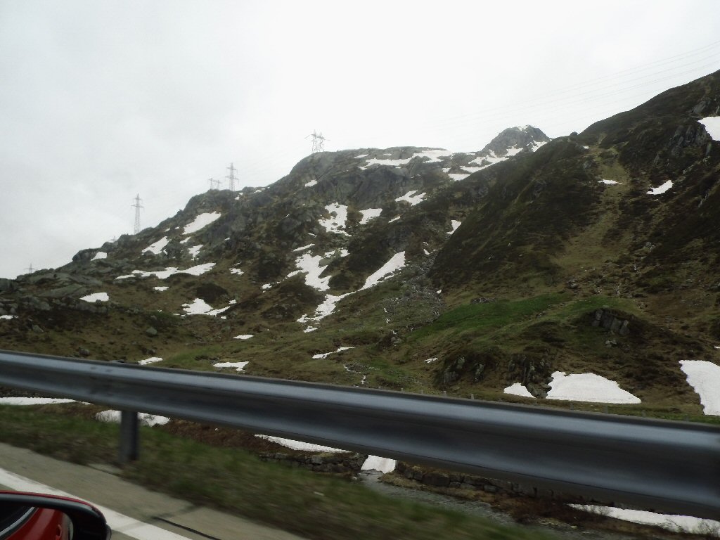 De eerste stop regent het nog in Zwitserland nog een eindje van de Gotthardtunnel/ pass. We kijken even. En besluiten om de pas te nemen. Even genieten ondanks de regen. We gaan over de Gothardpass. Het kost ons een half uur omrijden. Maar als we het uitzicht zien en de sneeuw zien is het ’t waard. Boven op de St. Gotthard is het 10 graden en we staan op een hoogte van 2106 m. Stuk verder stappen we uit om nog foto’s van het dal te maken. Het waait zo hard dat Mels zijn petje wegvliegt. Het petje wat hij van Frank heeft gekregen. Maar gelukkig het ligt nog zo dat Toos door de vangrail kruipt en het petje kan pakken. Verder de berg omlaag.