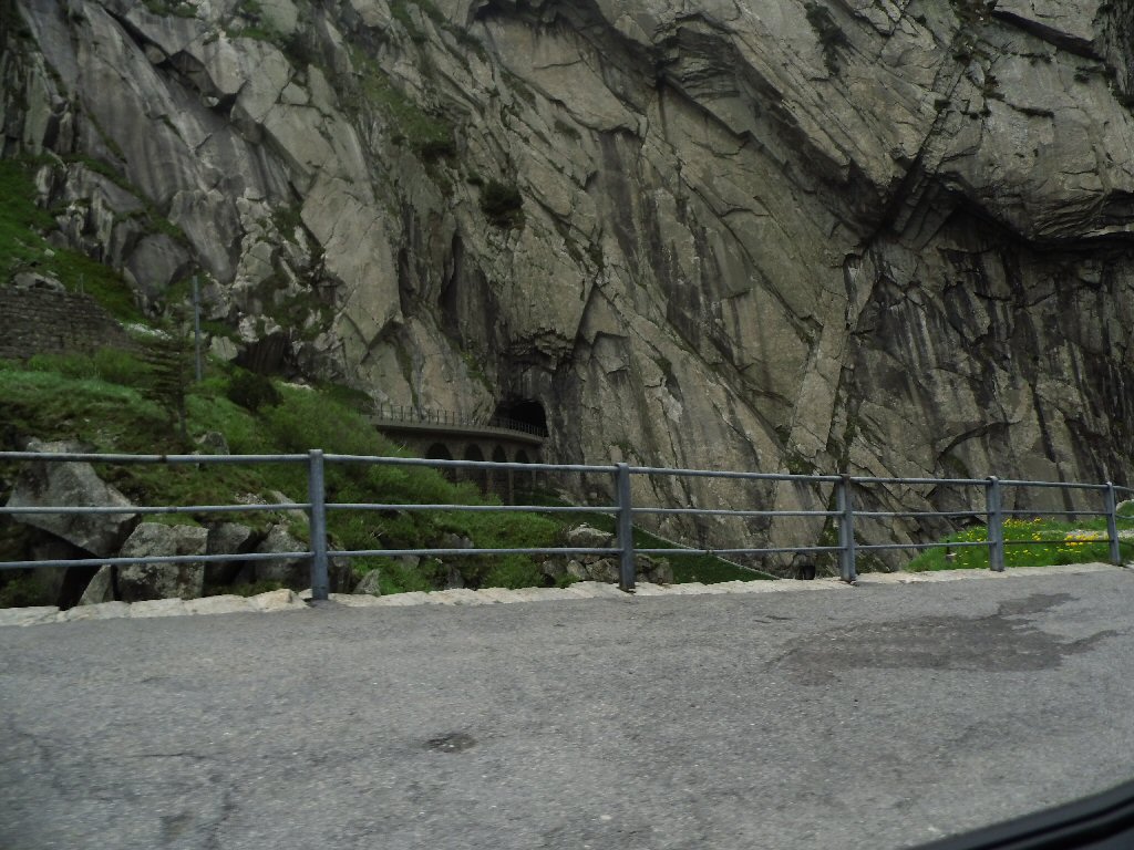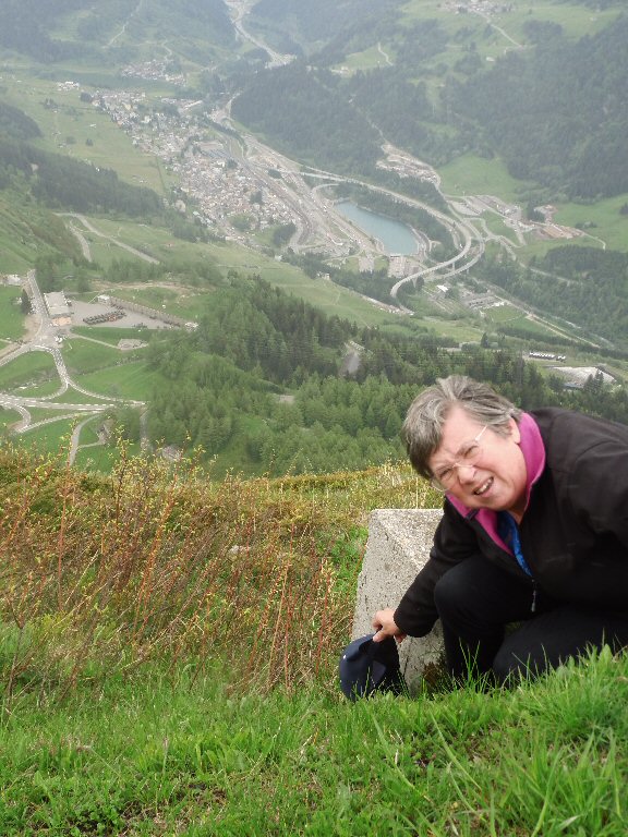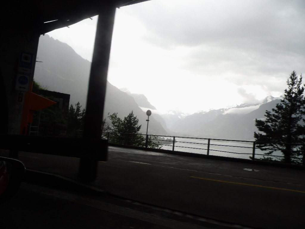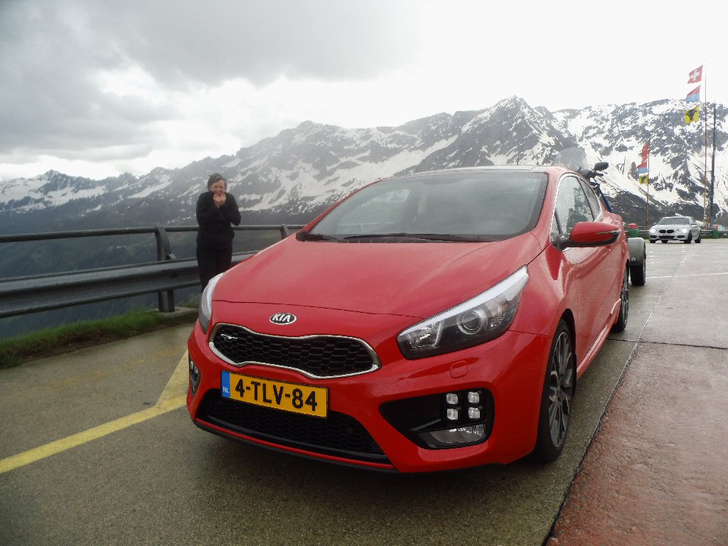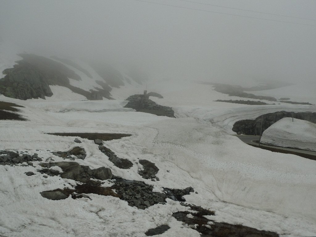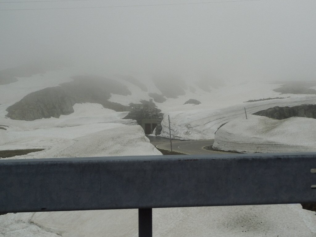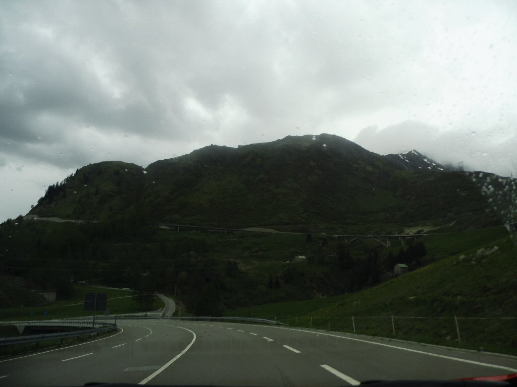 De eerste stop regent het nog in Zwitserland nog een eindje van de Gotthardtunnel/ pass. We kijken even. En besluiten om de pas te nemen. Even genieten ondanks de regen. We gaan over de Gothardpass. Het kost ons een half uur omrijden. Maar als we het uitzicht zien en de sneeuw zien is het ’t waard. Boven op de St. Gotthard is het 10 graden en we staan op een hoogte van 2106 m. Stuk verder stappen we uit om nog foto’s van het dal te maken. Het waait zo hard dat Mels zijn petje wegvliegt. Het petje wat hij van Frank heeft gekregen. Maar gelukkig het ligt nog zo dat Toos door de vangrail kruipt en het petje kan pakken. Verder de berg omlaag.