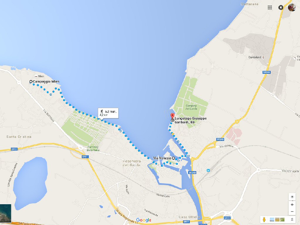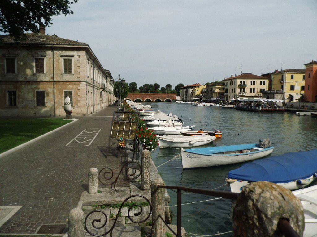 Om ongeveer 15:00 uur willen we er toch even uit. We besluiten om nu toch maar naar Peschiera te lopen. De overburen Oostenrijkers vertellen ons dat het ongeveer 3 kilometer is. We hebben tijd genoeg. We lopen langs het Garda meer. In Peschiera aangekomen lopen we langs de havens. Dan terug en een stukje binnenstad. We kopen nog iets te drinken want van zo’n wandeling krijg je dorst.