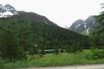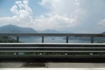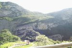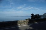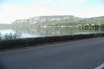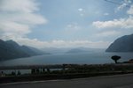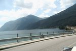 We rijden rustig verder. Het ene mooie uitzicht na het andere. Dan komen we bij een plaatsje waar we recht en links af kunnen. Mels wil rechts afslaan. Zo geeft de navigatie aan. Maar aan de overkant van de weg staat een Nederlander die ons vertelt dat de weg een eindje verder is afgesloten. Er liggen grote rotsblokken op de weg. Toch even kijken hoever we komen. Als we een stukje hebben gereden is daar de wegafzetting en er staan enkele motorrijders. Na een pauze keren we en rijden terug. We zouden helemaal om het meer rijden waar we zijn. Maar door de rotsblokken kan dit niet.