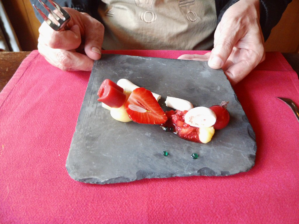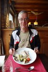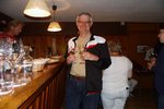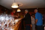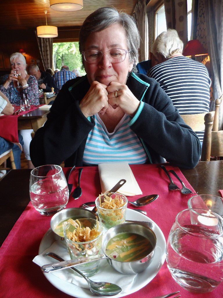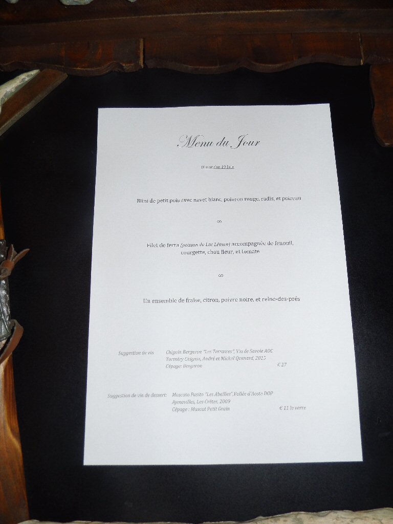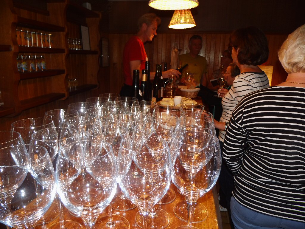 Het is in de bar, de ruimte langs de tv ruimte. We mogen 7 wijnen proeven met tussendoor kaasjes, 2 soorten mosterd en met brood. Water om het glas even te spoelen en de mond spoelen. Er waren lekkere wijnen bij. Even voor zes uur zijn we klaar. We kunnen zo weer aan de tafel aanschuiven. We krijgen weer een amuse, bord met groenten, vis met groenten en op een lei het nagerecht.