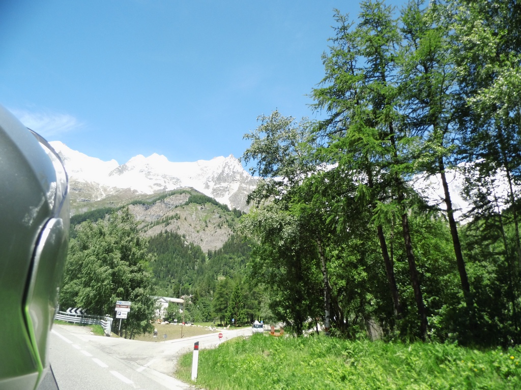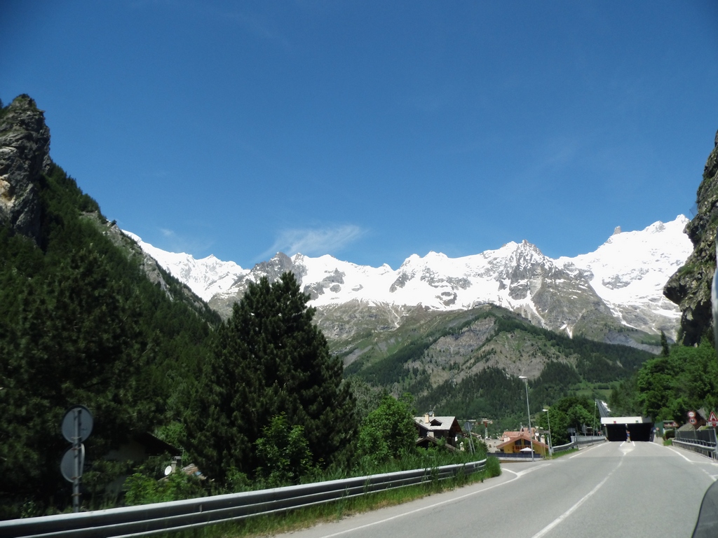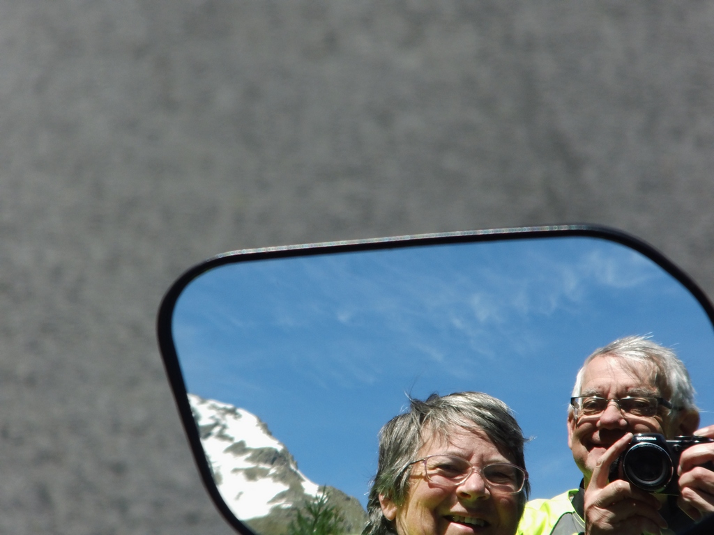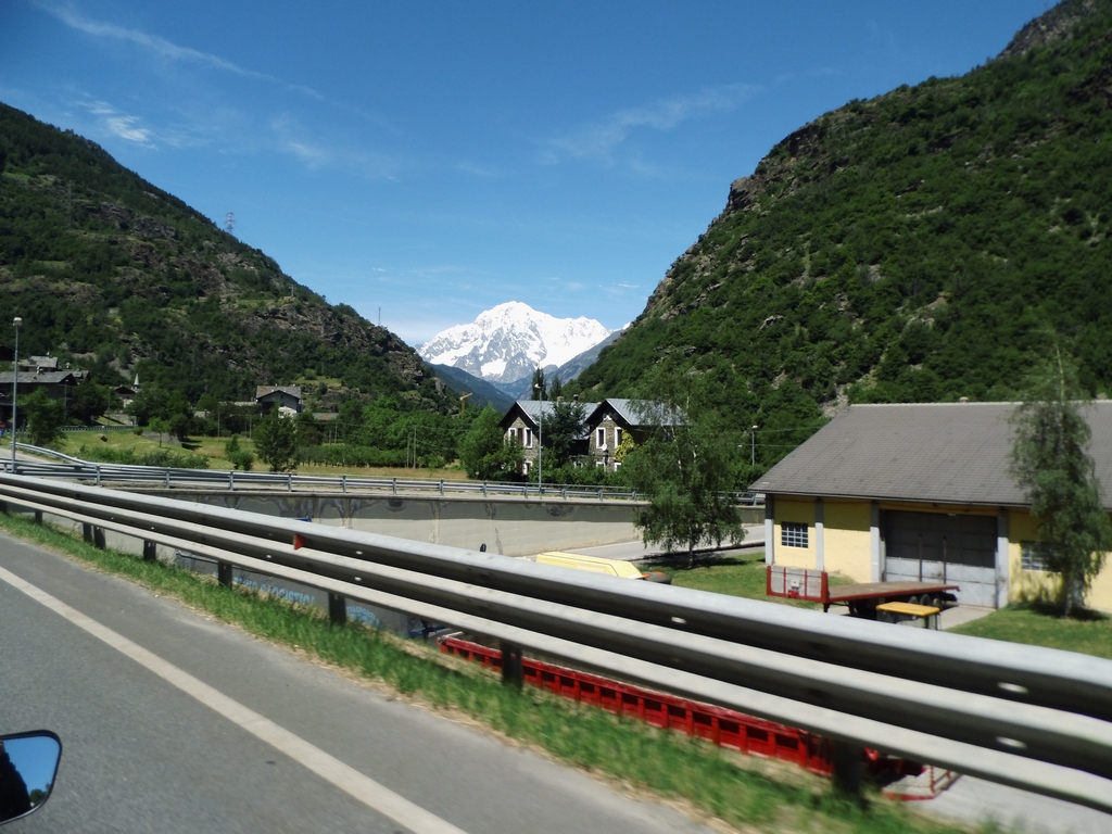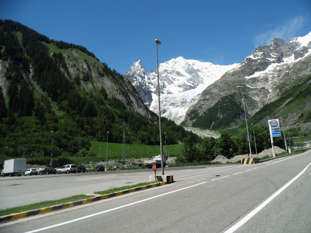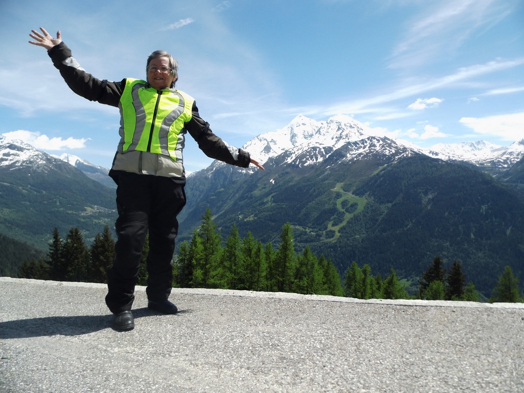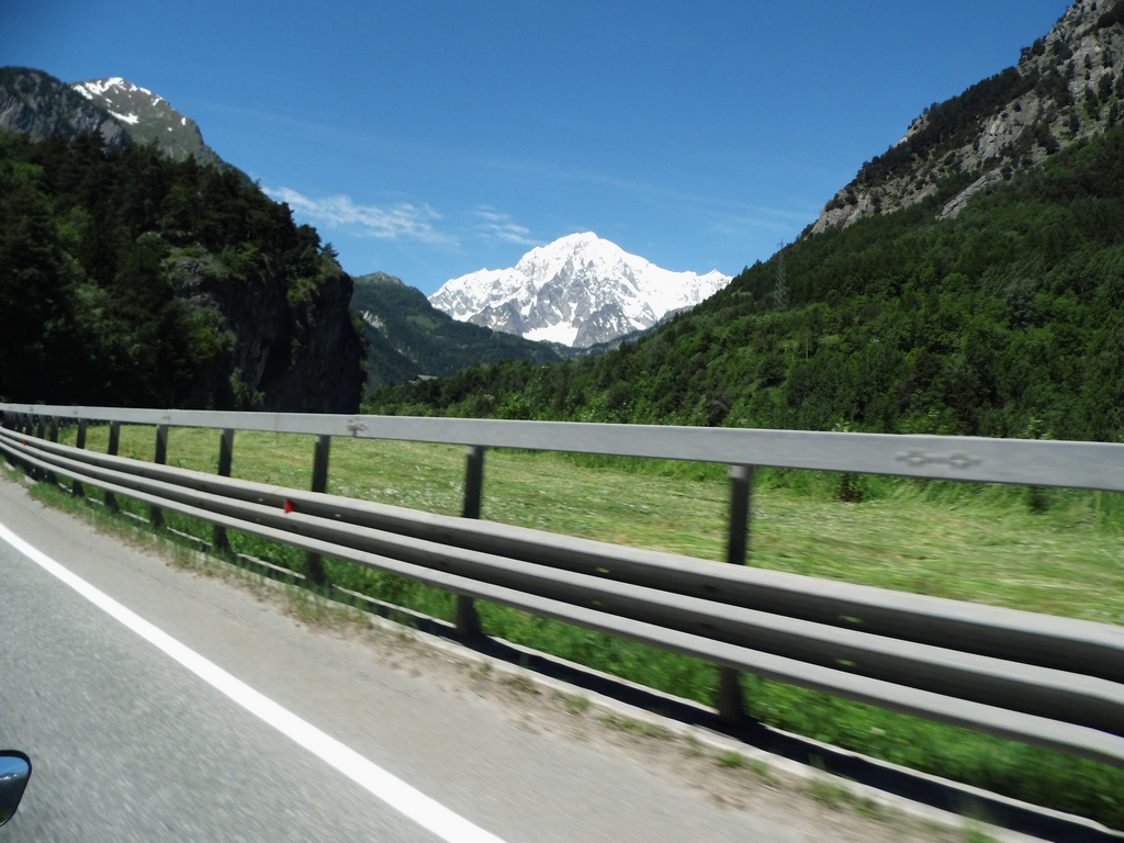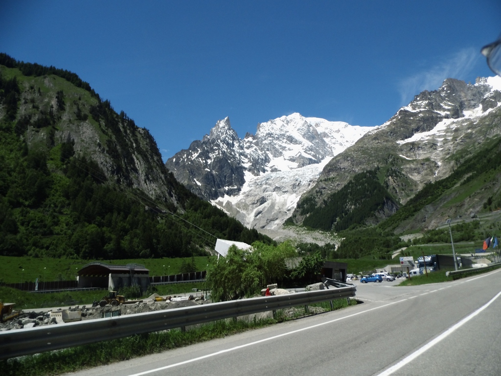 Dan rijden we weer omlaag. Op een plek staat panorama. Even stoppen. Het is inderdaad een heel mooi panorama. Natuurlijk weer veel foto’s maken. Het weer is goed wat willen we nog mee. We kunnen foto’s blijven maken. We rijden lekker door. Dan zien we richting Mont Blanc. Eens kijken hoever we komen. De top hiervan is 4809 meter hoog. Maar zo hoog kunnen we niet komen. We komen een heel stuk met de motor. Maar dan kun je met een lift omhoog. Dat doen we deze keer niet. Dan maar rustig de weg terug en weer verder met de route.