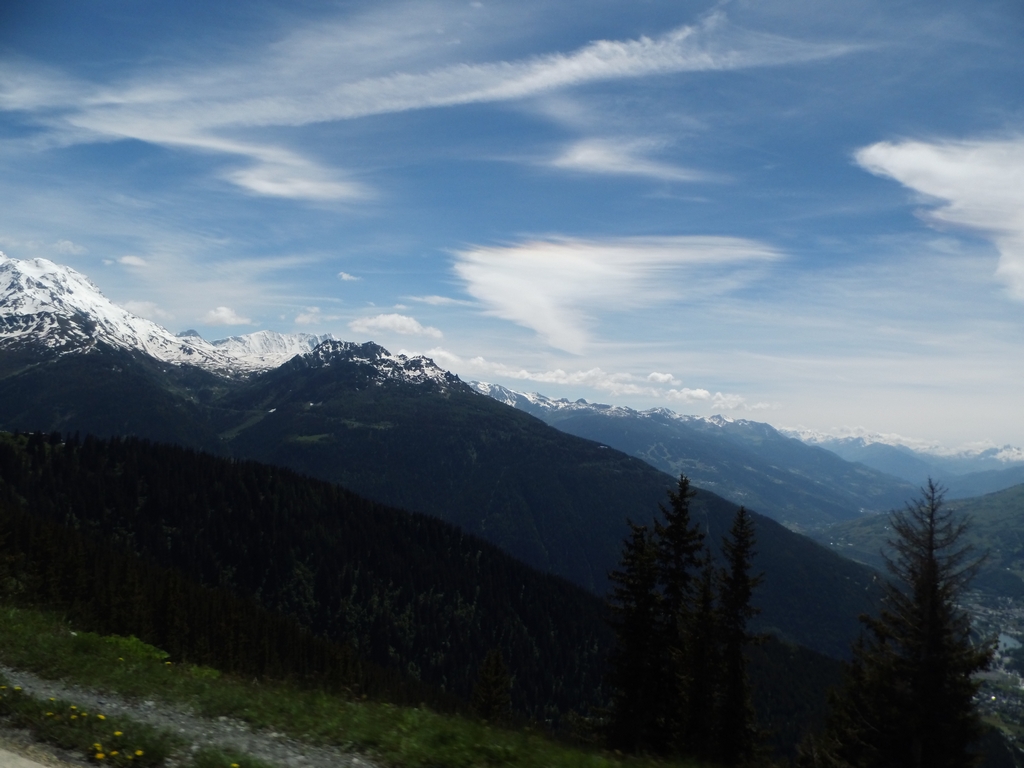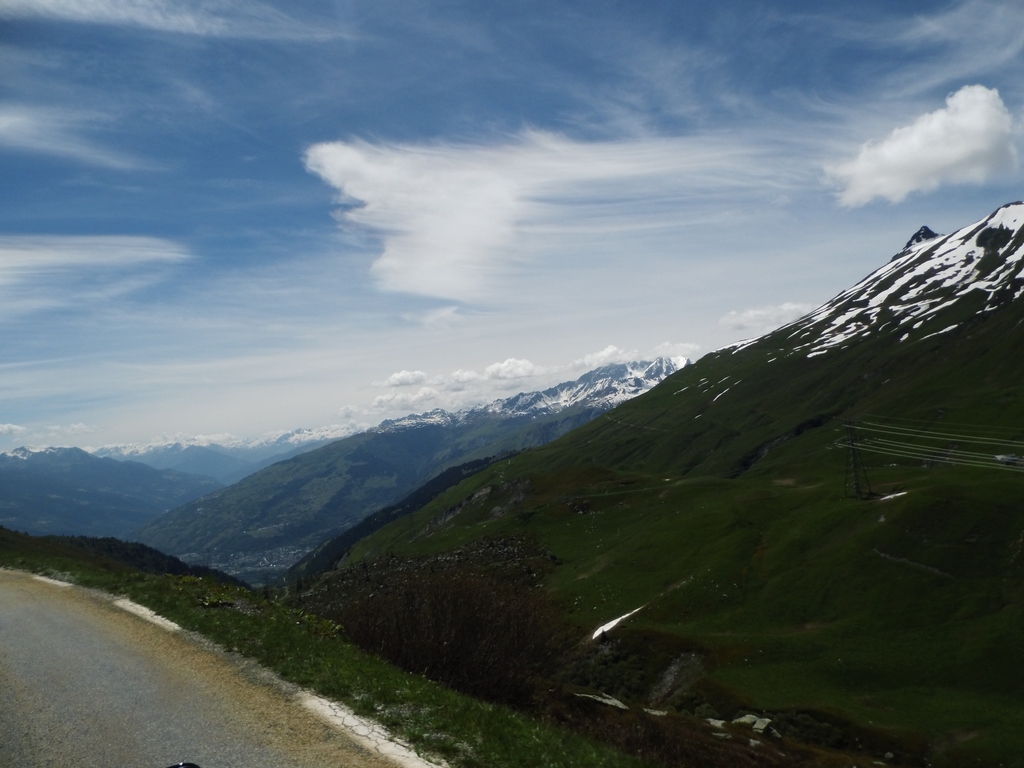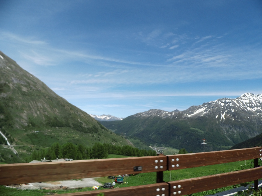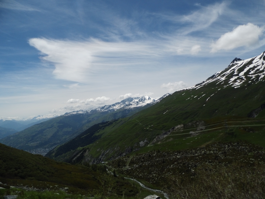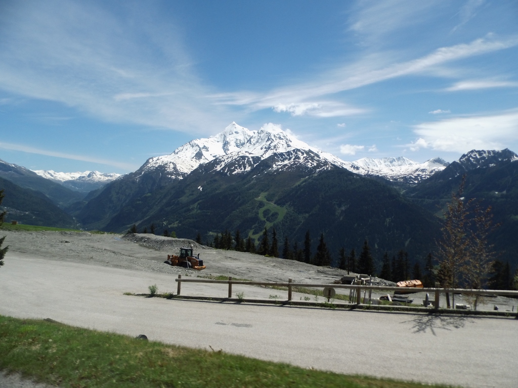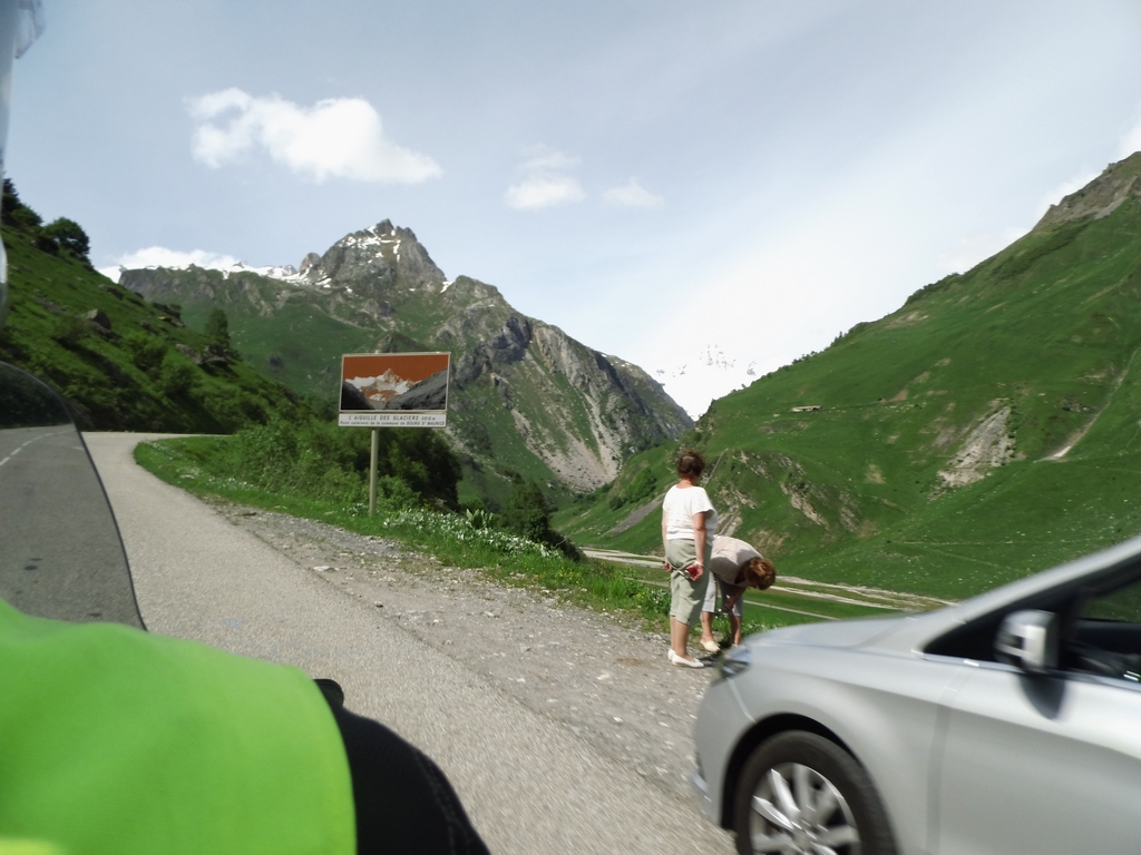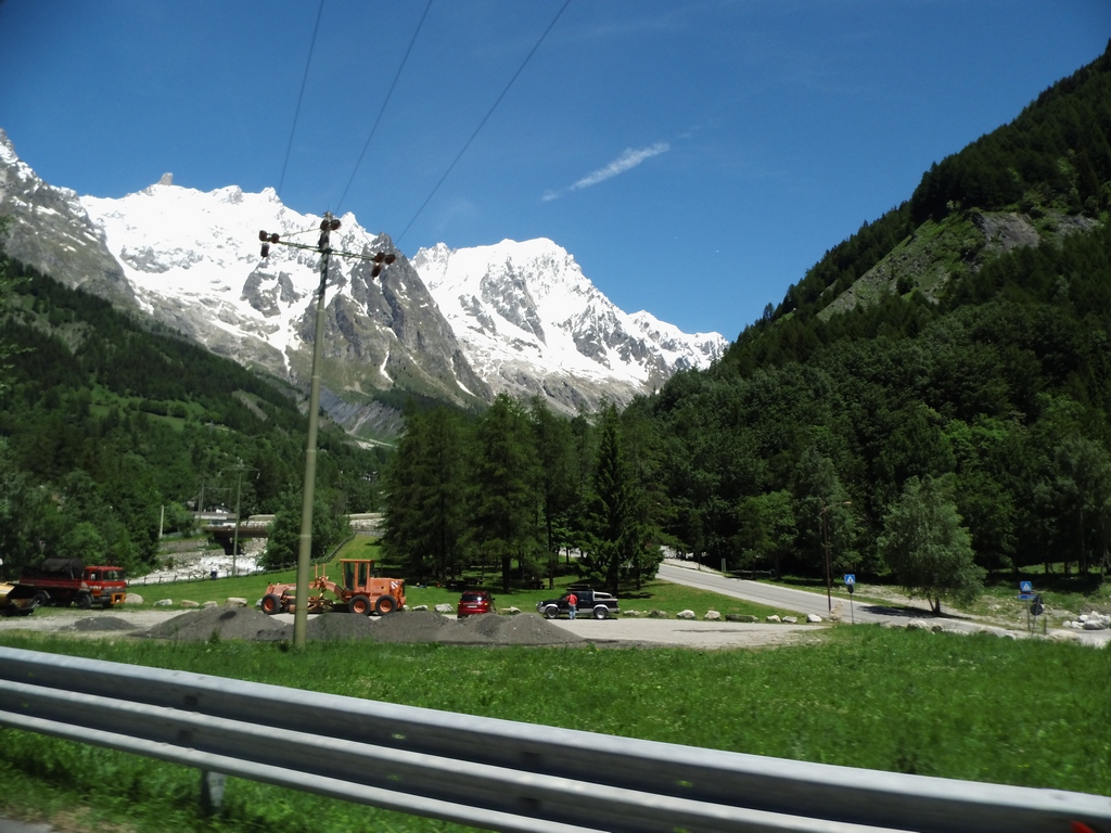 Dan rijden we weer omlaag. Op een plek staat panorama. Even stoppen. Het is inderdaad een heel mooi panorama. Natuurlijk weer veel foto’s maken. Het weer is goed wat willen we nog mee. We kunnen foto’s blijven maken. We rijden lekker door. Dan zien we richting Mont Blanc. Eens kijken hoever we komen. De top hiervan is 4809 meter hoog. Maar zo hoog kunnen we niet komen. We komen een heel stuk met de motor. Maar dan kun je met een lift omhoog. Dat doen we deze keer niet. Dan maar rustig de weg terug en weer verder met de route.