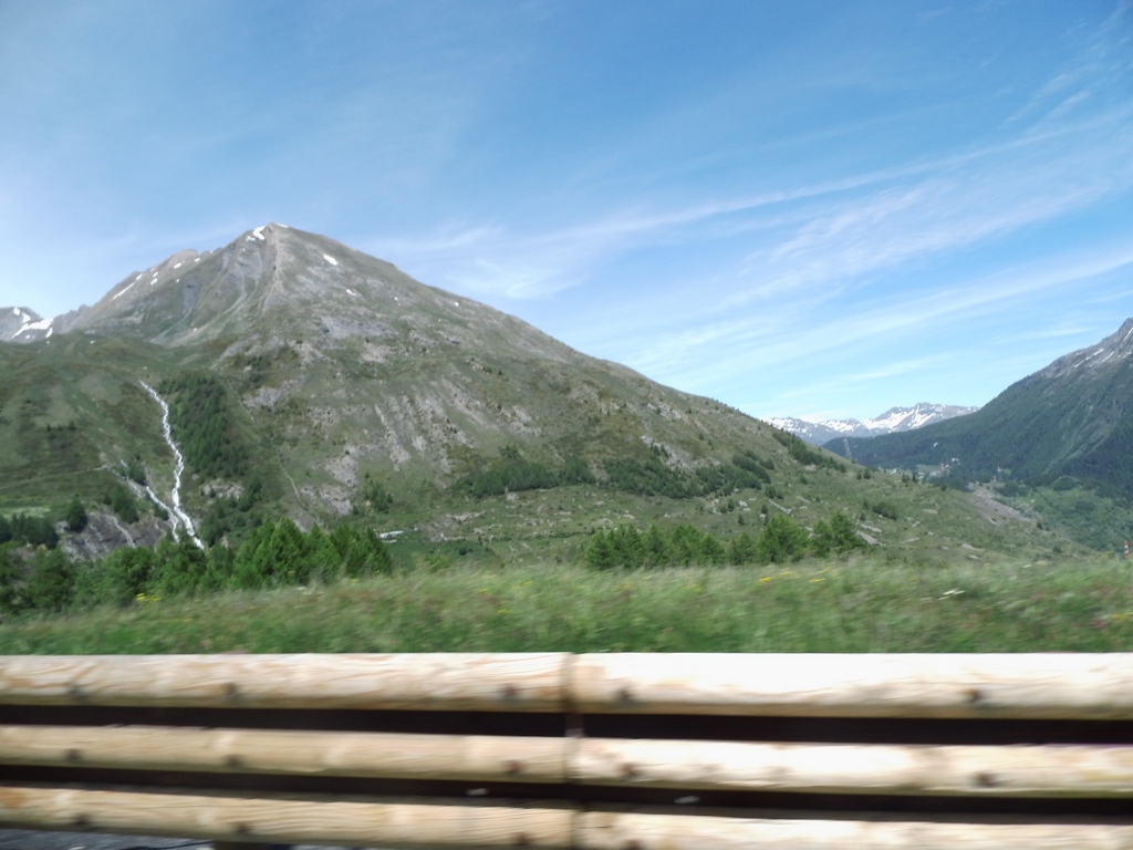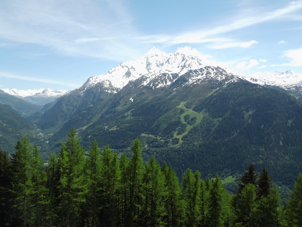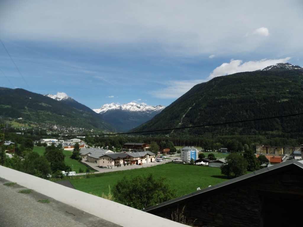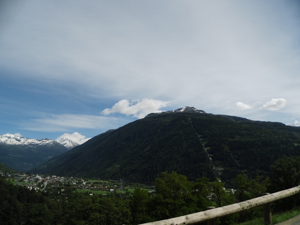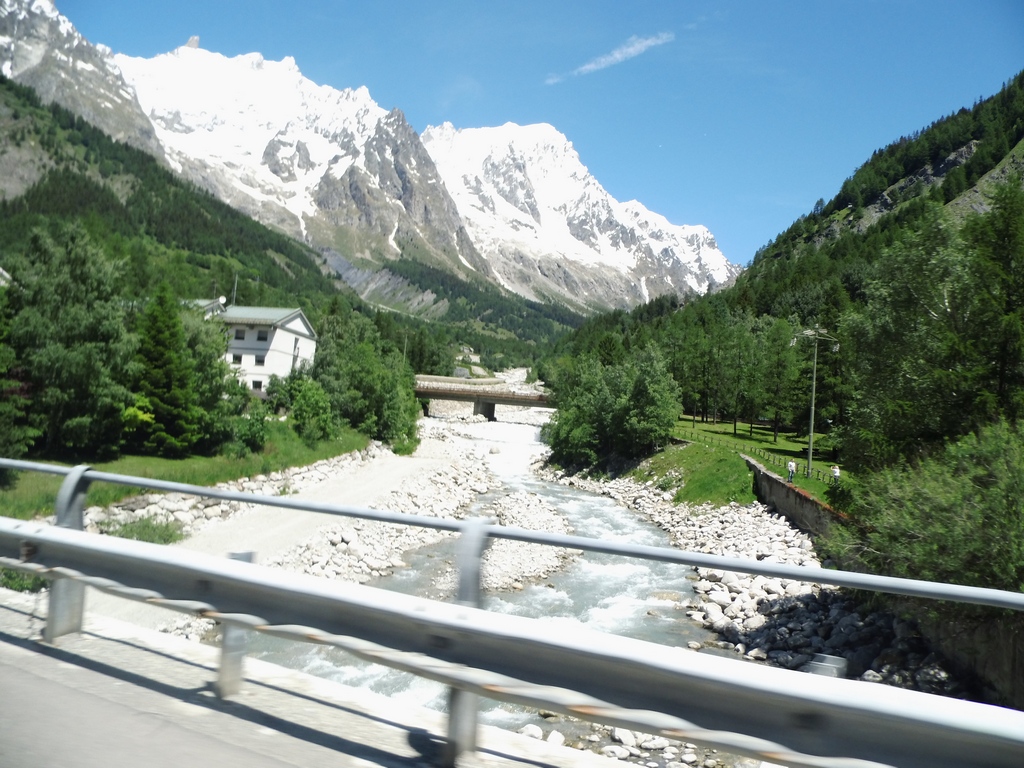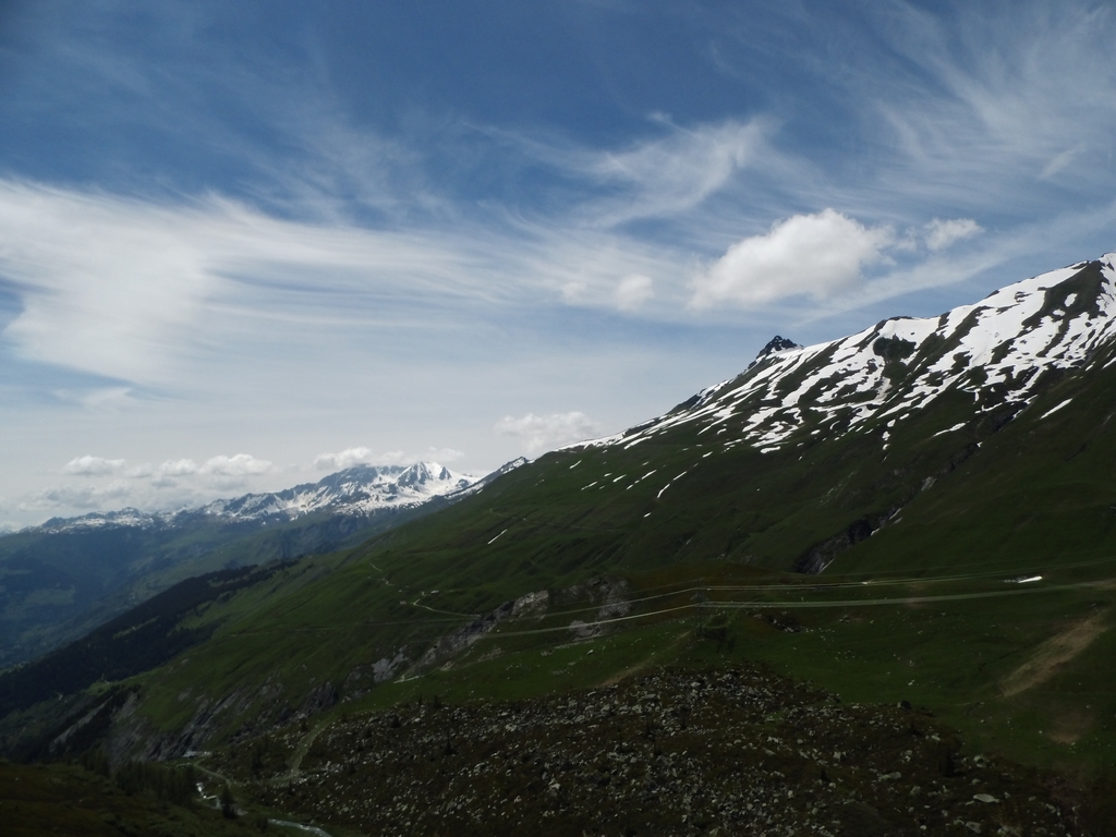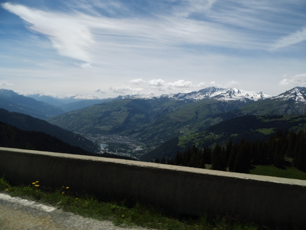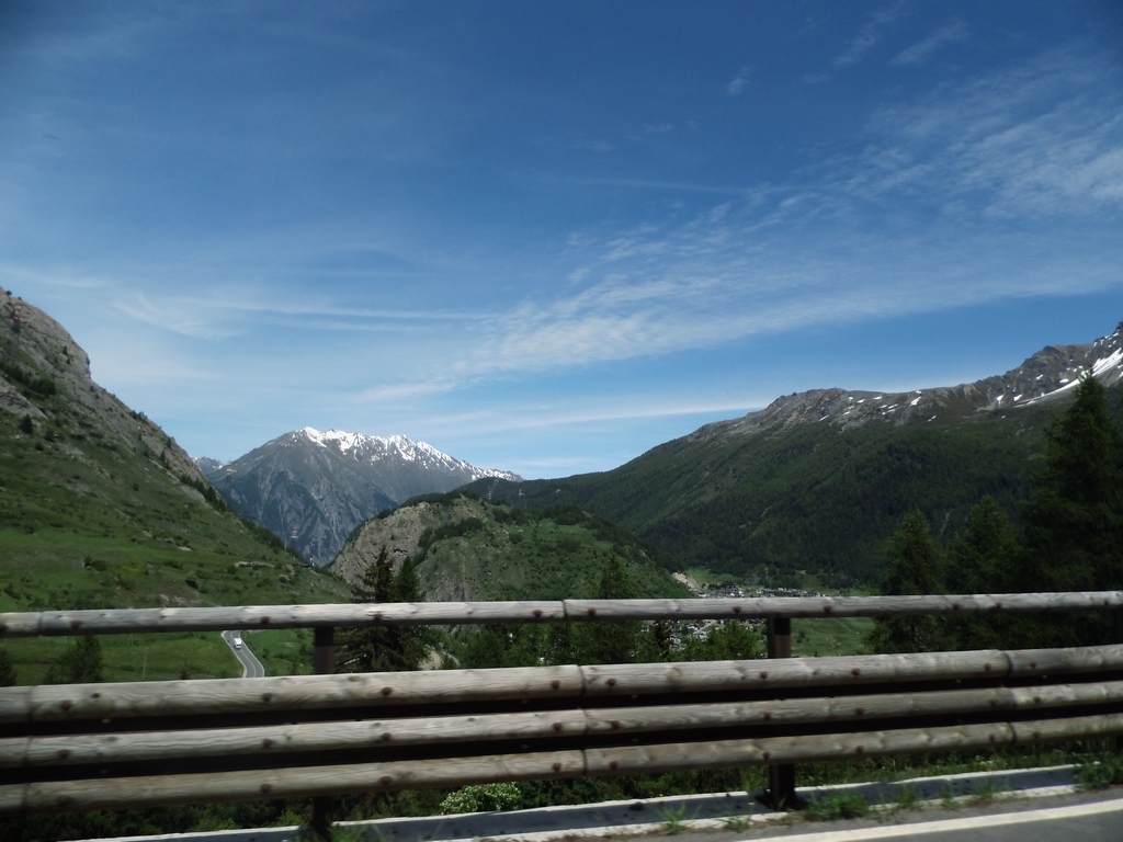 Dan rijden we weer omlaag. Op een plek staat panorama. Even stoppen. Het is inderdaad een heel mooi panorama. Natuurlijk weer veel foto’s maken. Het weer is goed wat willen we nog mee. We kunnen foto’s blijven maken. We rijden lekker door. Dan zien we richting Mont Blanc. Eens kijken hoever we komen. De top hiervan is 4809 meter hoog. Maar zo hoog kunnen we niet komen. We komen een heel stuk met de motor. Maar dan kun je met een lift omhoog. Dat doen we deze keer niet. Dan maar rustig de weg terug en weer verder met de route.