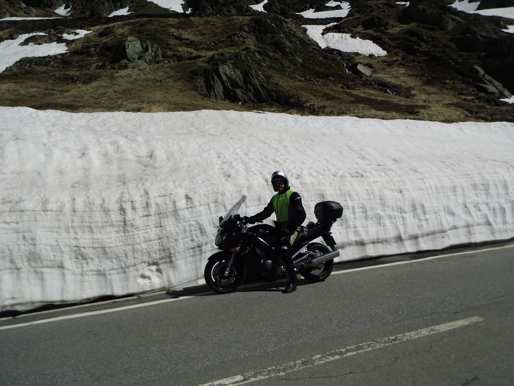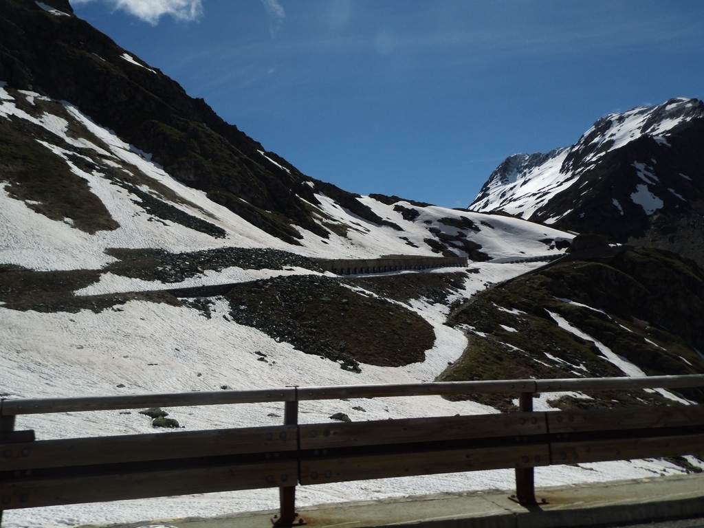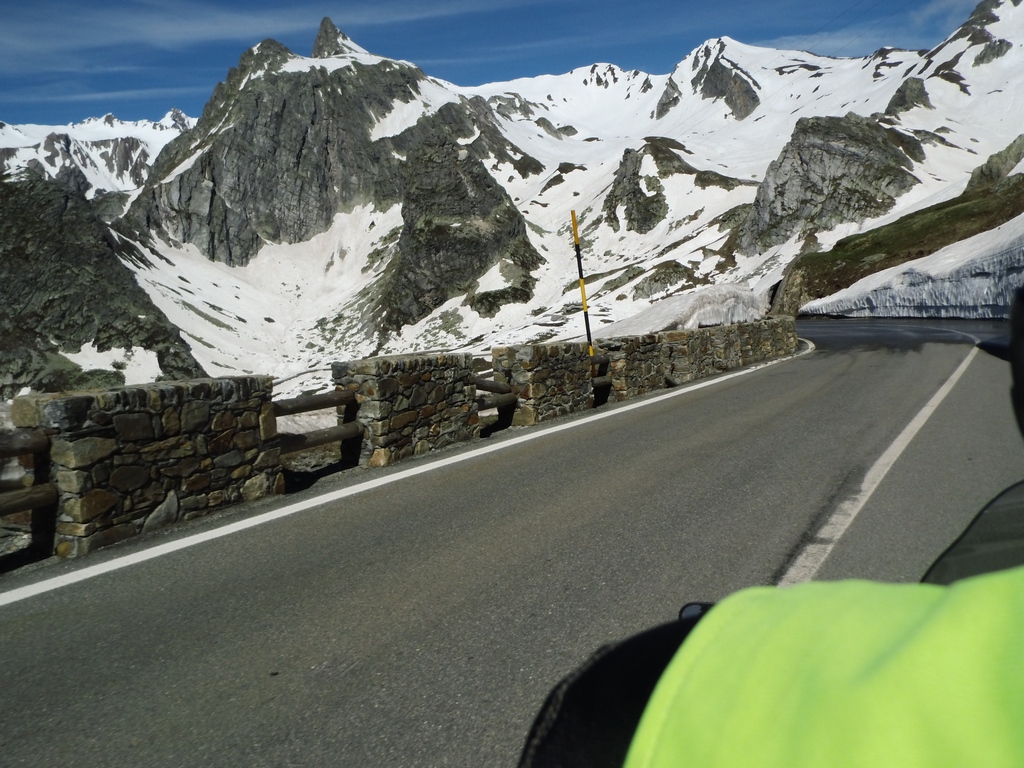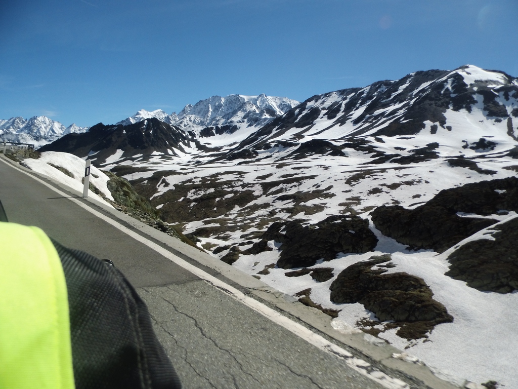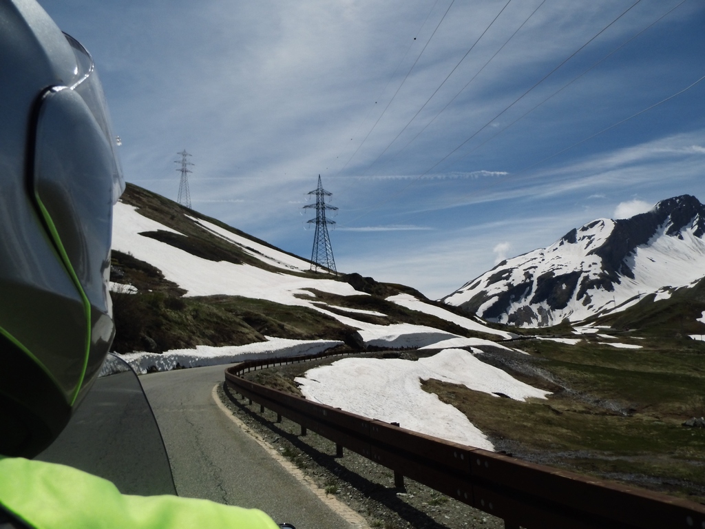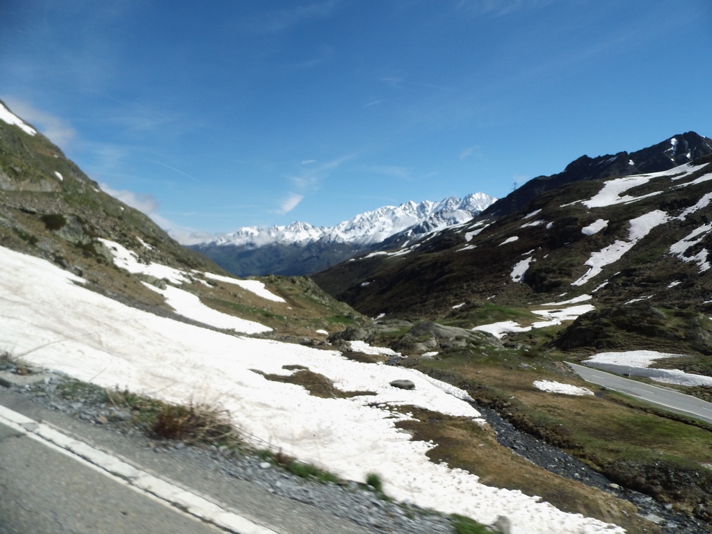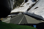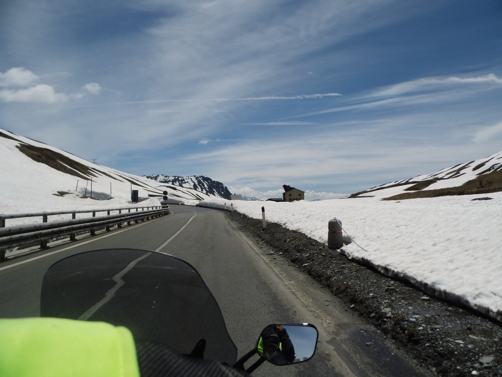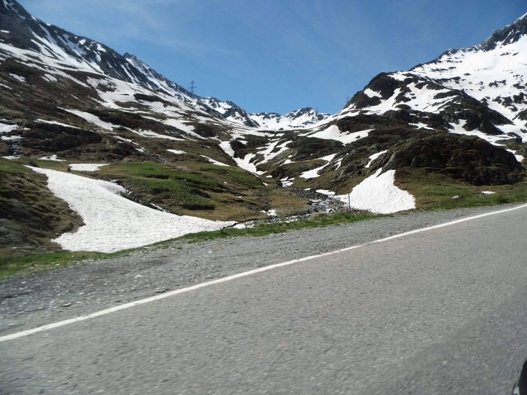 Na even zoeken komen we bij de San Bernardino pas. We hebben zaterdag de tunnel gedaan maar nu doen we de pas met de motor. Als we omhoog rijden gaan we de sneeuw en de kou tegemoet 5 graden, met alleen thermoondergoed aan en het textielpak, zonder wintervoering. Als we boven komen rijden we tussen de sneeuw door. Links en rechts van de weg ligt nog veel sneeuw. De top waar we met de motor kunnen rijden is 2066 meter. Het is echt genieten. Mels is hier al 2 keer geweest en ik een keer. Het blijft mooi. We rijden rustig verder.